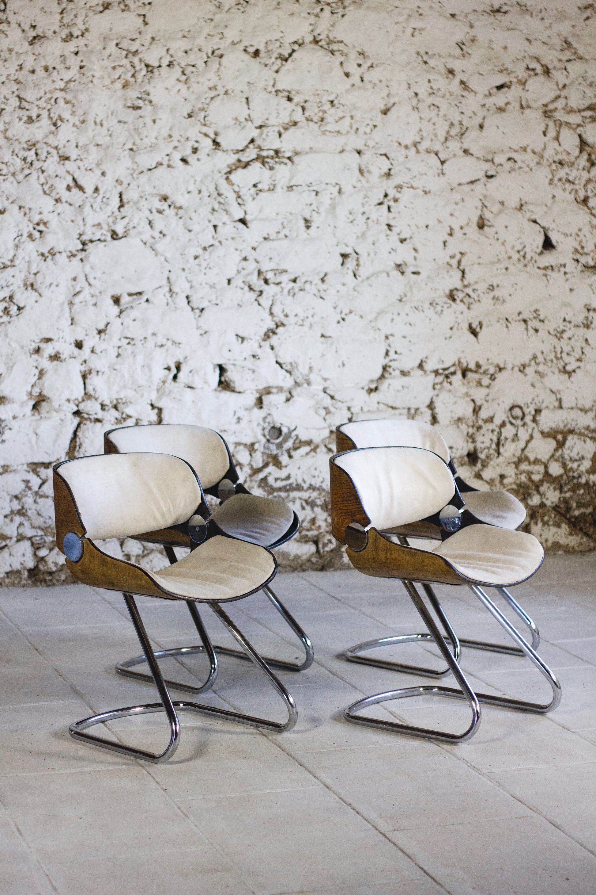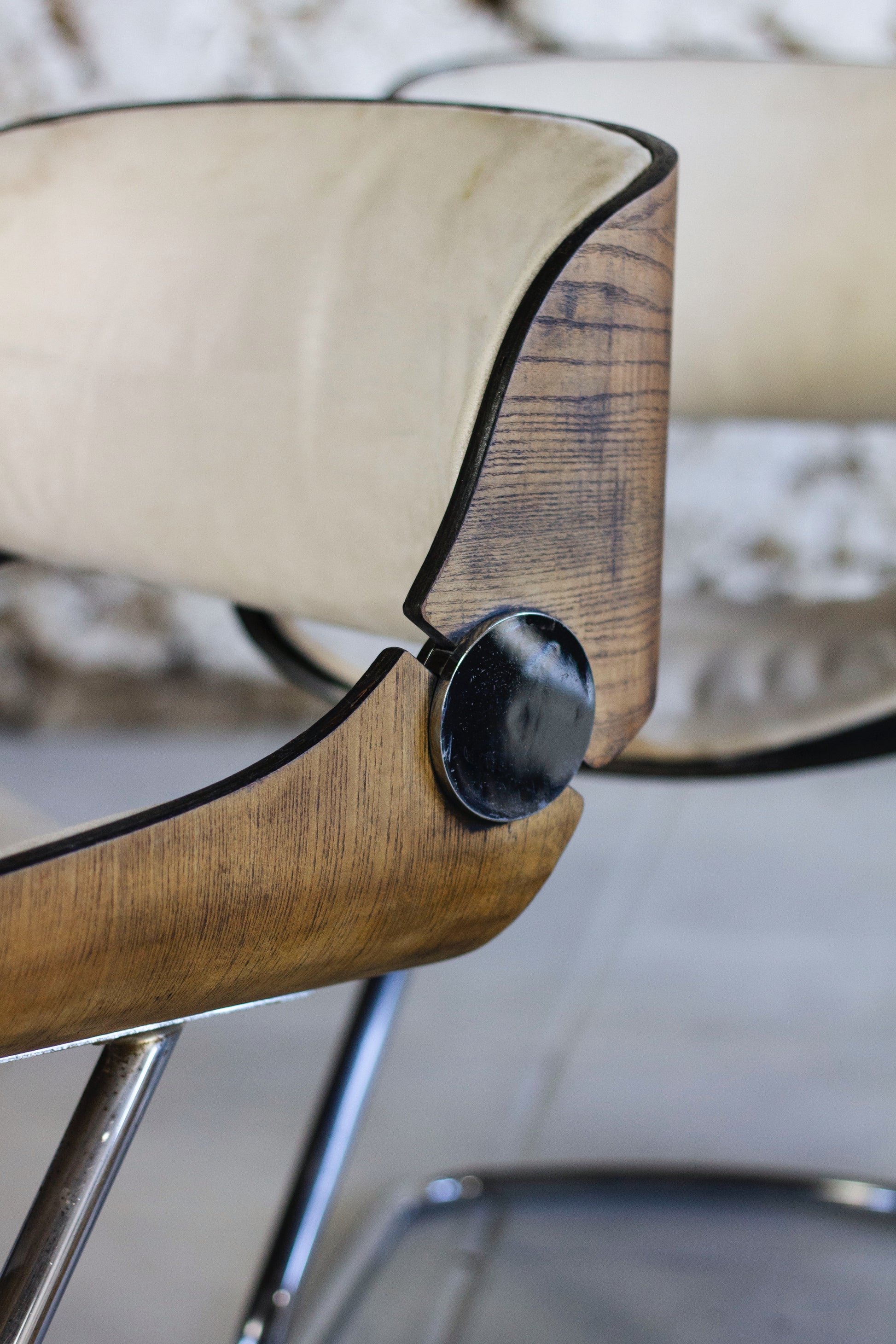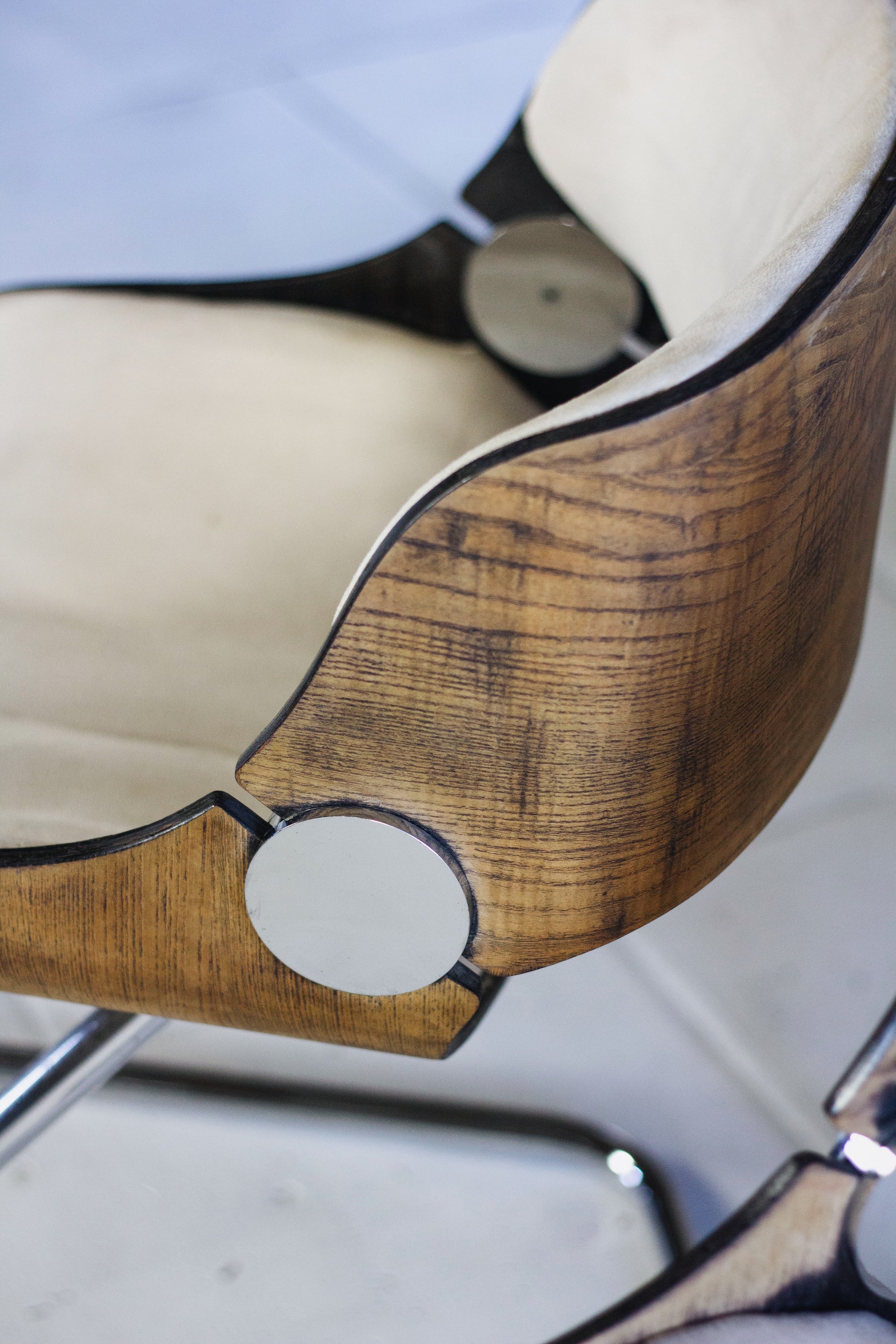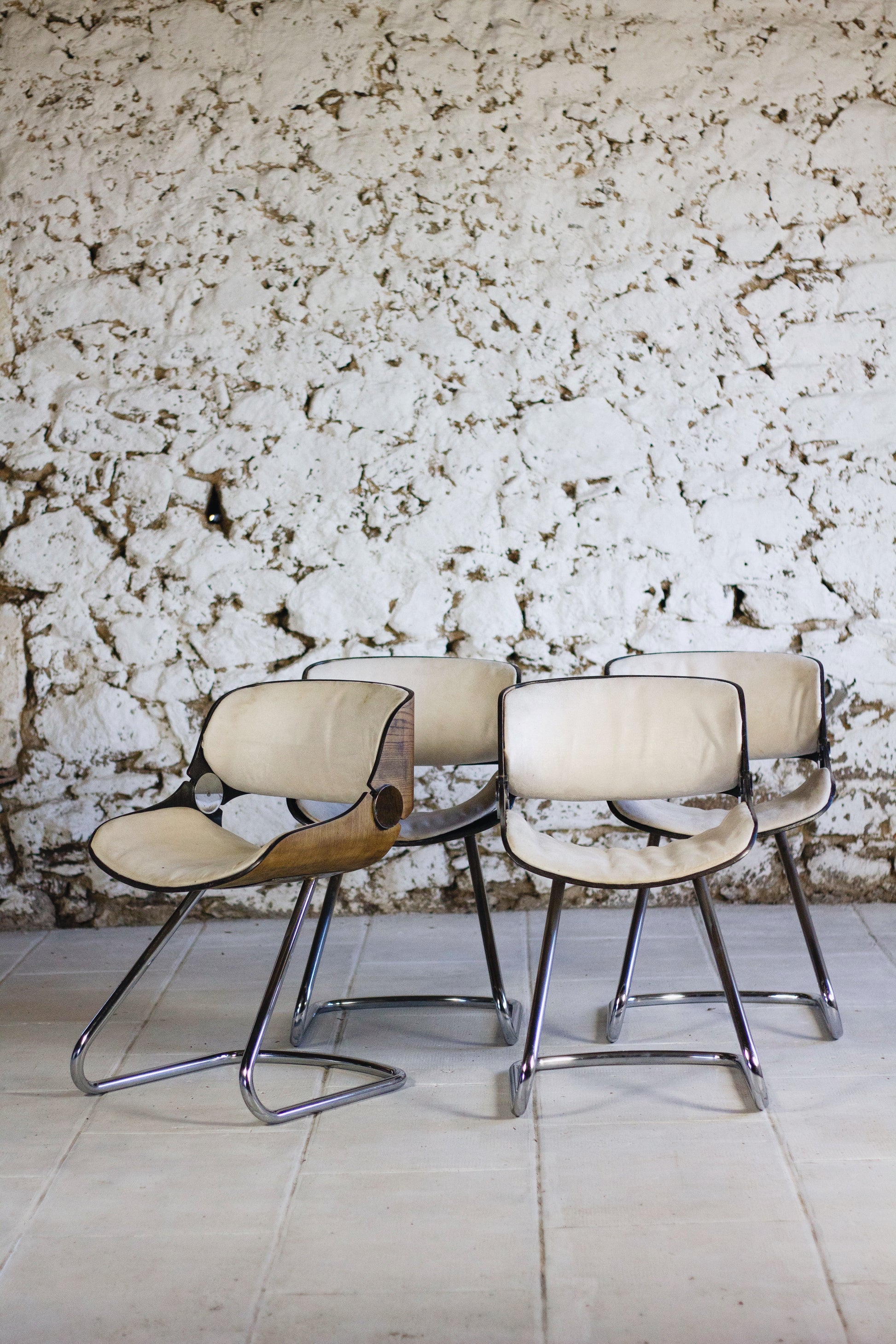 Modèle très rare. Les chaises reposent sur un piétement courbé et chromé. L'assise et le dossier sont réalisées en coque en bois de palissandre et sont raccordées par un disque de chrome. Le tissu est un simili suédine résistant à l'eau.