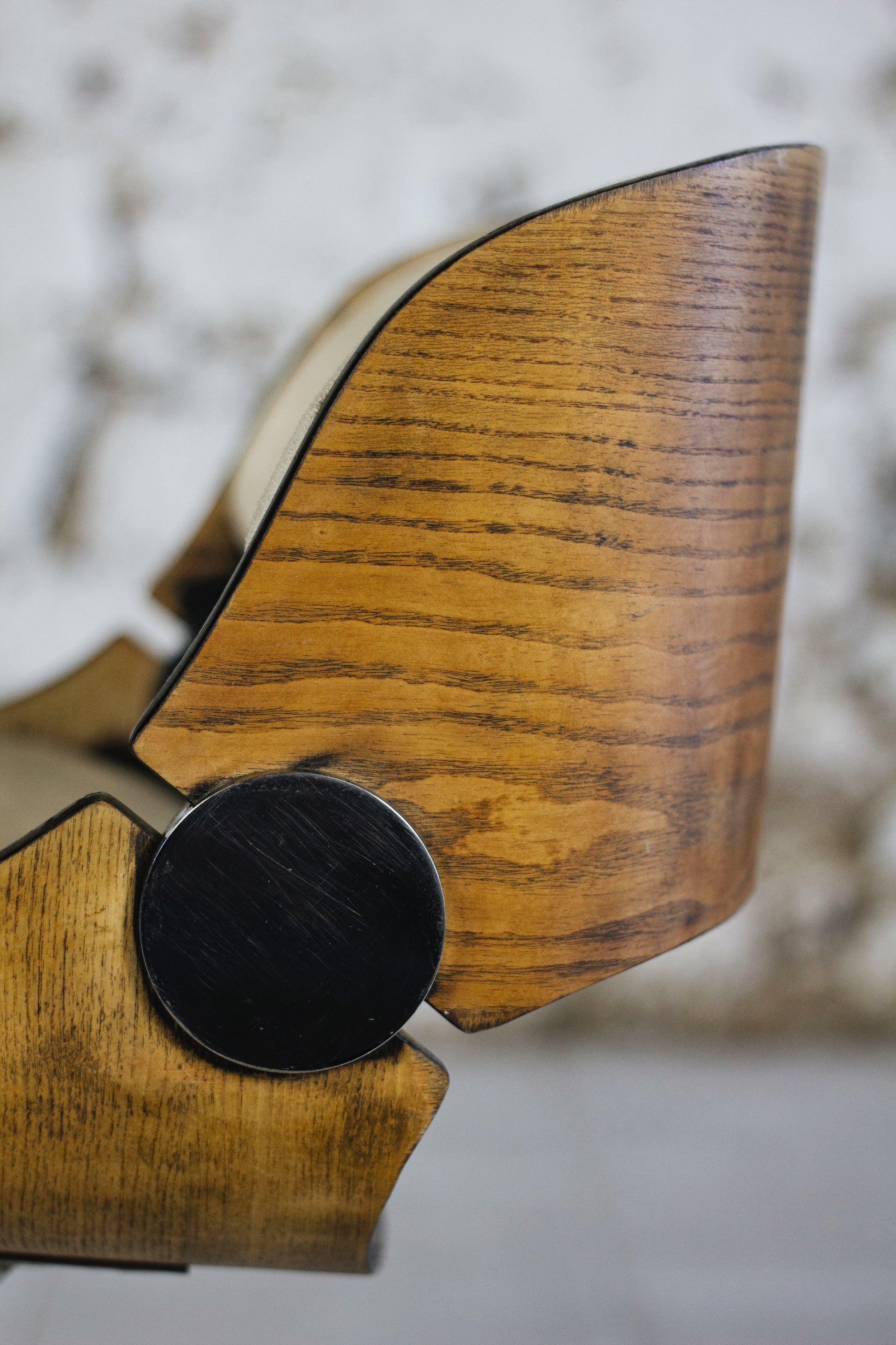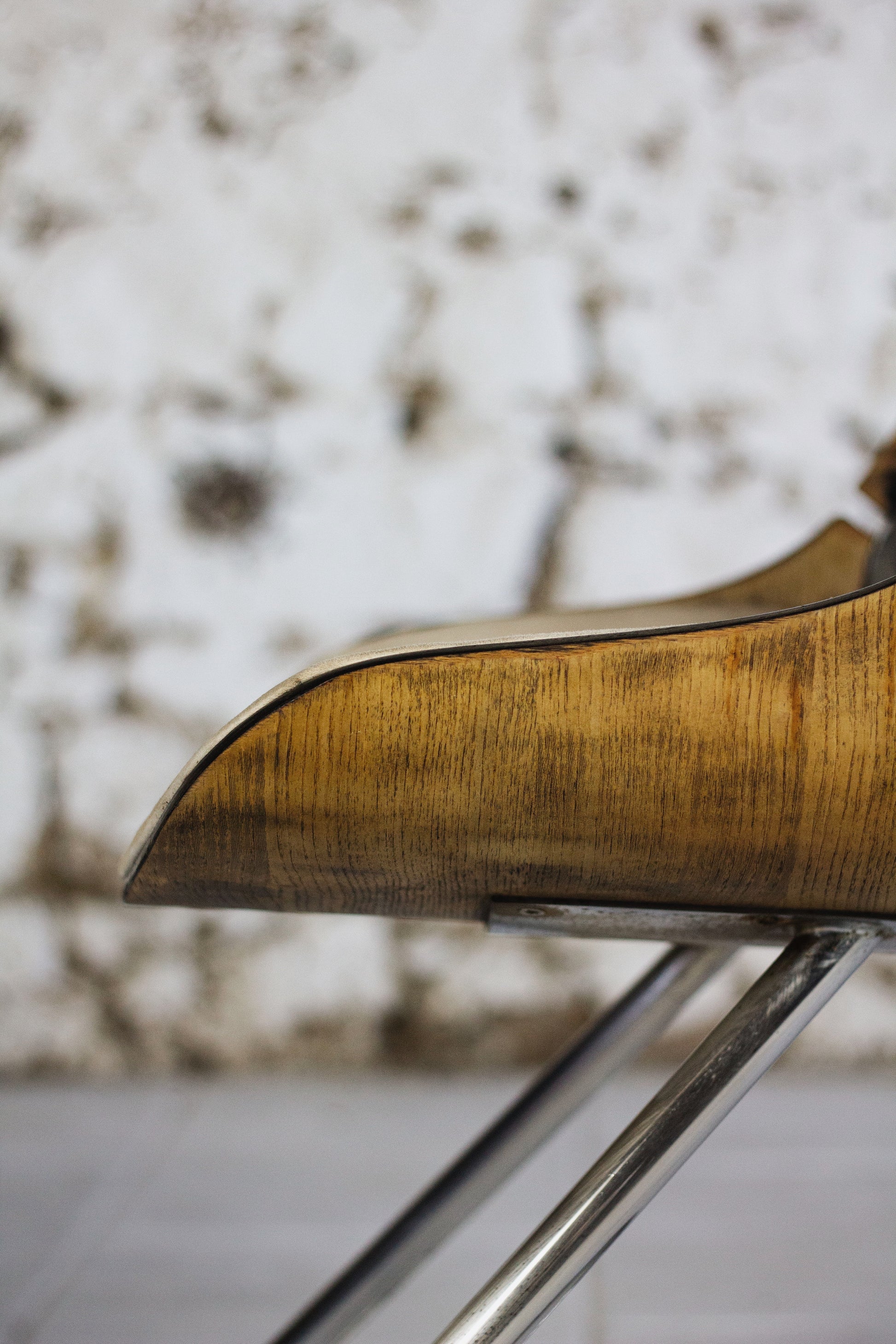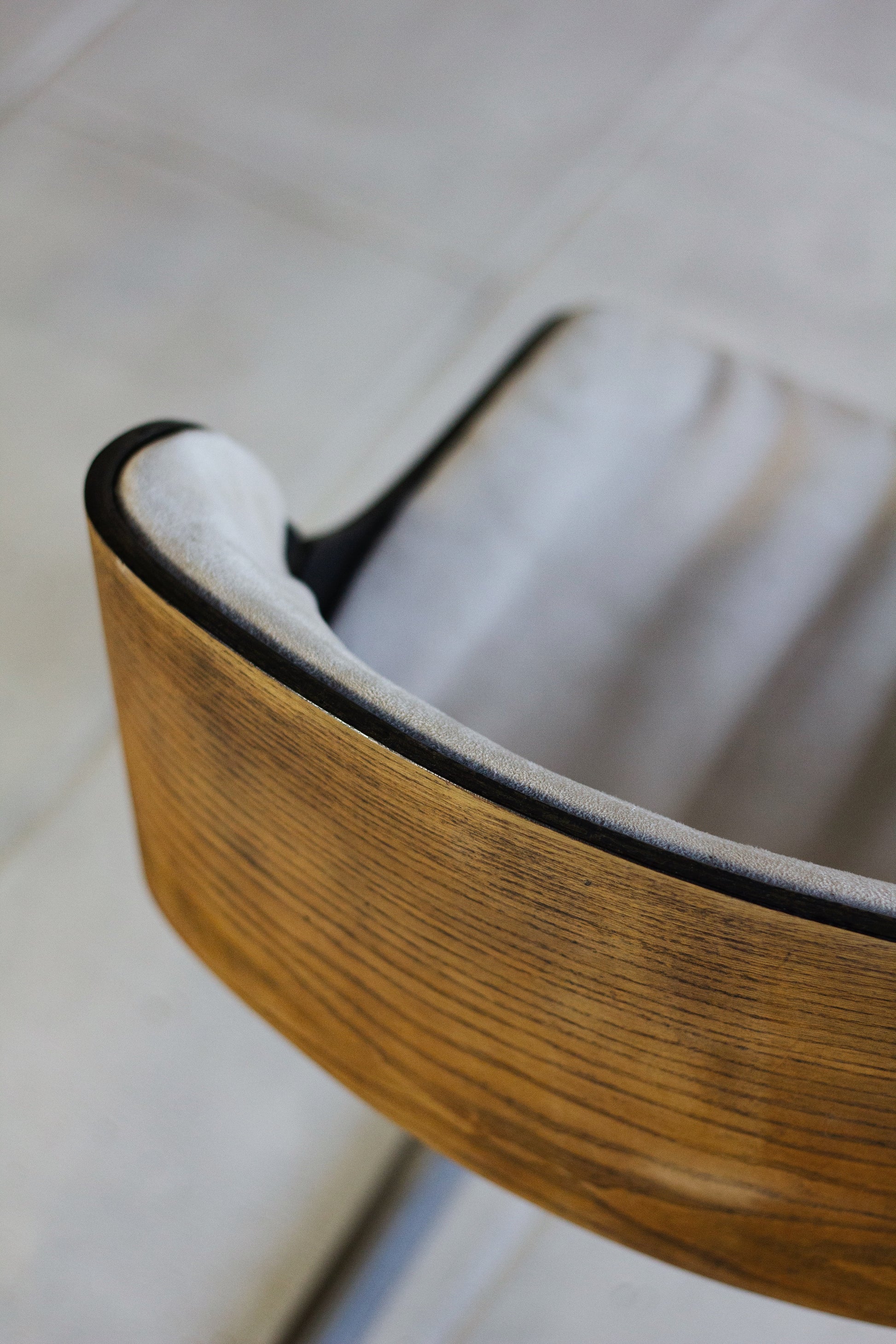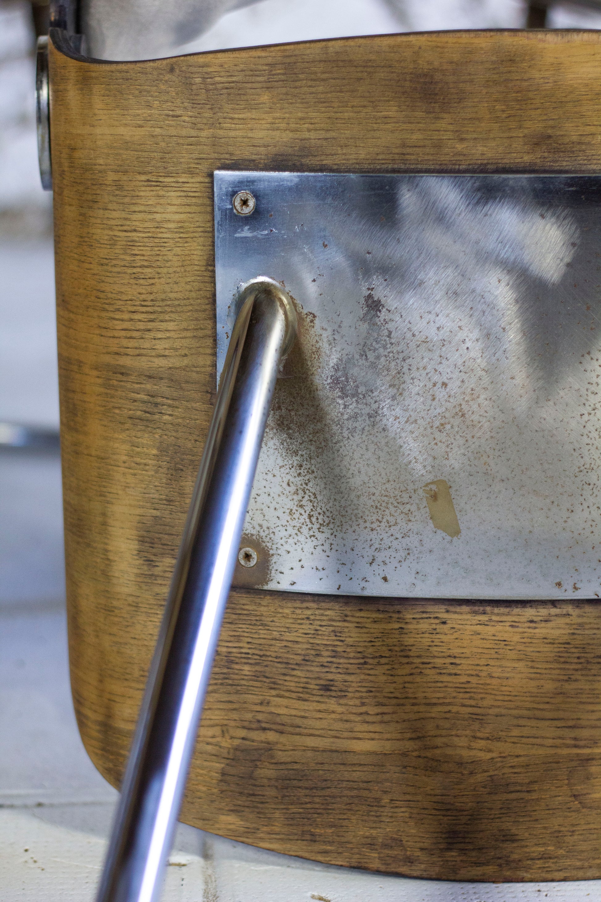 Modèle très rare. Les chaises reposent sur un piétement courbé et chromé. L'assise et le dossier sont réalisées en coque en bois de palissandre et sont raccordées par un disque de chrome. Le tissu est un simili suédine résistant à l'eau.