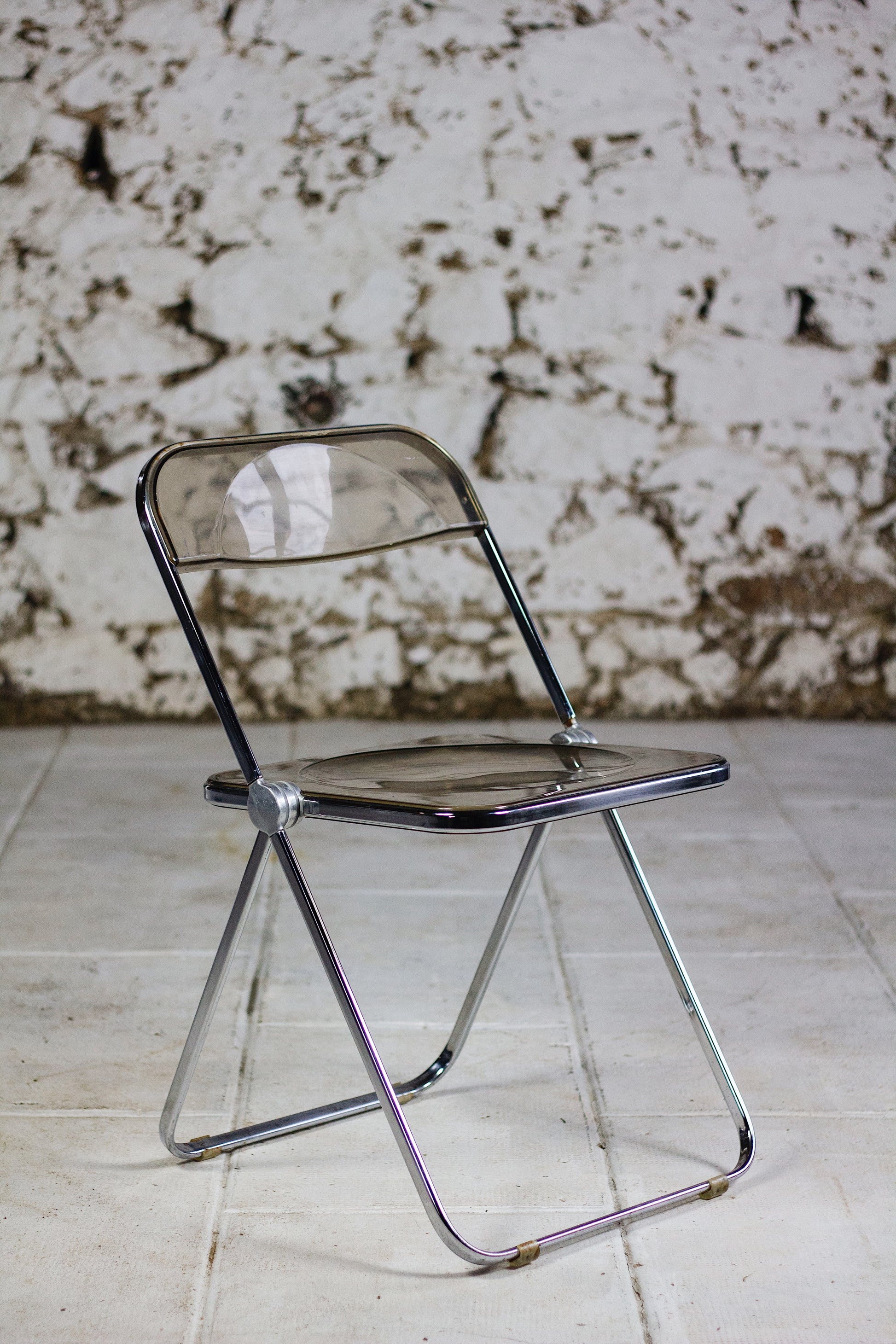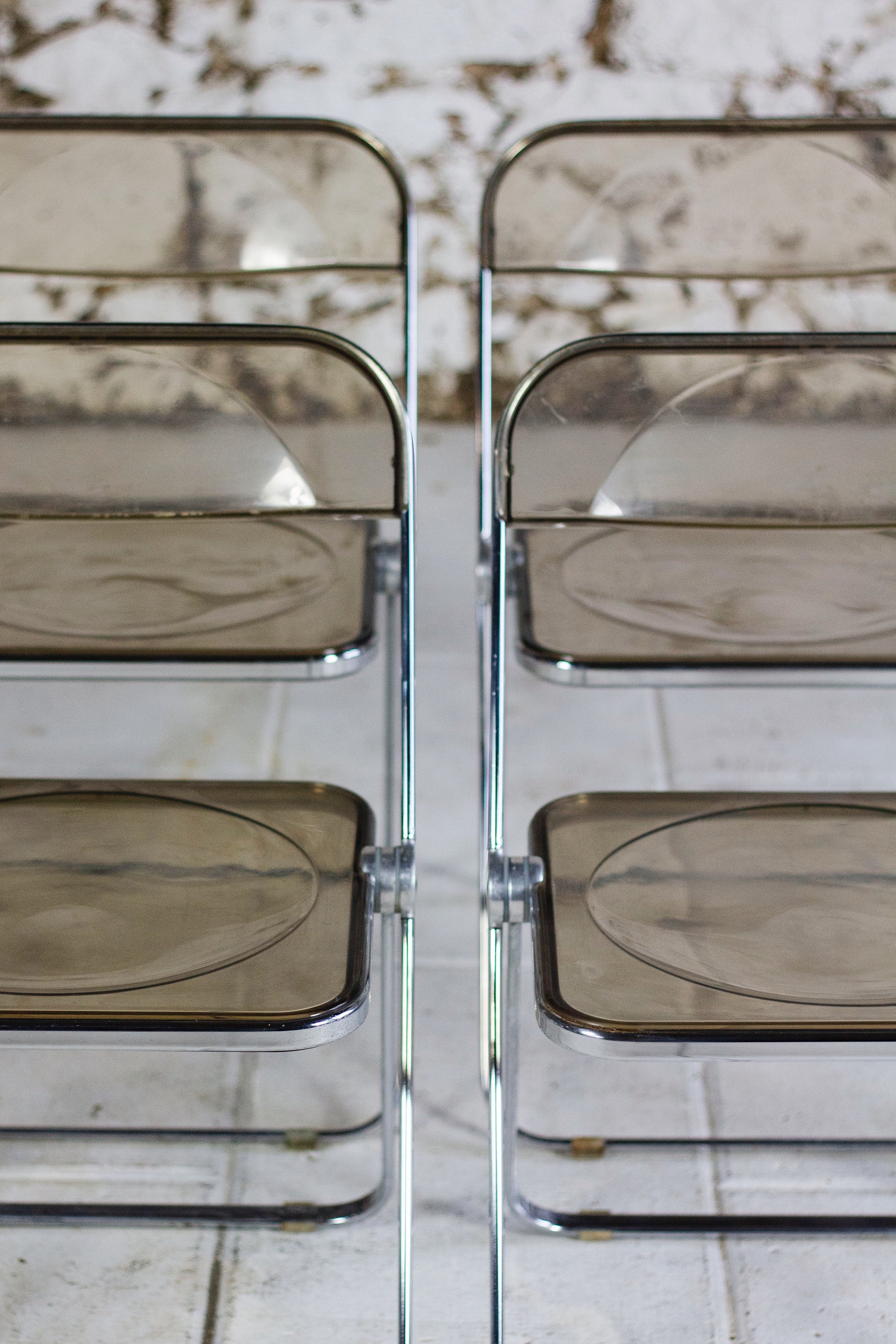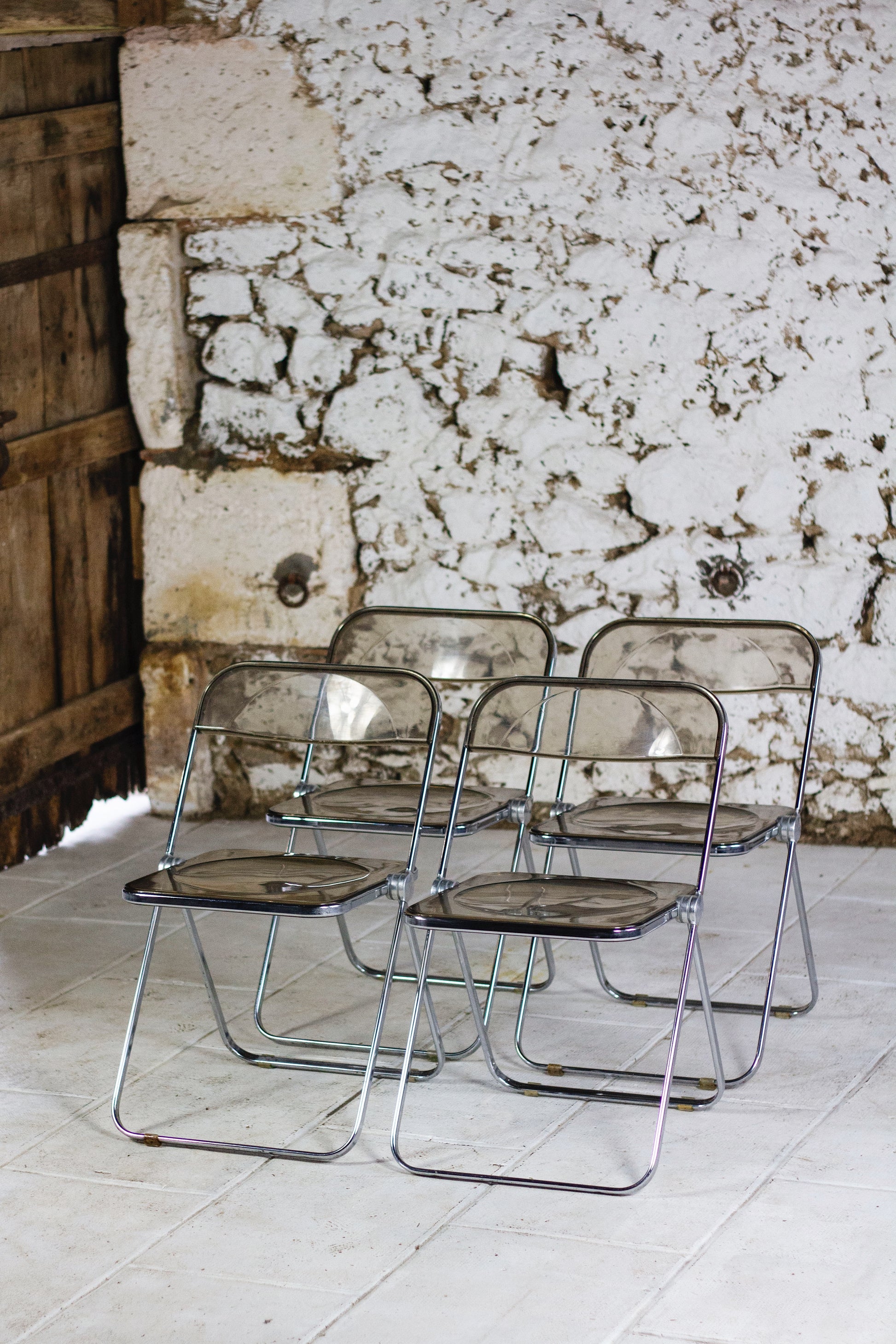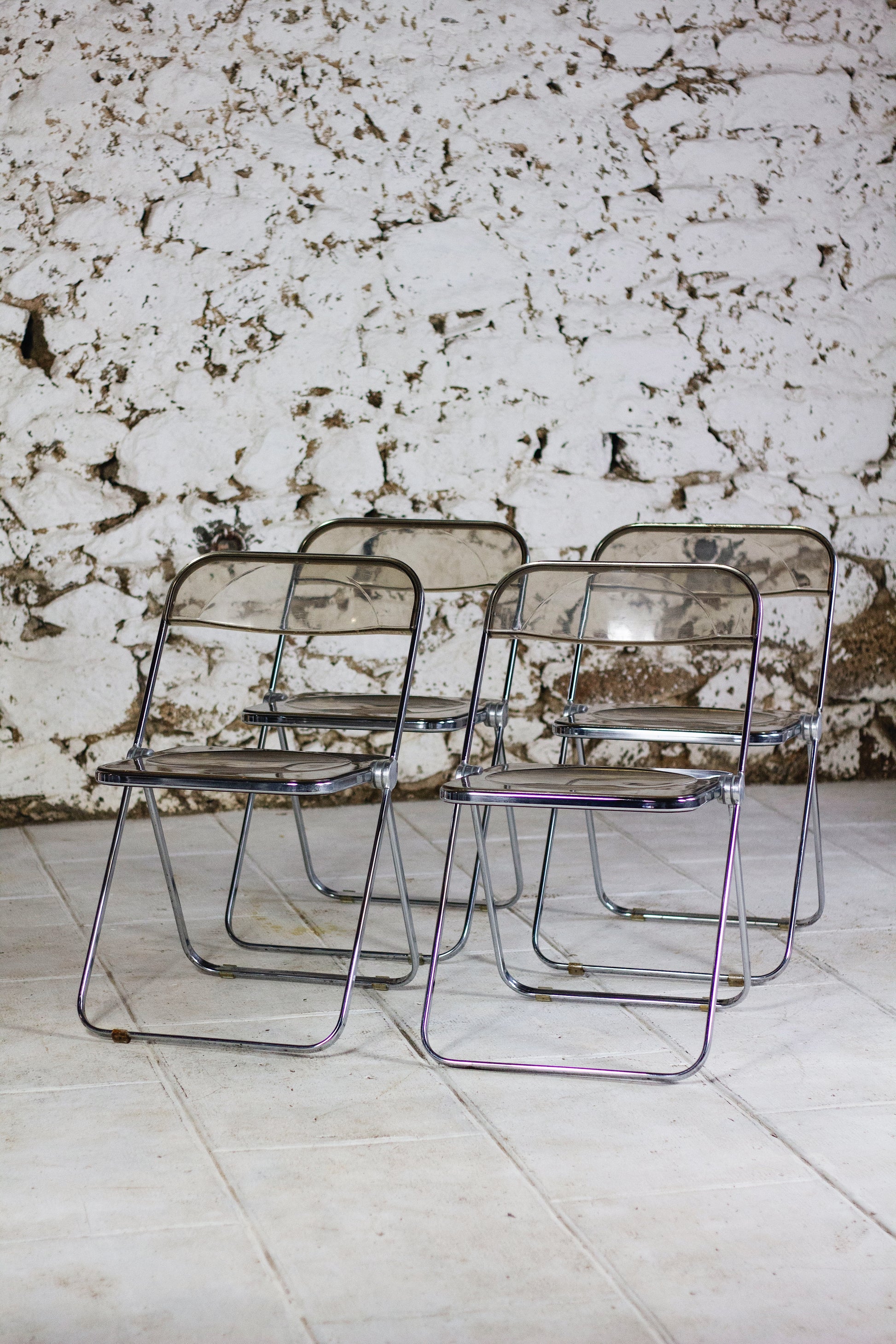 Ensemble de 4 chaises dites "Plia" en polyprolène fumé et acier par le designer Giancarlo Piretti pour Anonima Castelli. Cette chaise est un modèle emblématique du design des années 70 et figure au musée d'art modern de New York. Depuis sa présentation au Salon du meuble de Milan en 1967, elle est devenu un objet culte, apparaissant dans l'exposition Radical Furniture du MoMA comme un exemple de « design démocratique ». La Plia combine une structure en acier et une assise et un dossier en polypropylène transparent, ce qui la rend légère tant à l'usage qu'esthétique.