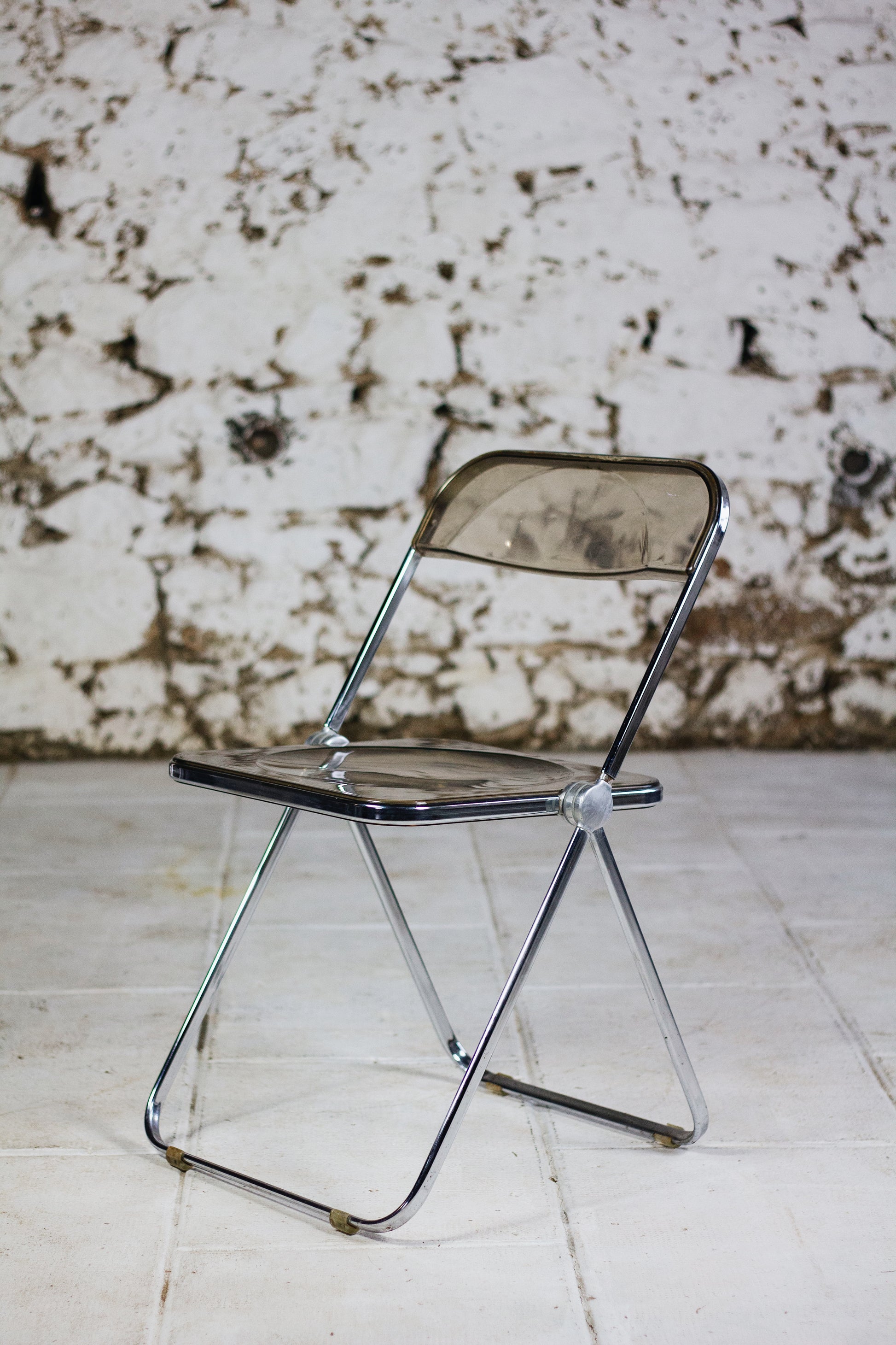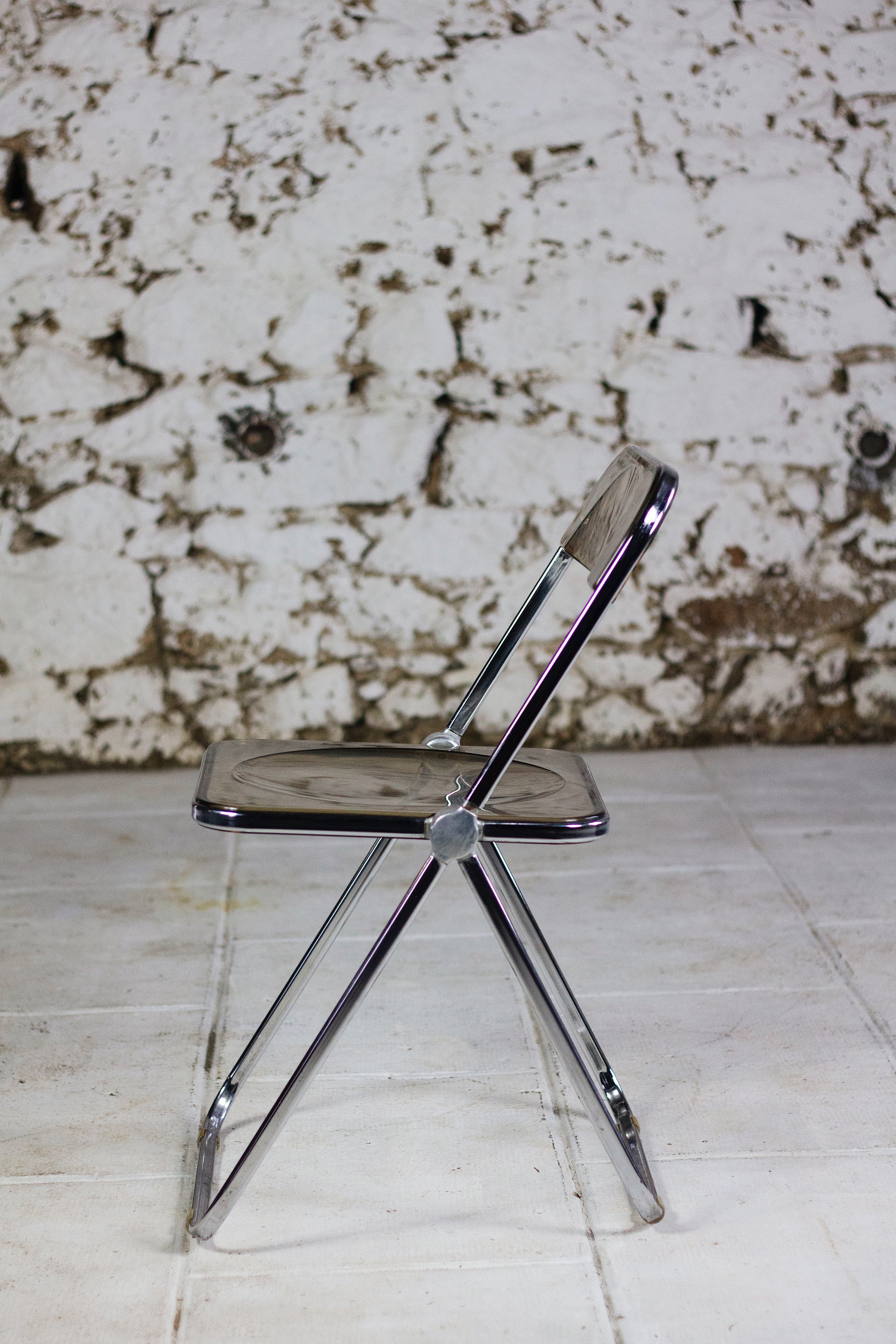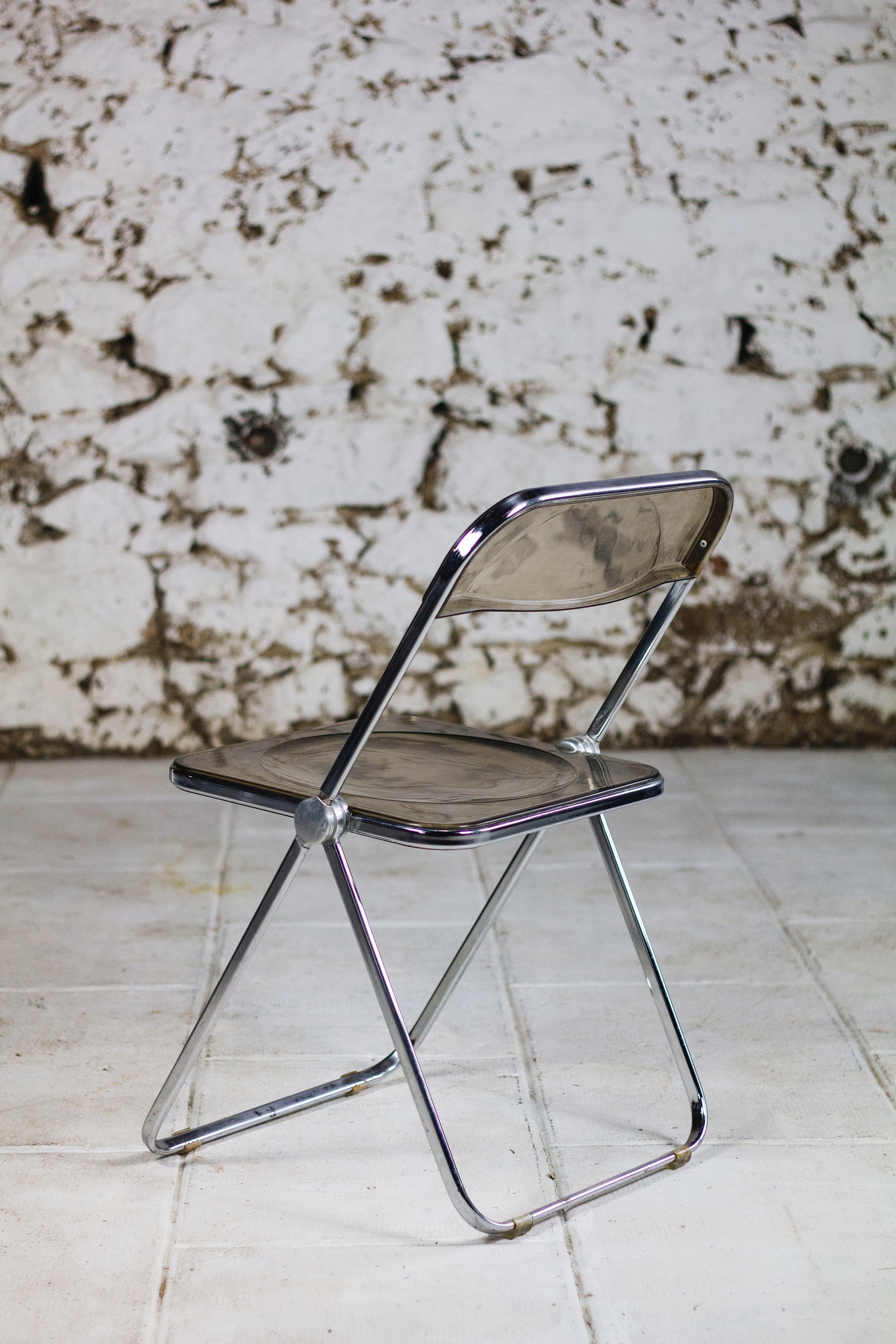 Ensemble de 4 chaises dites "Plia" en polyprolène fumé et acier par le designer Giancarlo Piretti pour Anonima Castelli. Cette chaise est un modèle emblématique du design des années 70 et figure au musée d'art modern de New York. Depuis sa présentation au Salon du meuble de Milan en 1967, elle est devenu un objet culte, apparaissant dans l'exposition Radical Furniture du MoMA comme un exemple de « design démocratique ». La Plia combine une structure en acier et une assise et un dossier en polypropylène transparent, ce qui la rend légère tant à l'usage qu'esthétique.