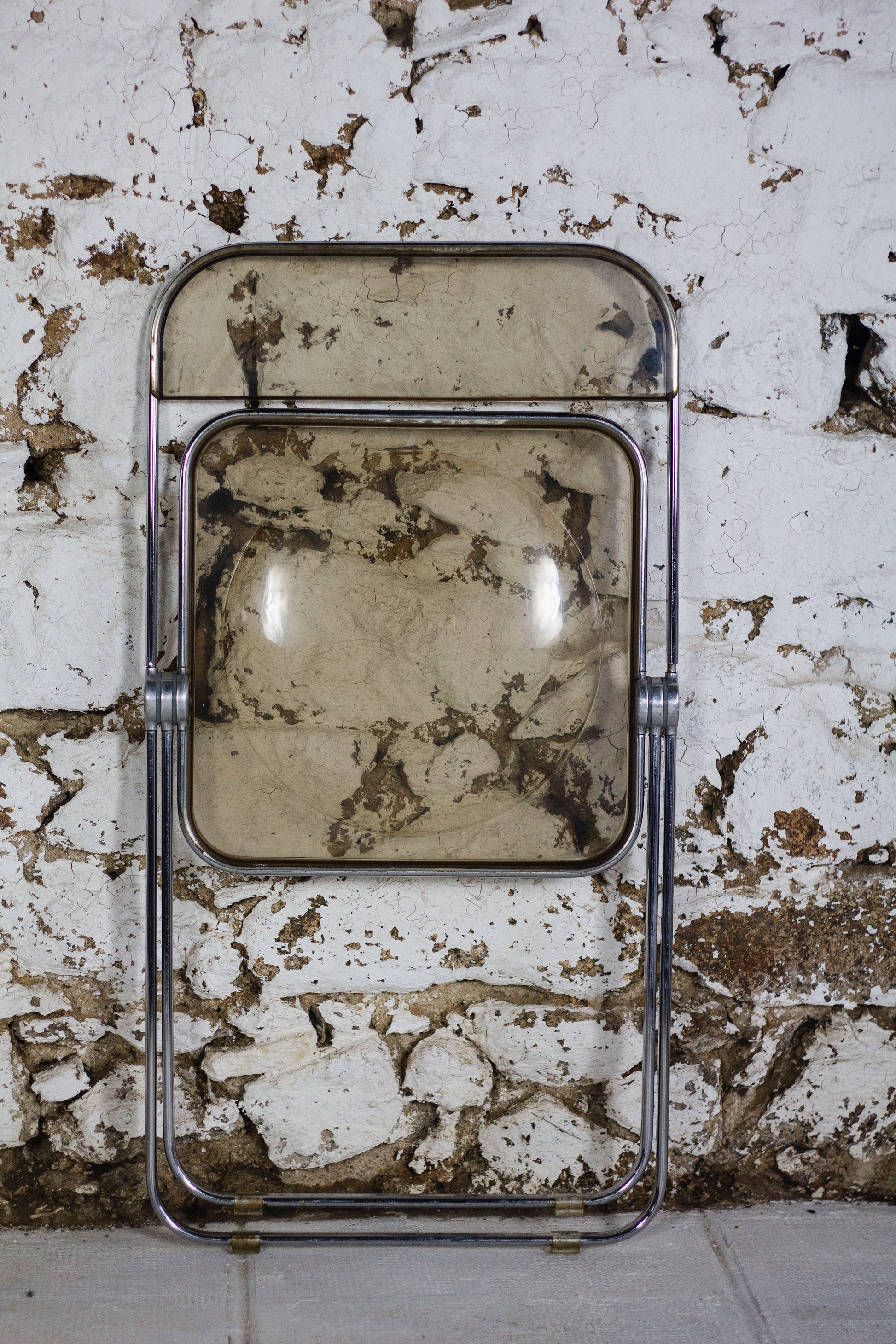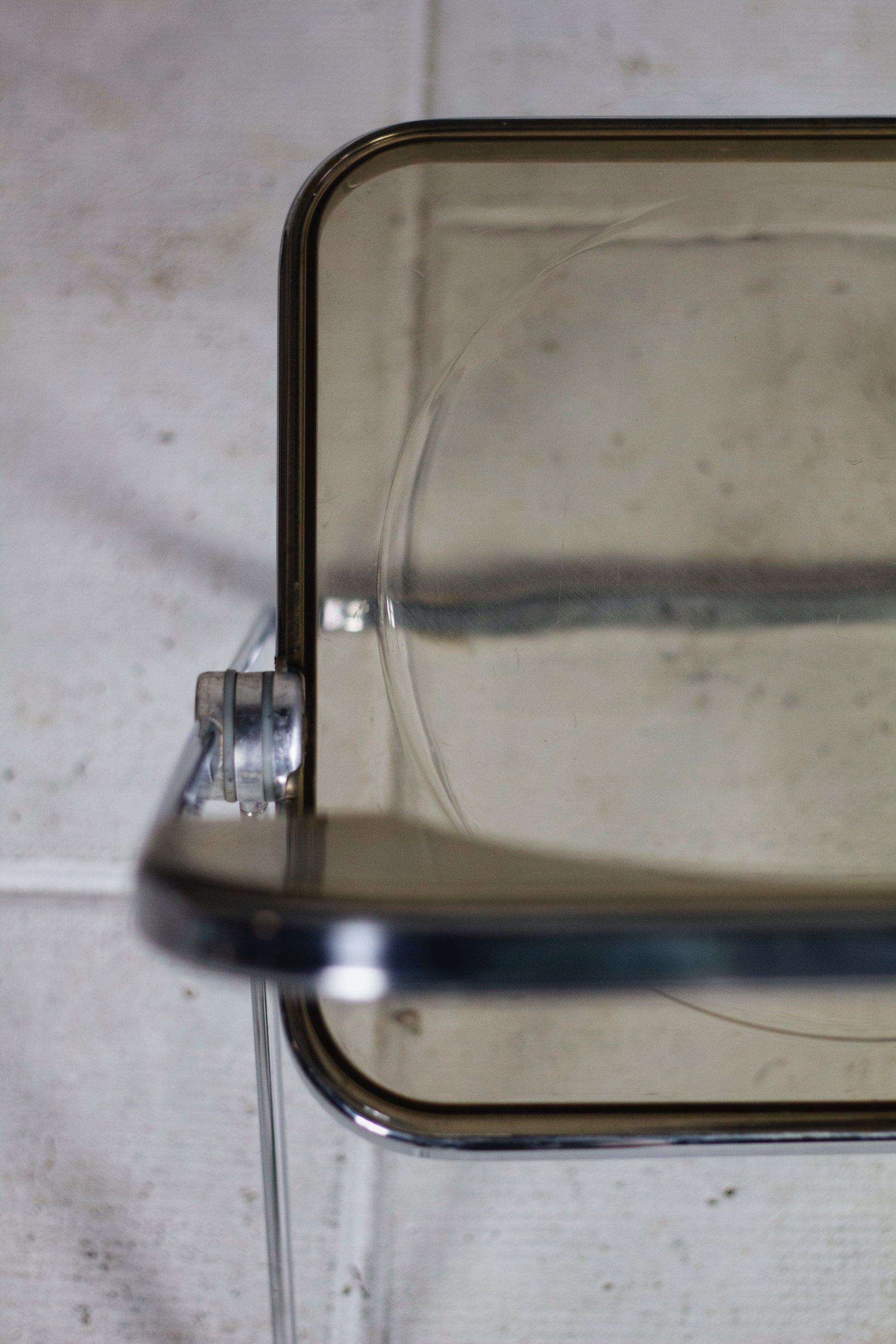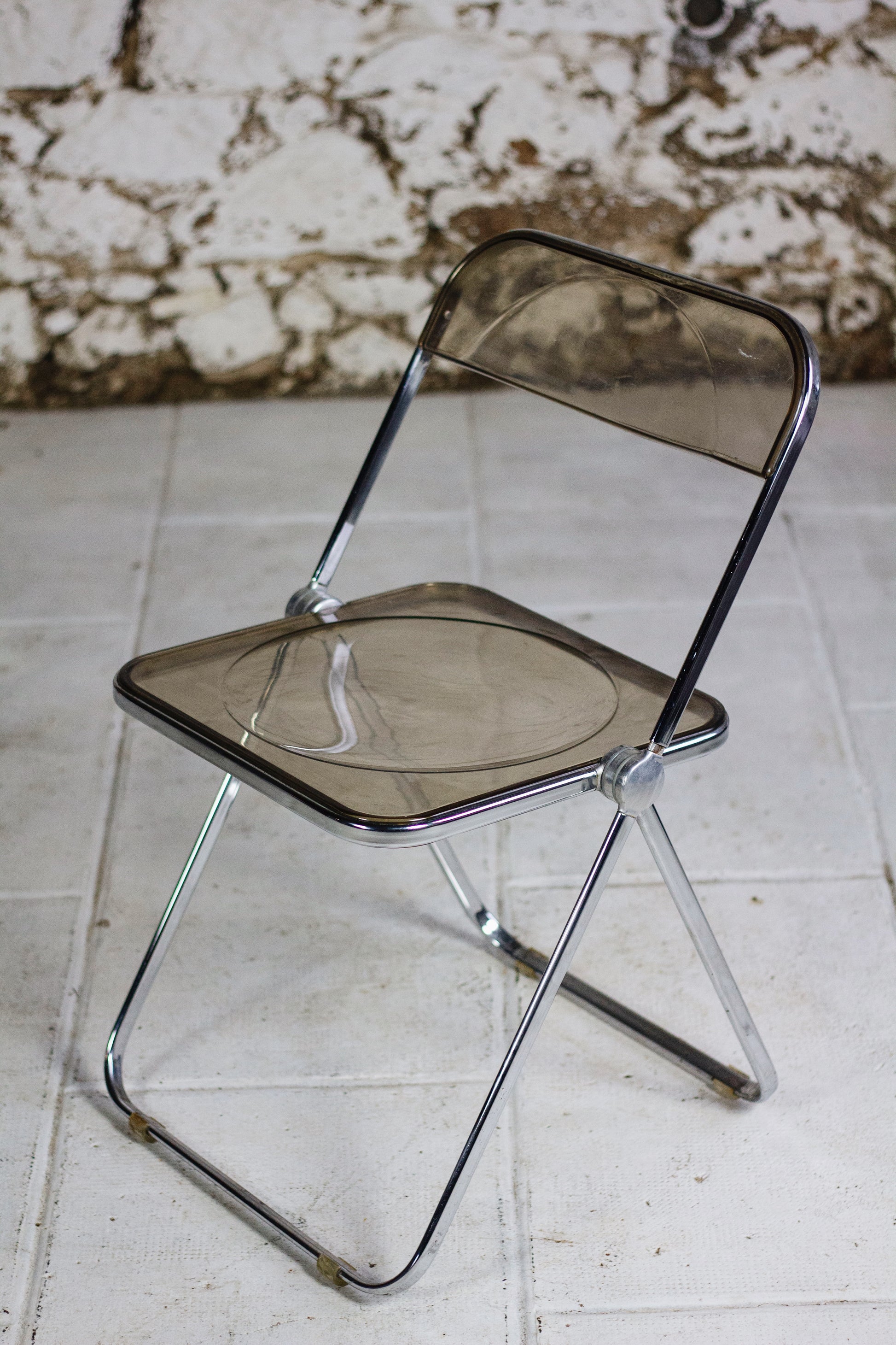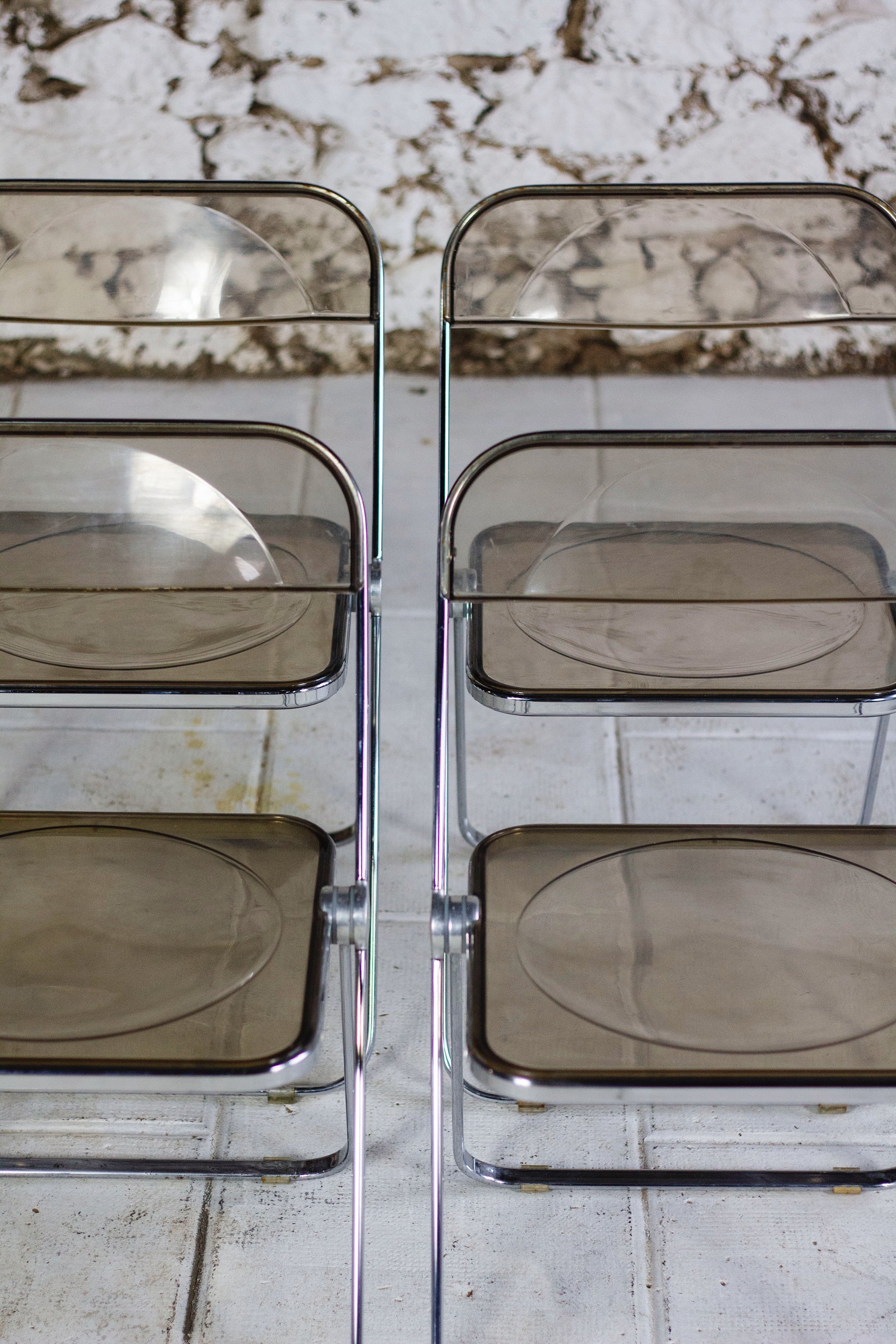 Ensemble de 4 chaises dites "Plia" en polyprolène fumé et acier par le designer Giancarlo Piretti pour Anonima Castelli. Cette chaise est un modèle emblématique du design des années 70 et figure au musée d'art modern de New York. Depuis sa présentation au Salon du meuble de Milan en 1967, elle est devenu un objet culte, apparaissant dans l'exposition Radical Furniture du MoMA comme un exemple de « design démocratique ». La Plia combine une structure en acier et une assise et un dossier en polypropylène transparent, ce qui la rend légère tant à l'usage qu'esthétique.