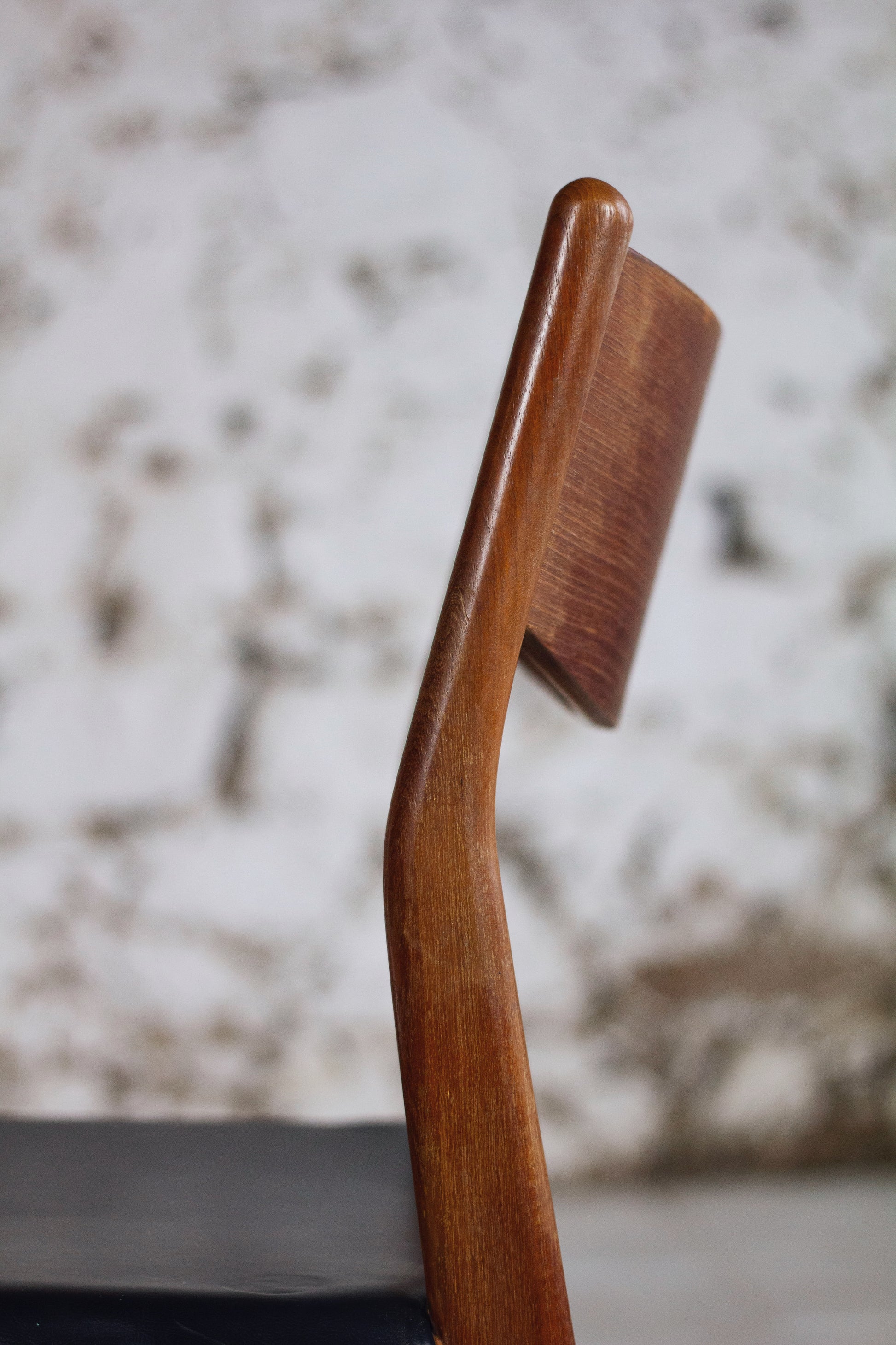 Série de 4 chaises des années 60 de style danoise de l’éditeur Fristho Franeker en Teck et simili cuir noir. Fristho Franeker est un Fabricant Neerlandais réputé des années 50 à 70. Les chaises ne sont pas estampillées, mais sont reconnaissables à leur dossier avec la courbe dans la partie basse.
