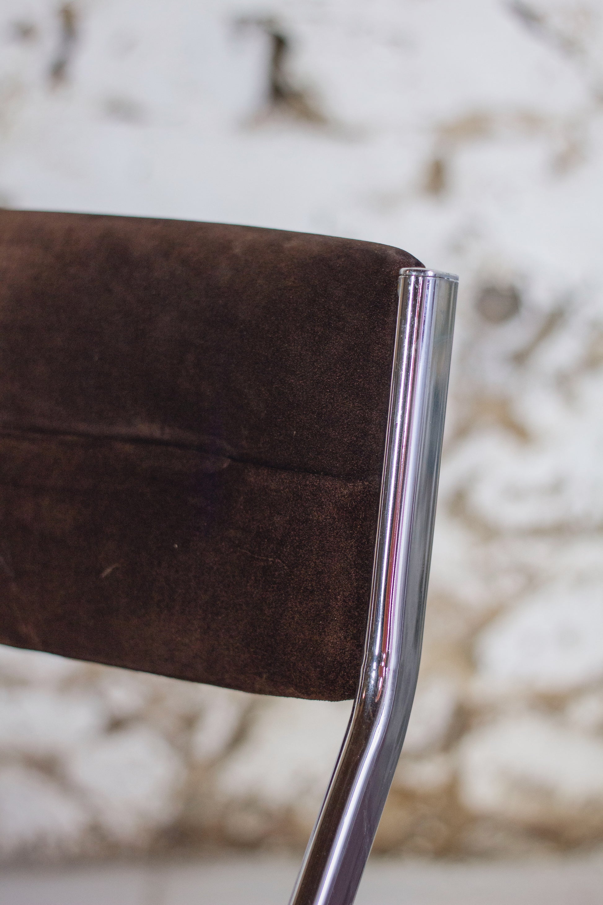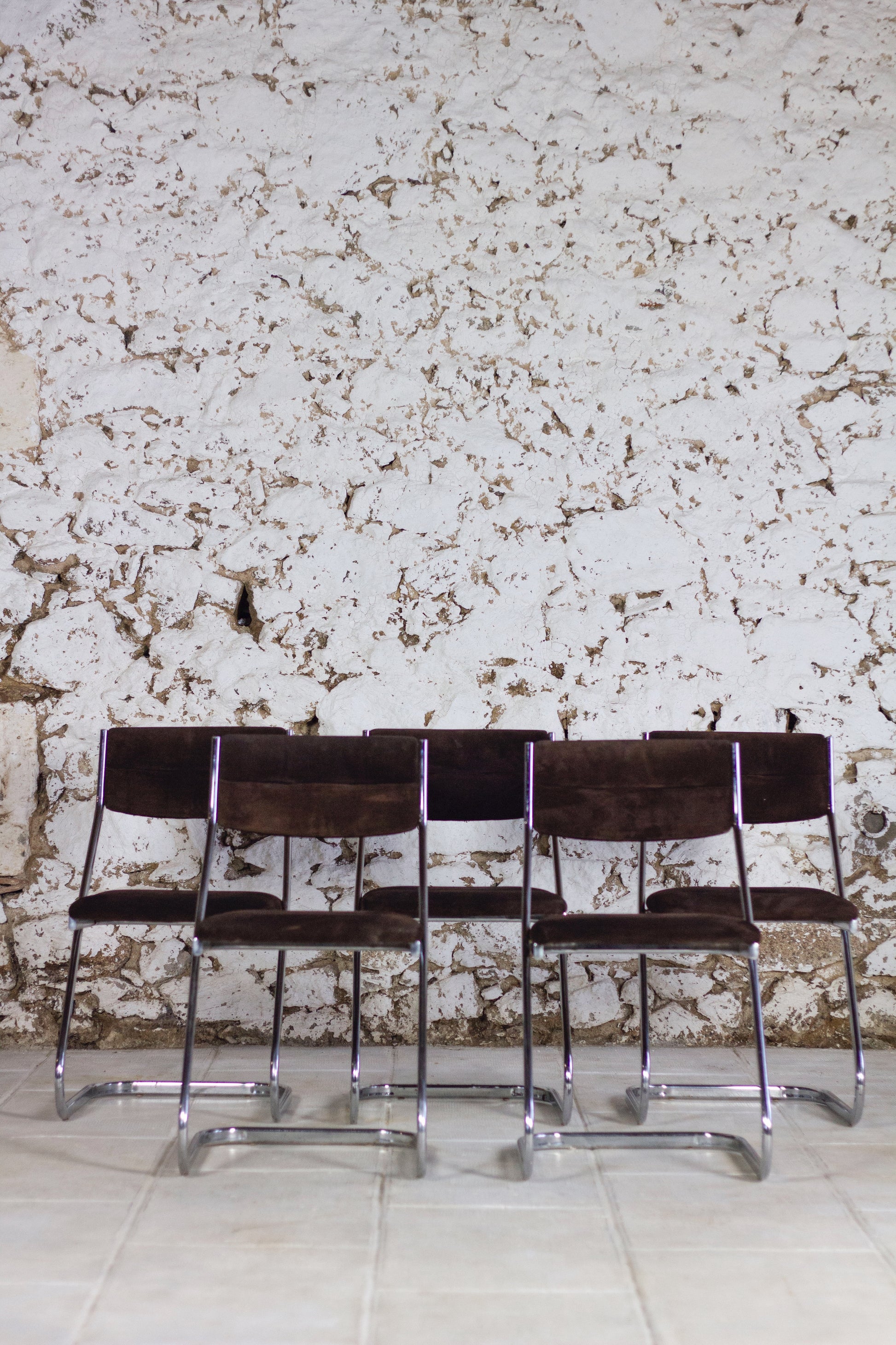 Suite de 5 chaises vintage tubulaire en métal chromé et daim des années 1970 pour Roche Bobois.