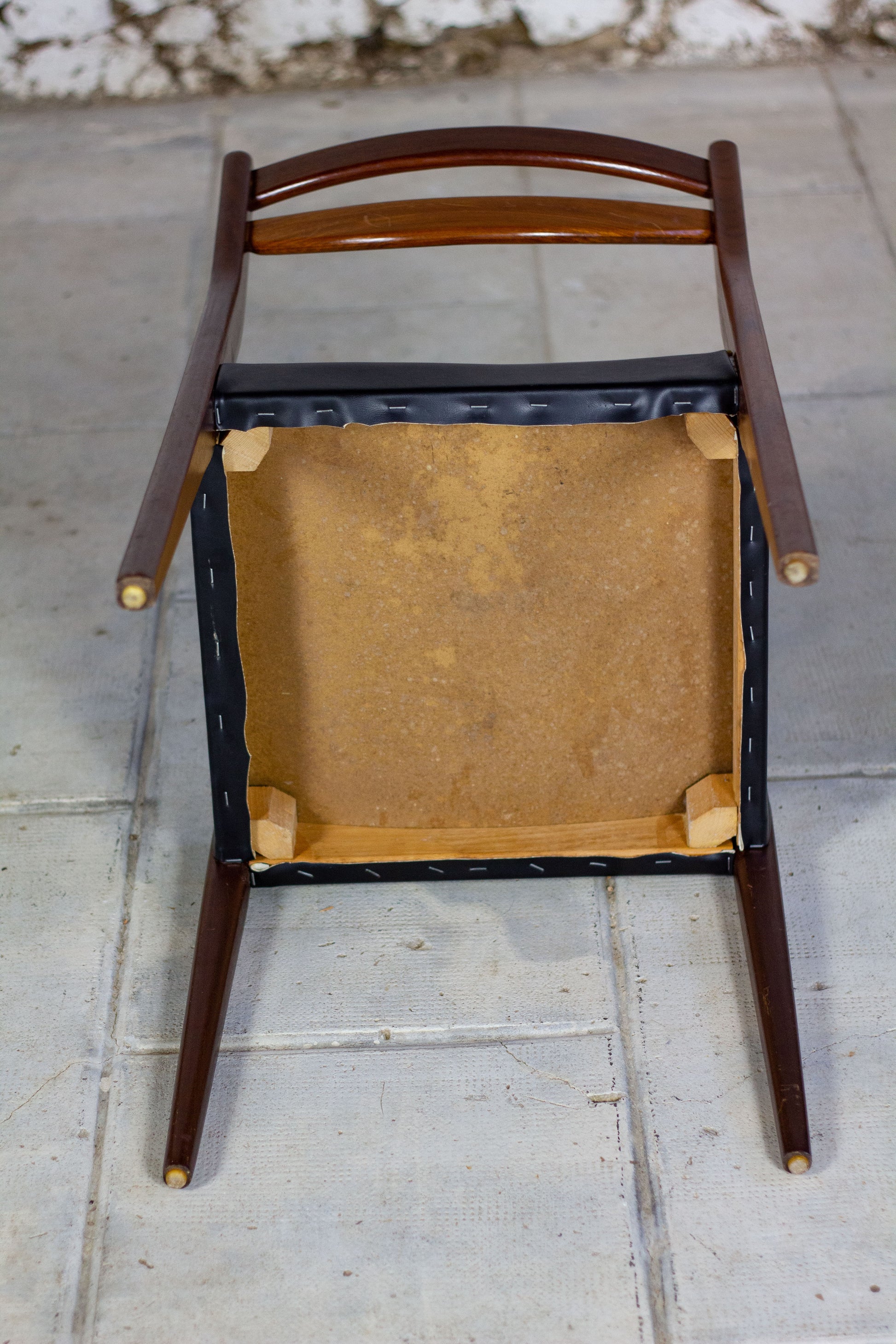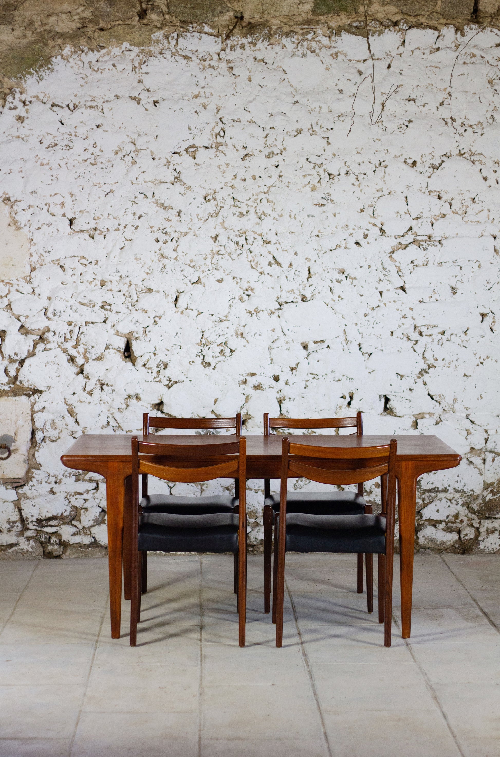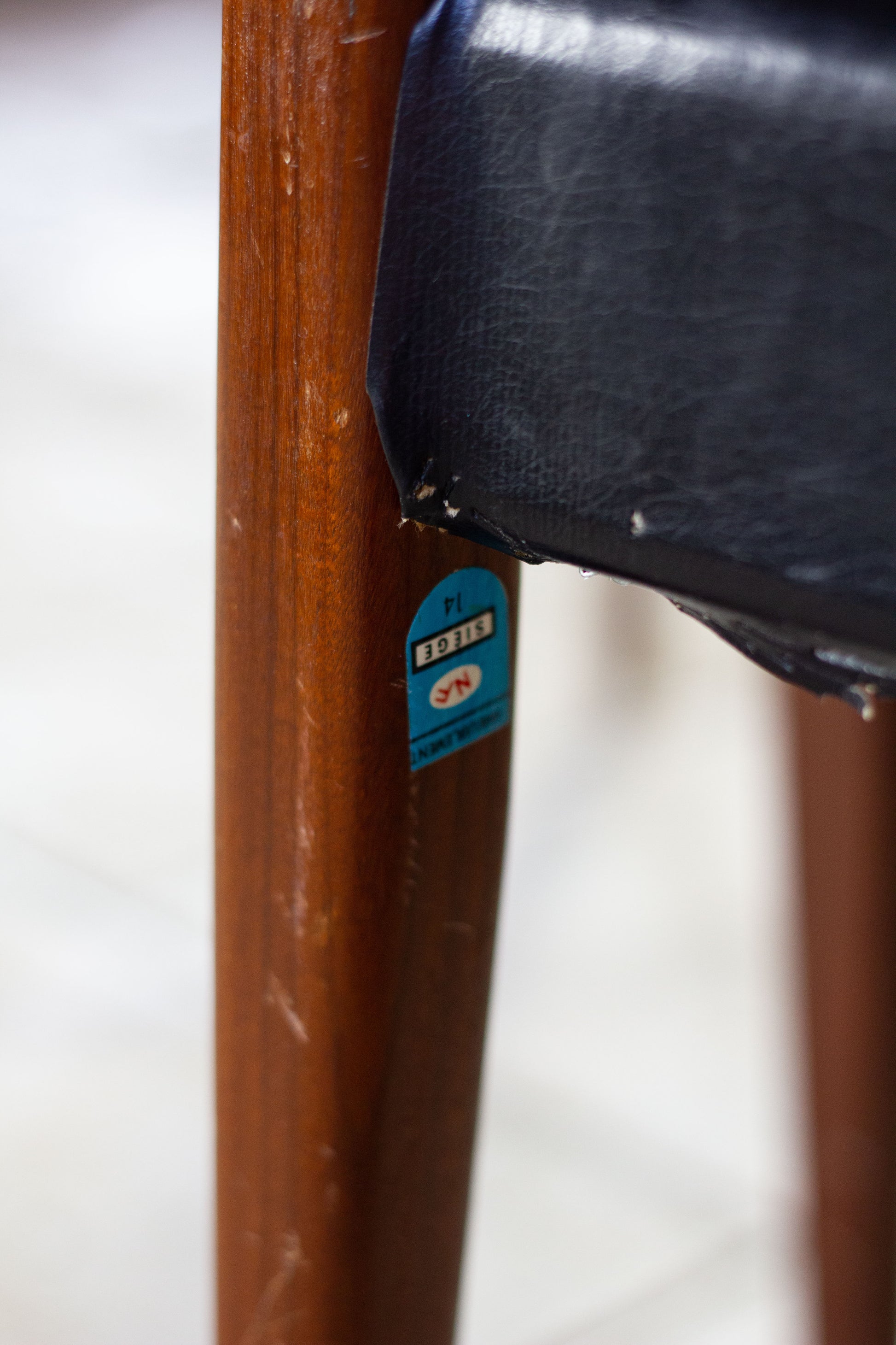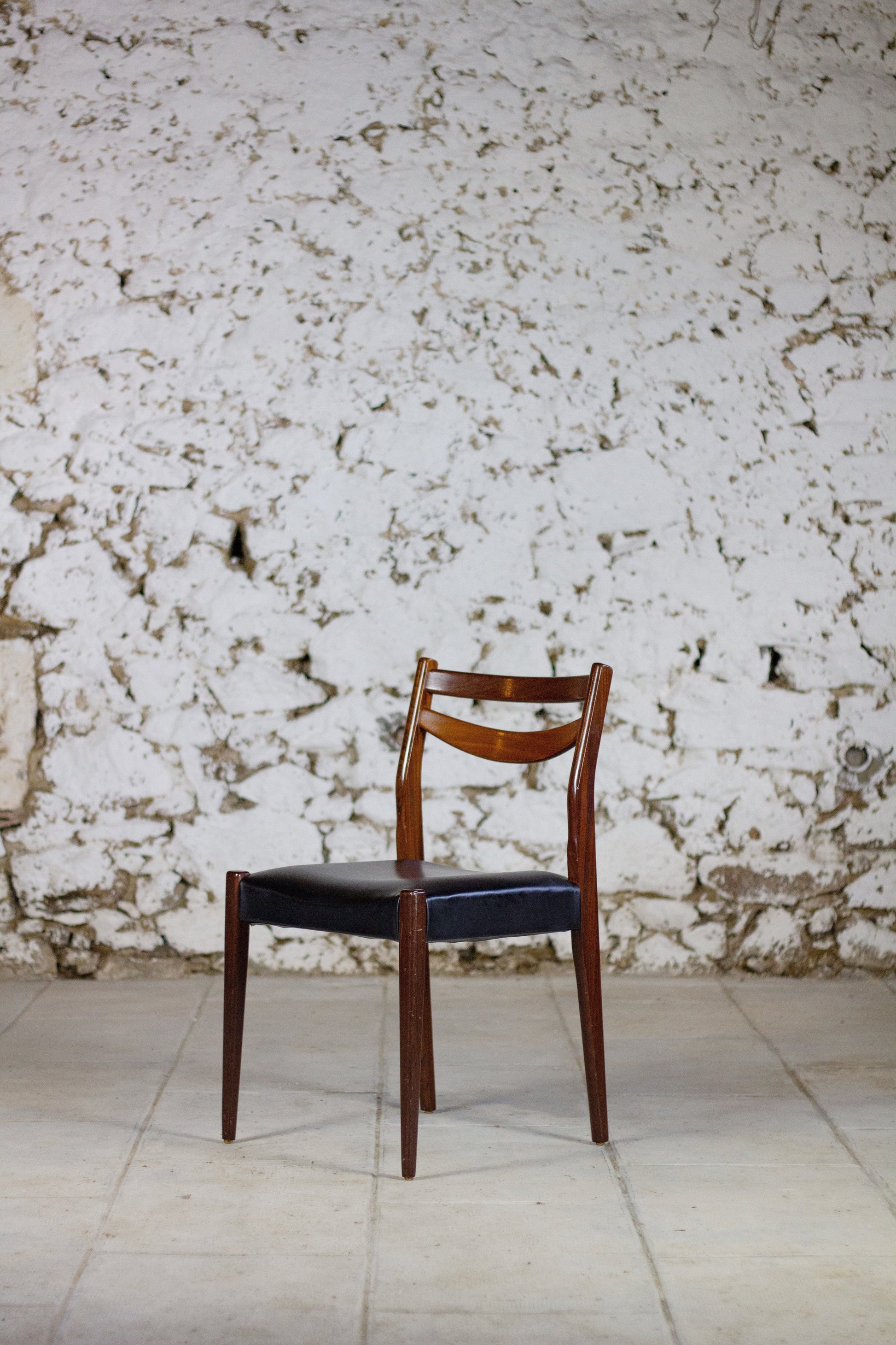 Chaise scandinave vintage en teck et simili cuir noir. Disponible en 5 exemplaires. Elles s'intégreront parfaitement dans un intérieur de type modern-mid century, design ou scandinave. Très joli look. Possibilité de les acheter avec une table scandinave par Johannes Andersen (voir photos).