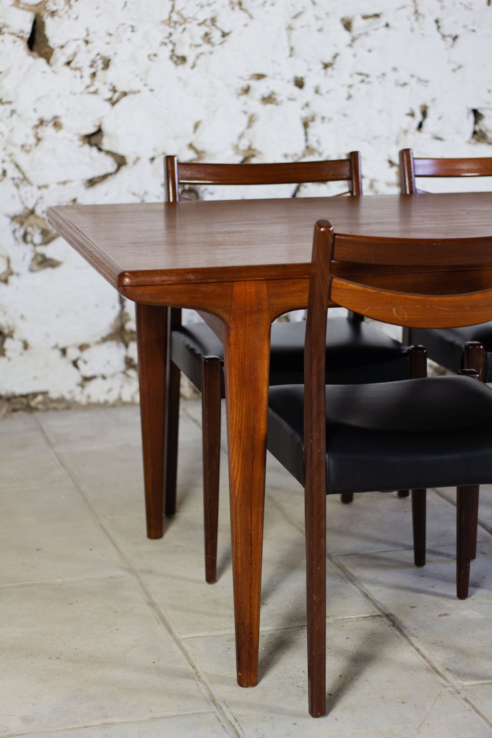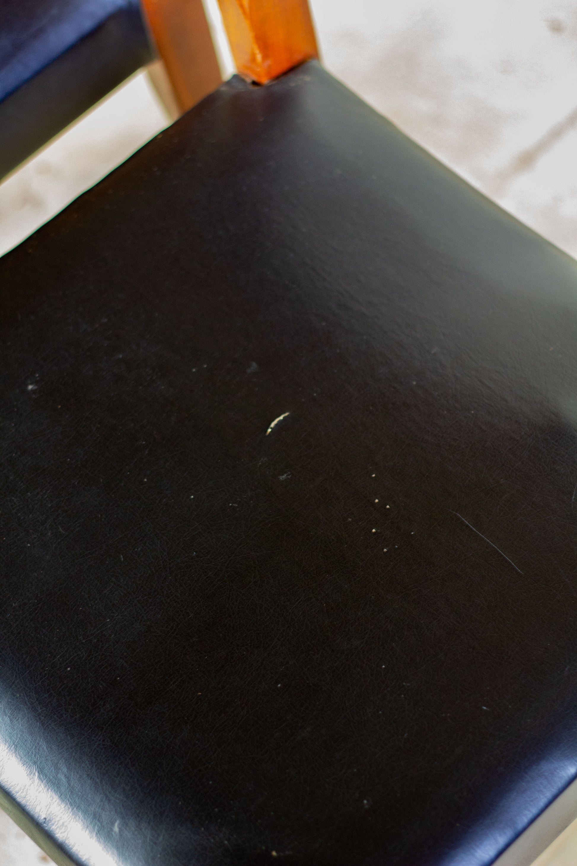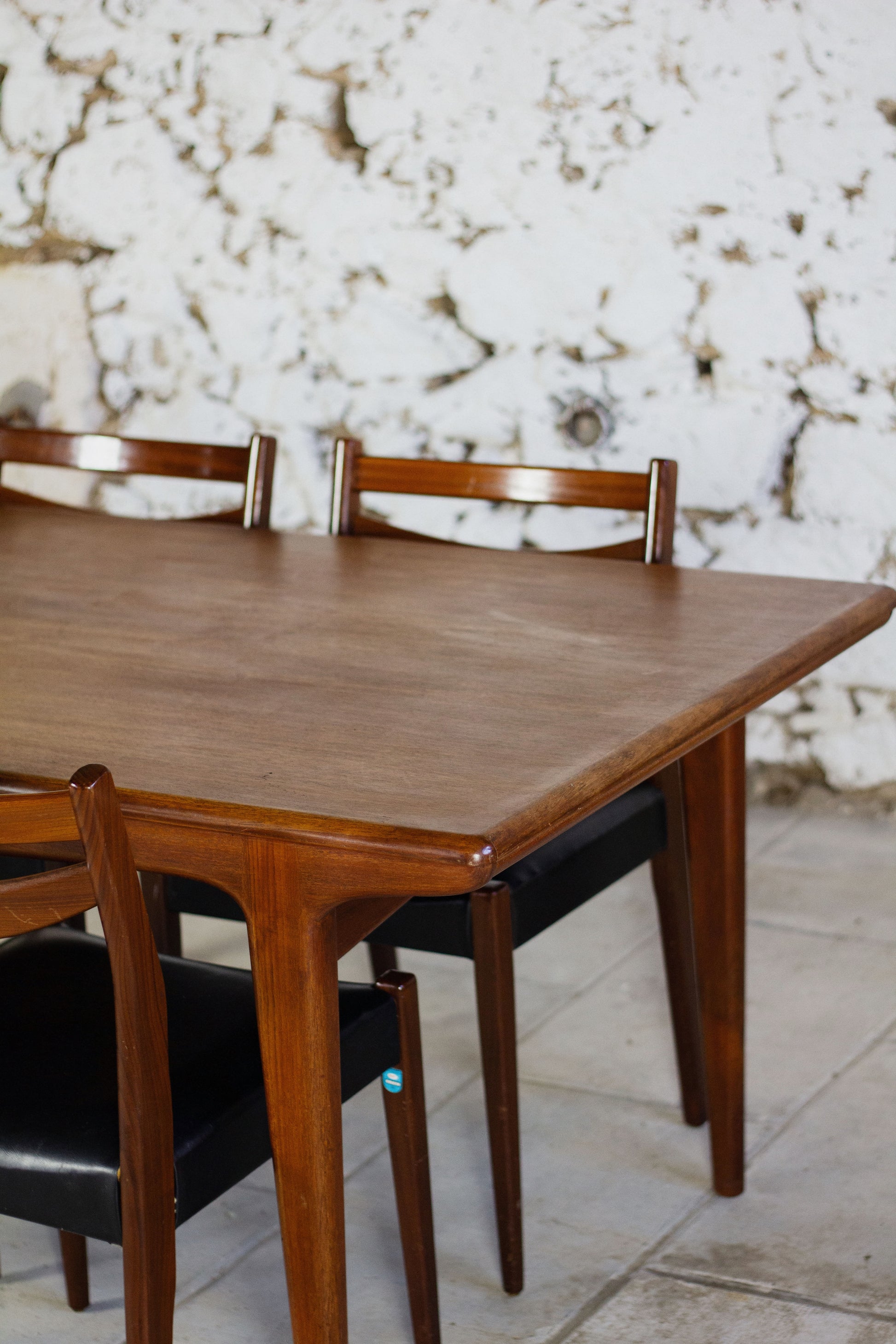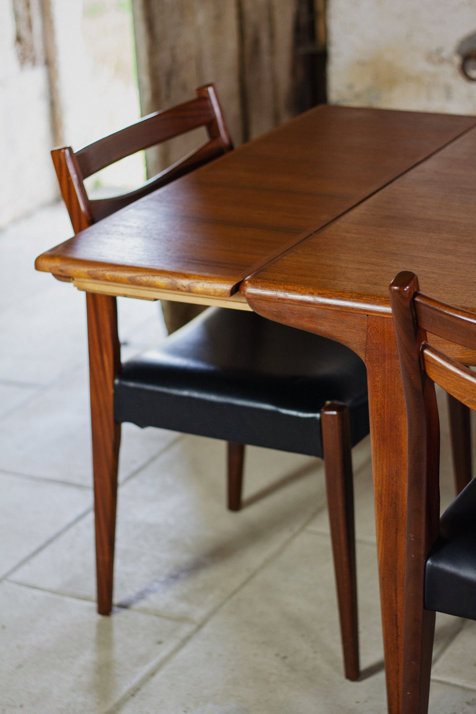Chaise scandinave vintage en teck et simili cuir noir. Disponible en 5 exemplaires. Elles s'intégreront parfaitement dans un intérieur de type modern-mid century, design ou scandinave. Très joli look. Possibilité de les acheter avec une table scandinave par Johannes Andersen (voir photos).