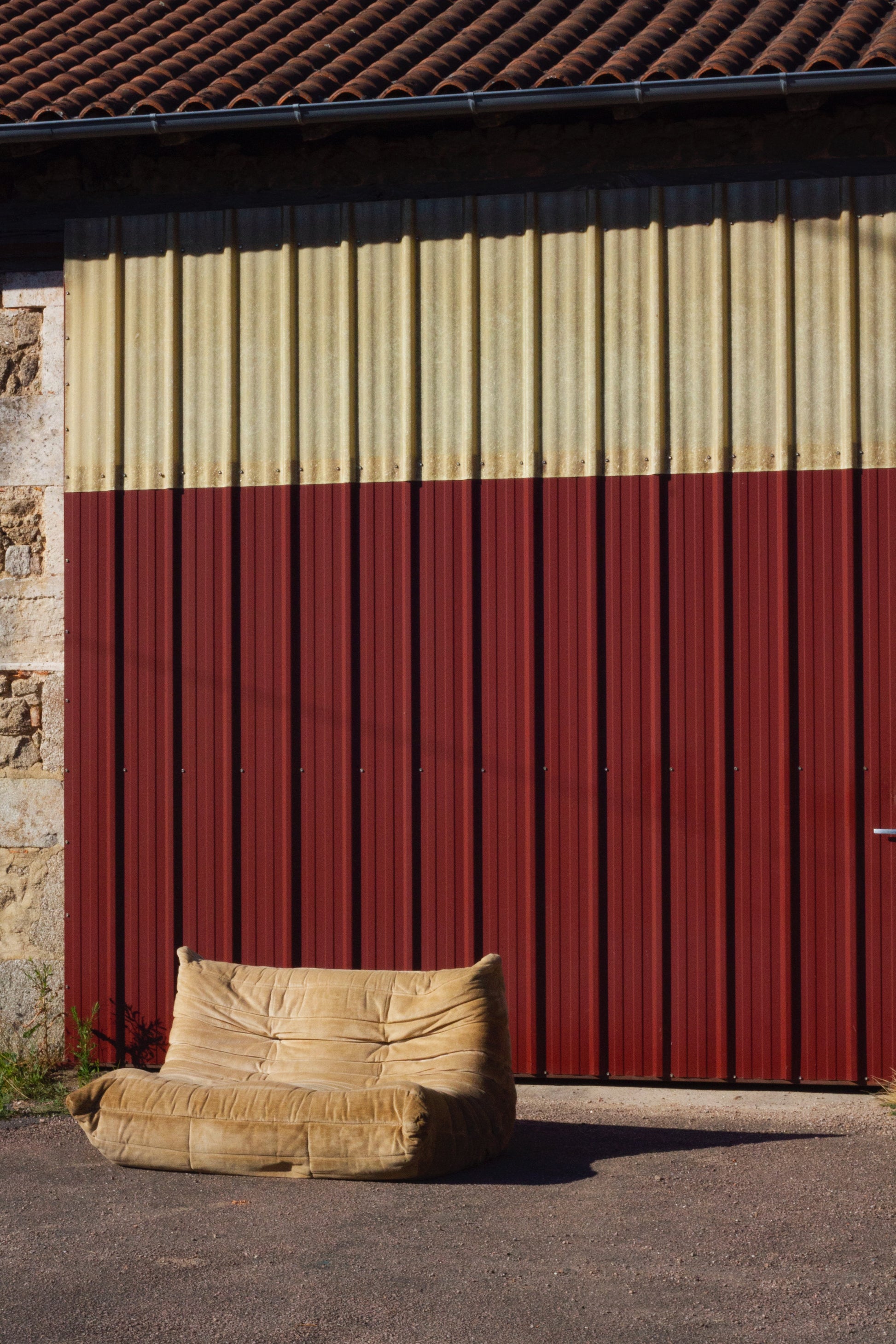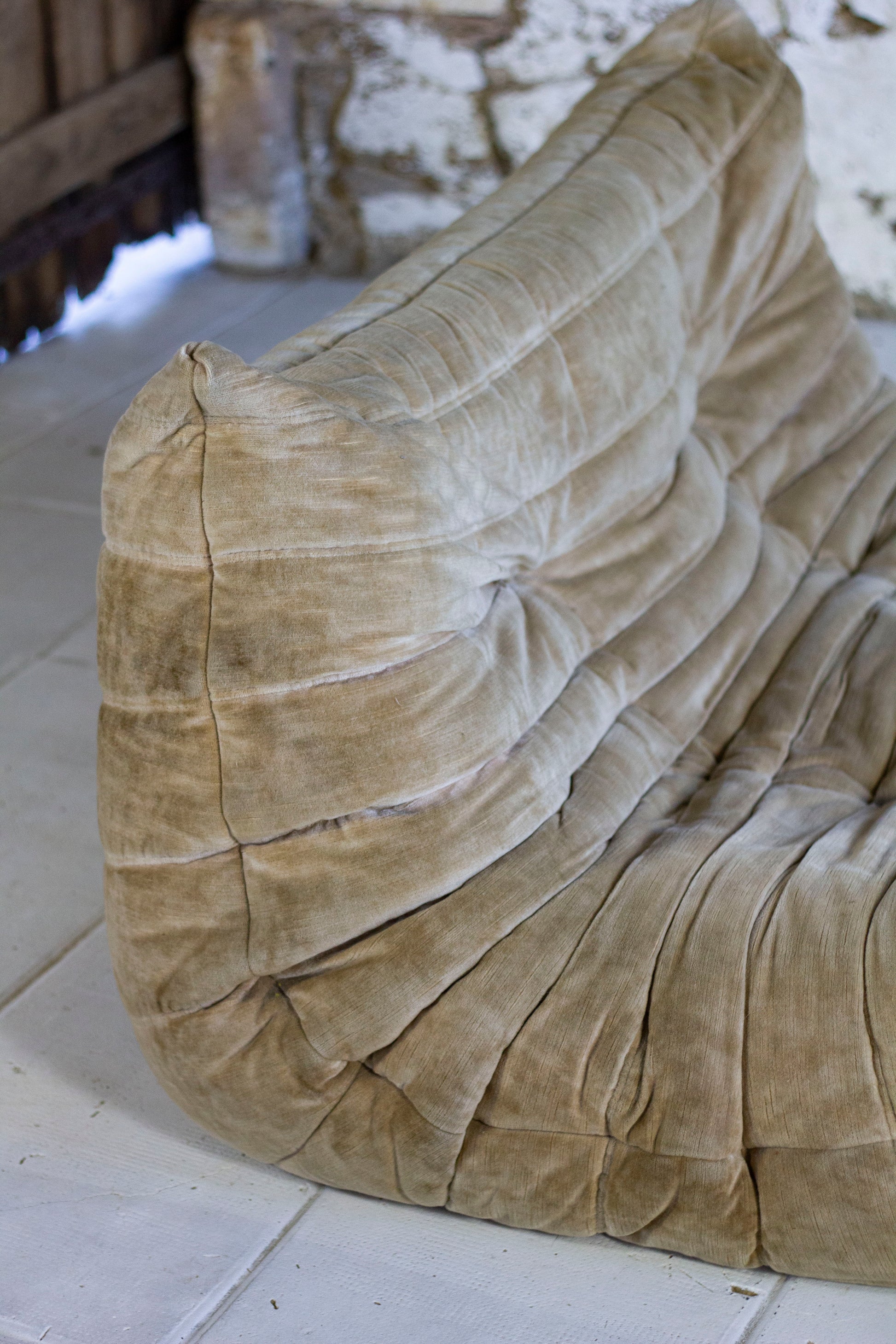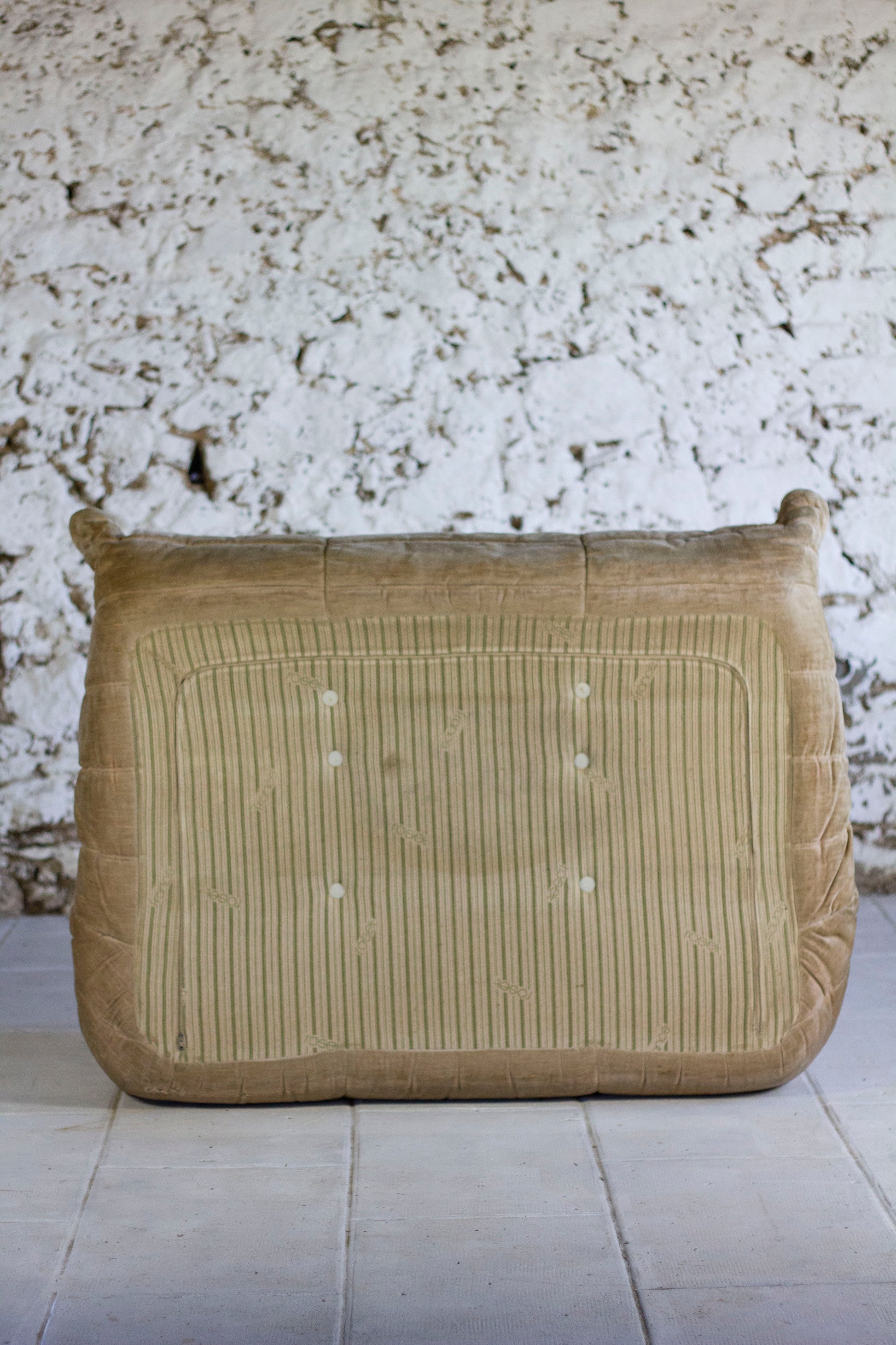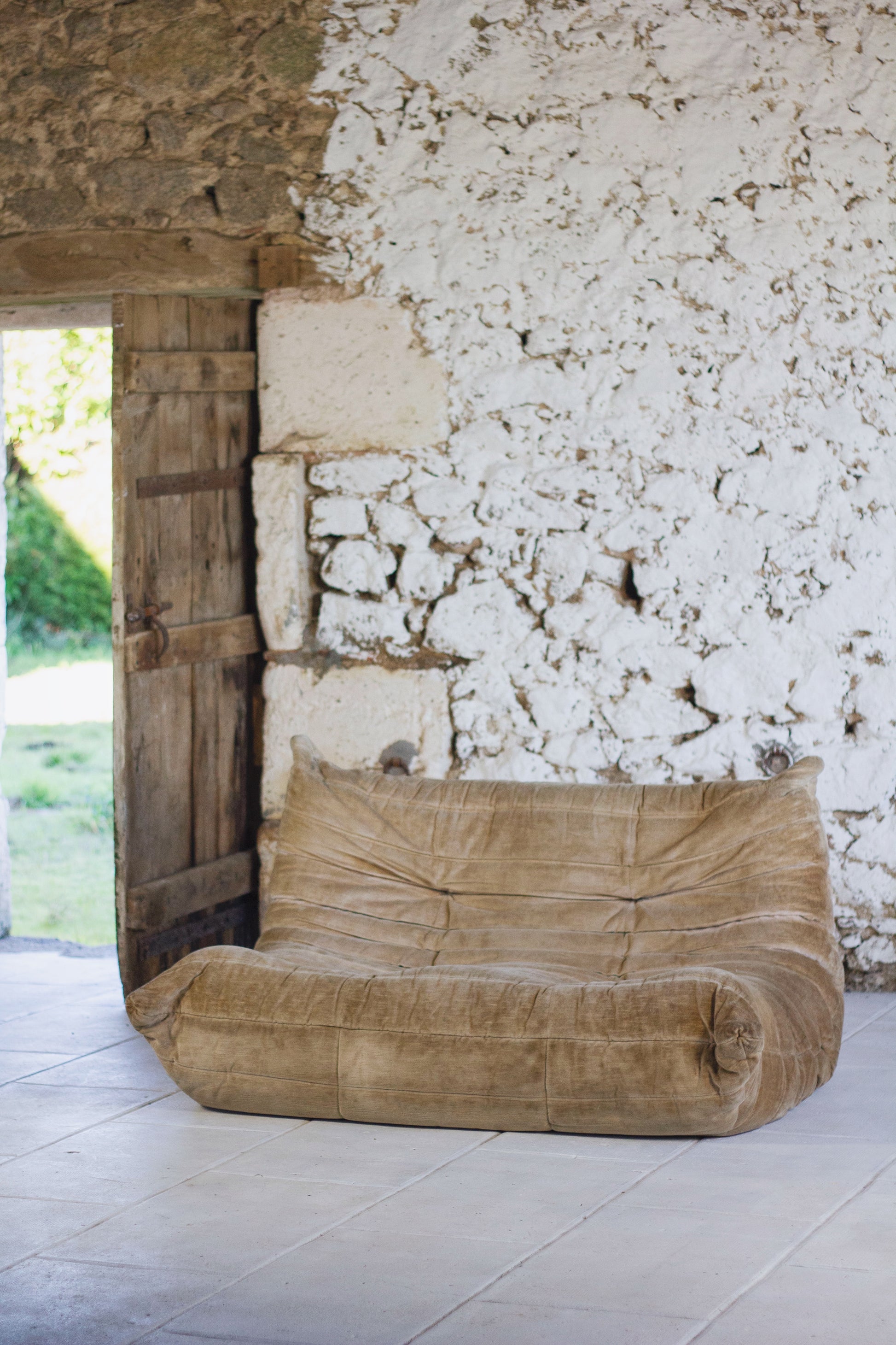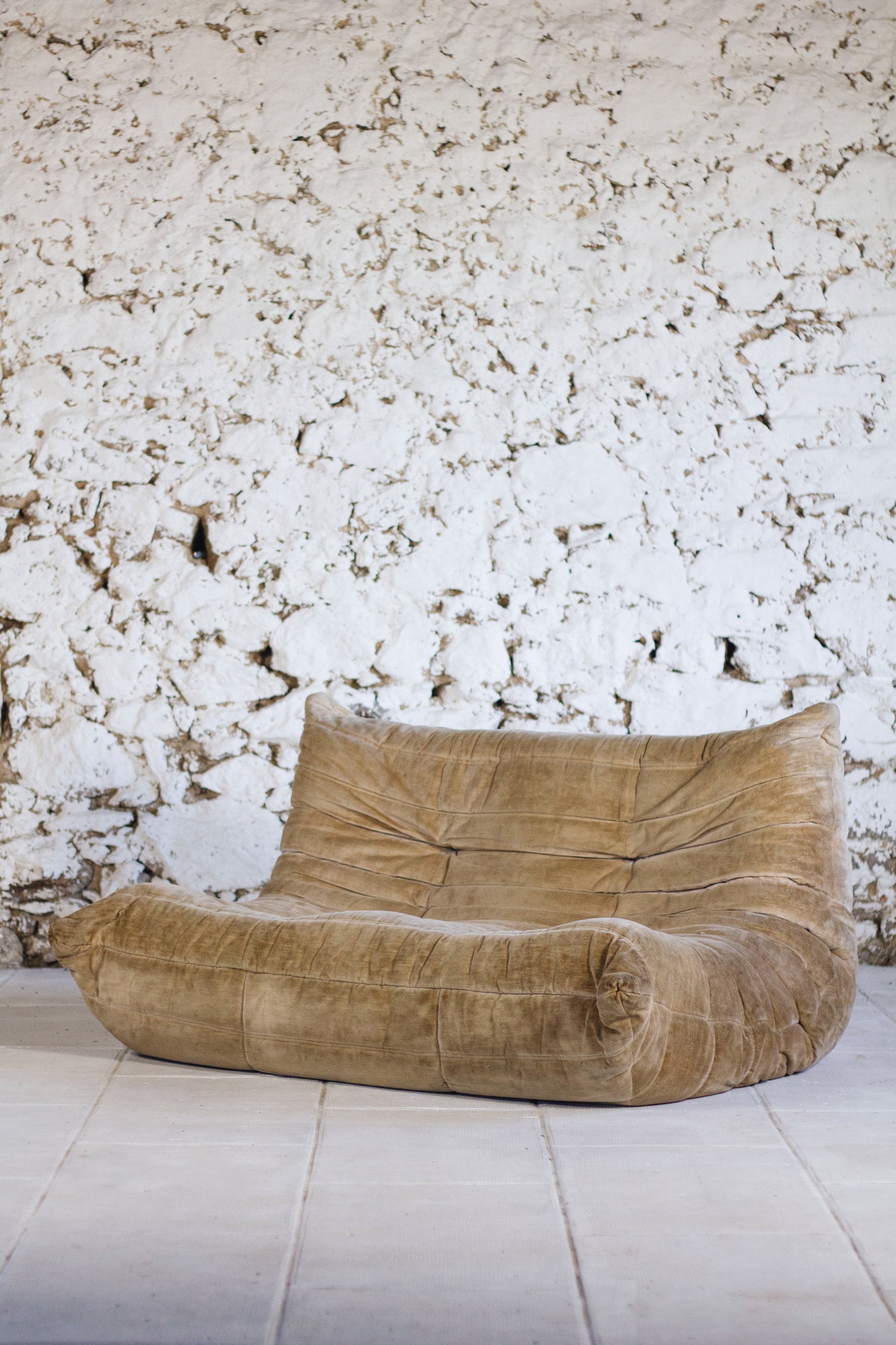 Canapé Togo 2 places en velours beige par Michel Ducaroy, LIGNE ROSET, 1973