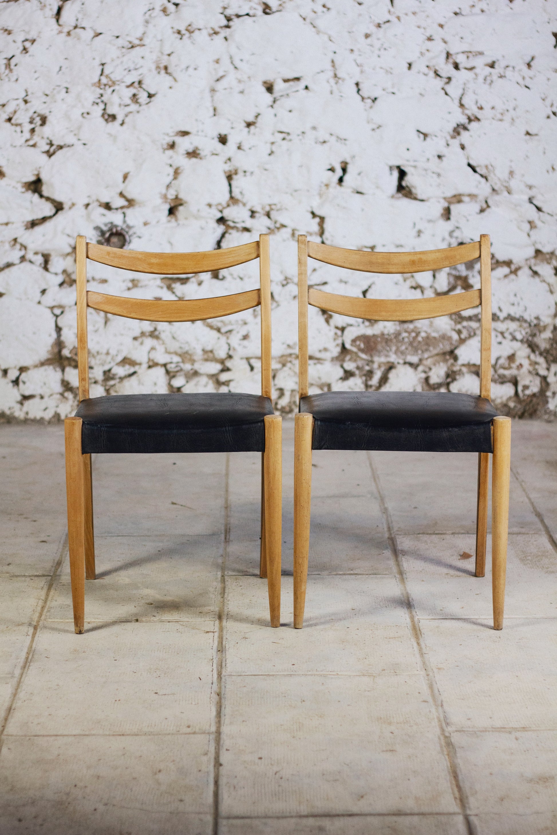 Chaise scandinave vintage en teck et skaï noir, fabrication française ds années 1960. Ces chaises s'accorderont très bien avec un intérieur scandinave ou modern mid century.