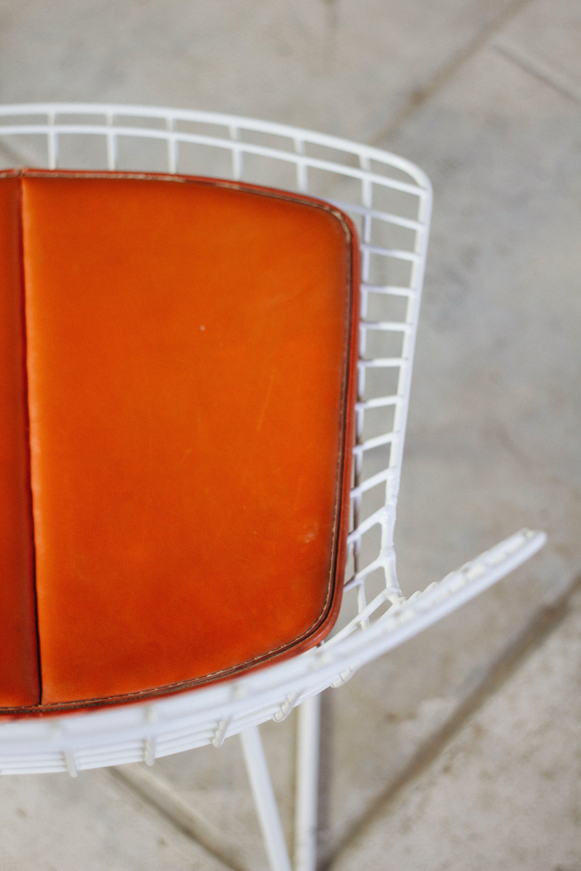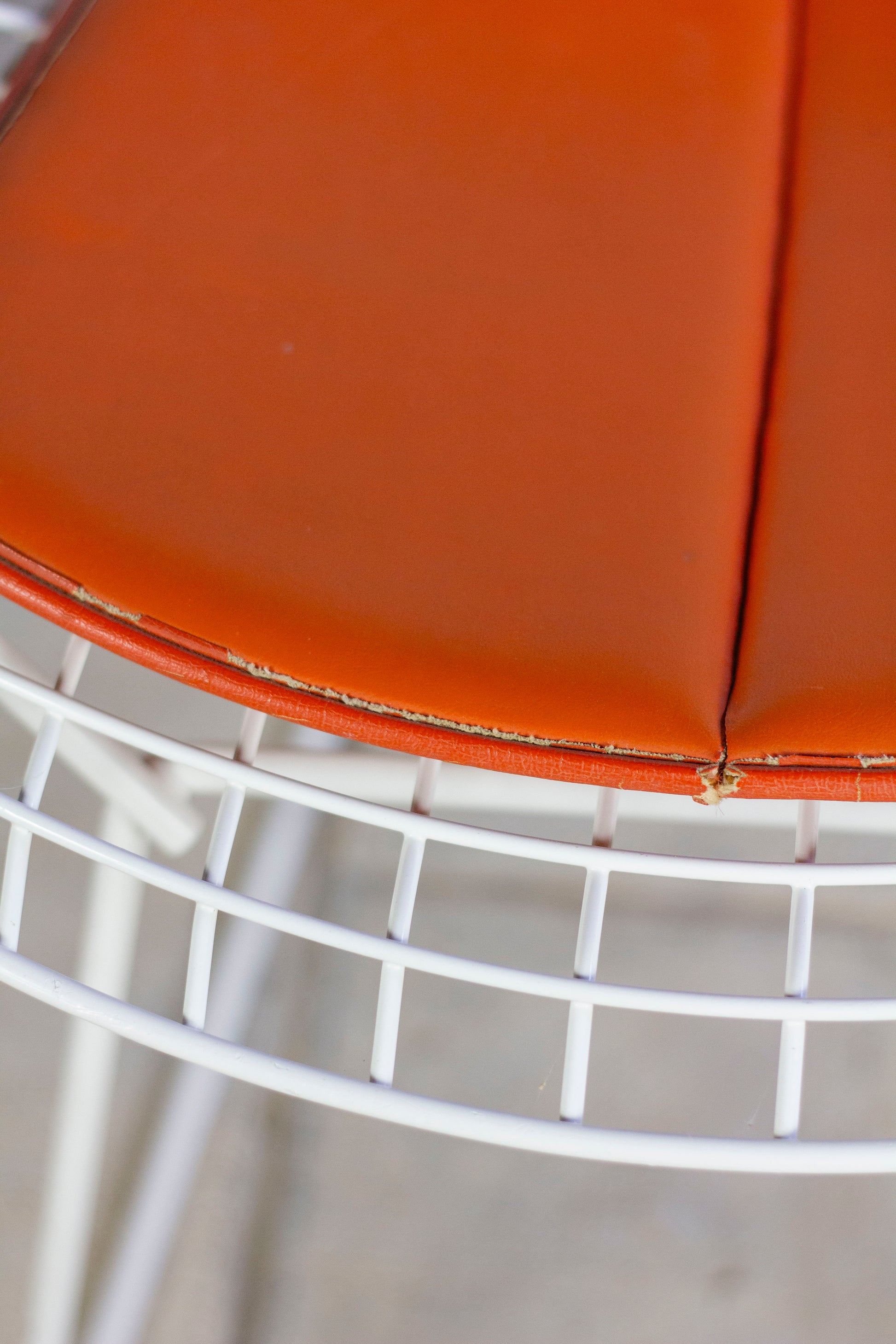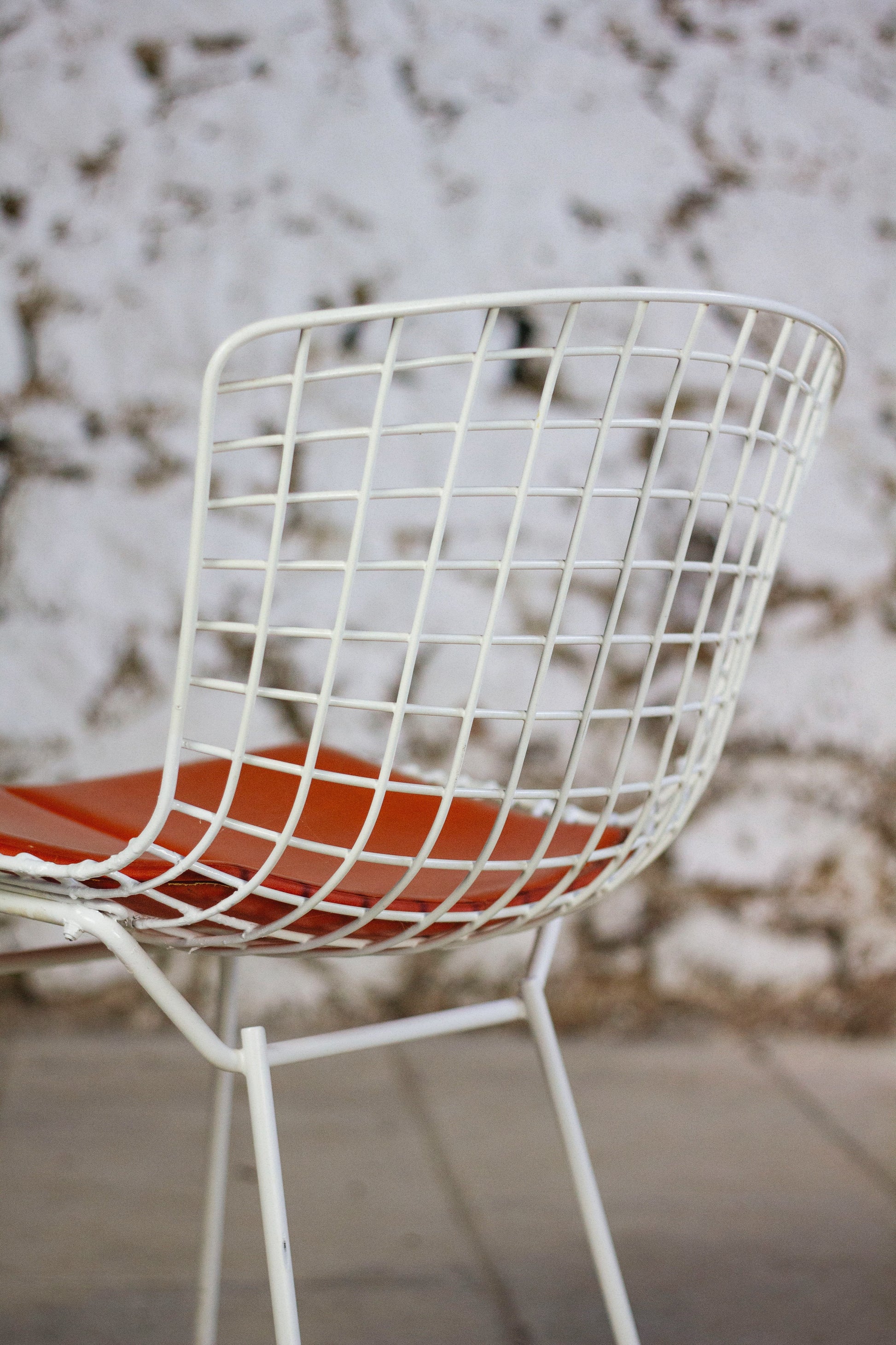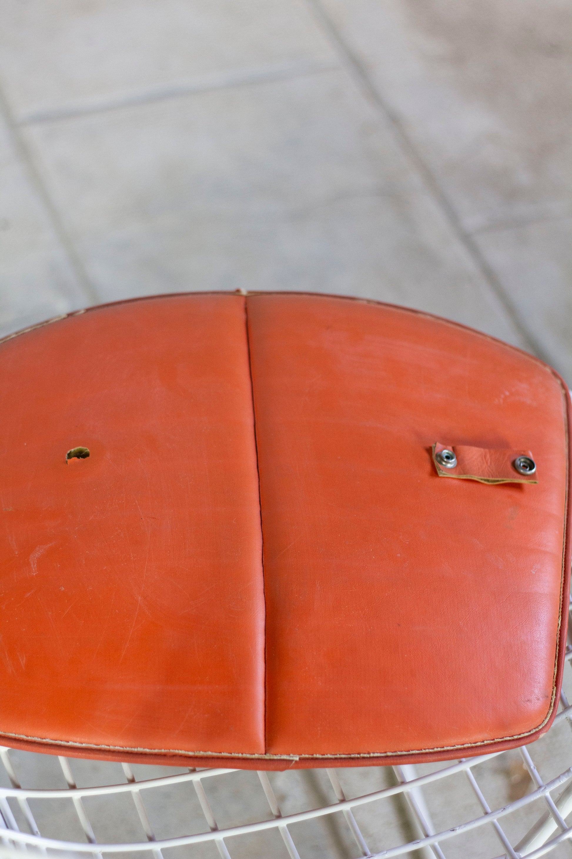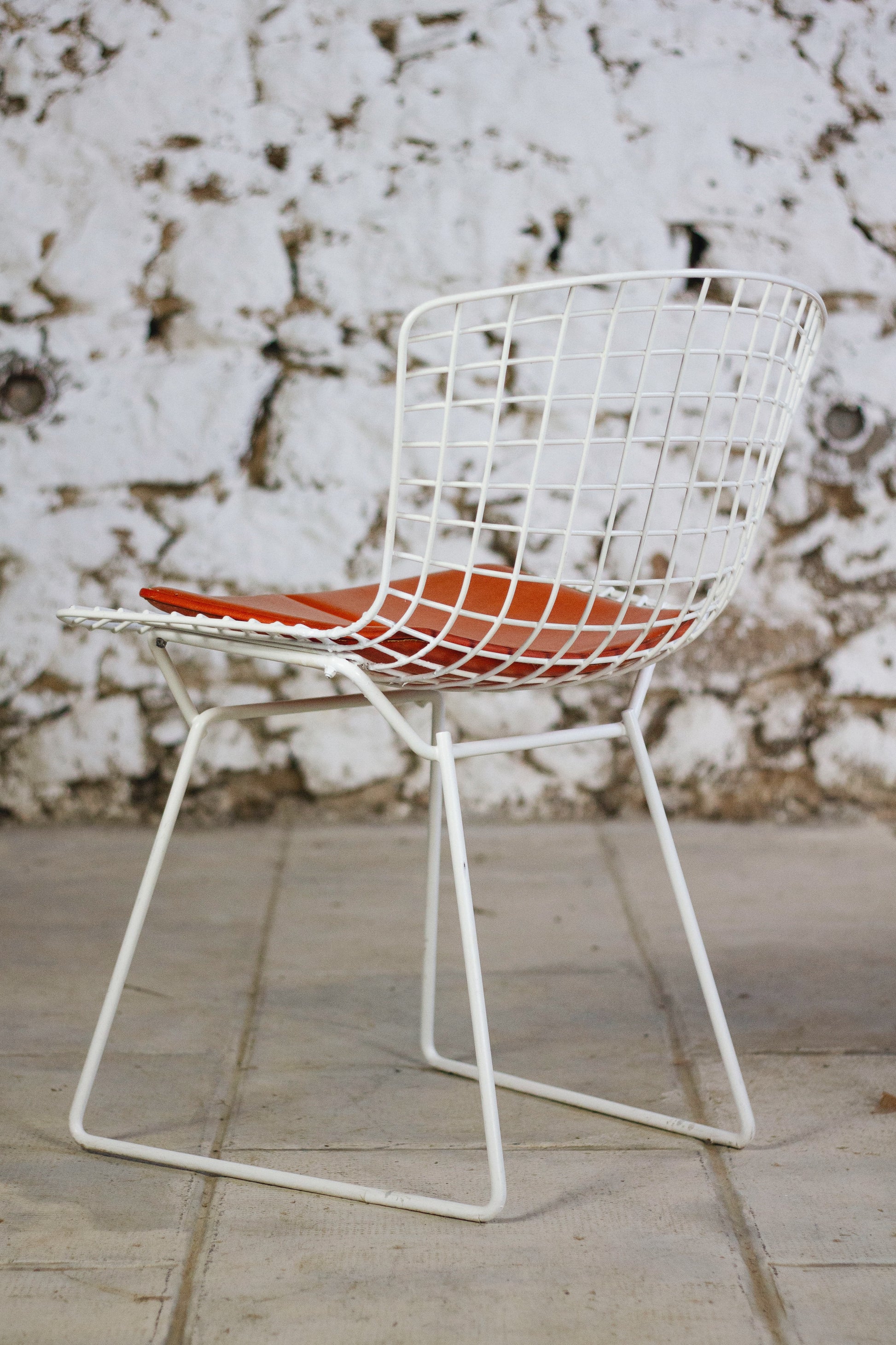 Très belle chaise Wire par Harry Bertoia, version blanche avec galette en skaï orange. Une pièce design qui donnera du pep's à votre intérieur. Rare dans cette version avec la galette d'origine.