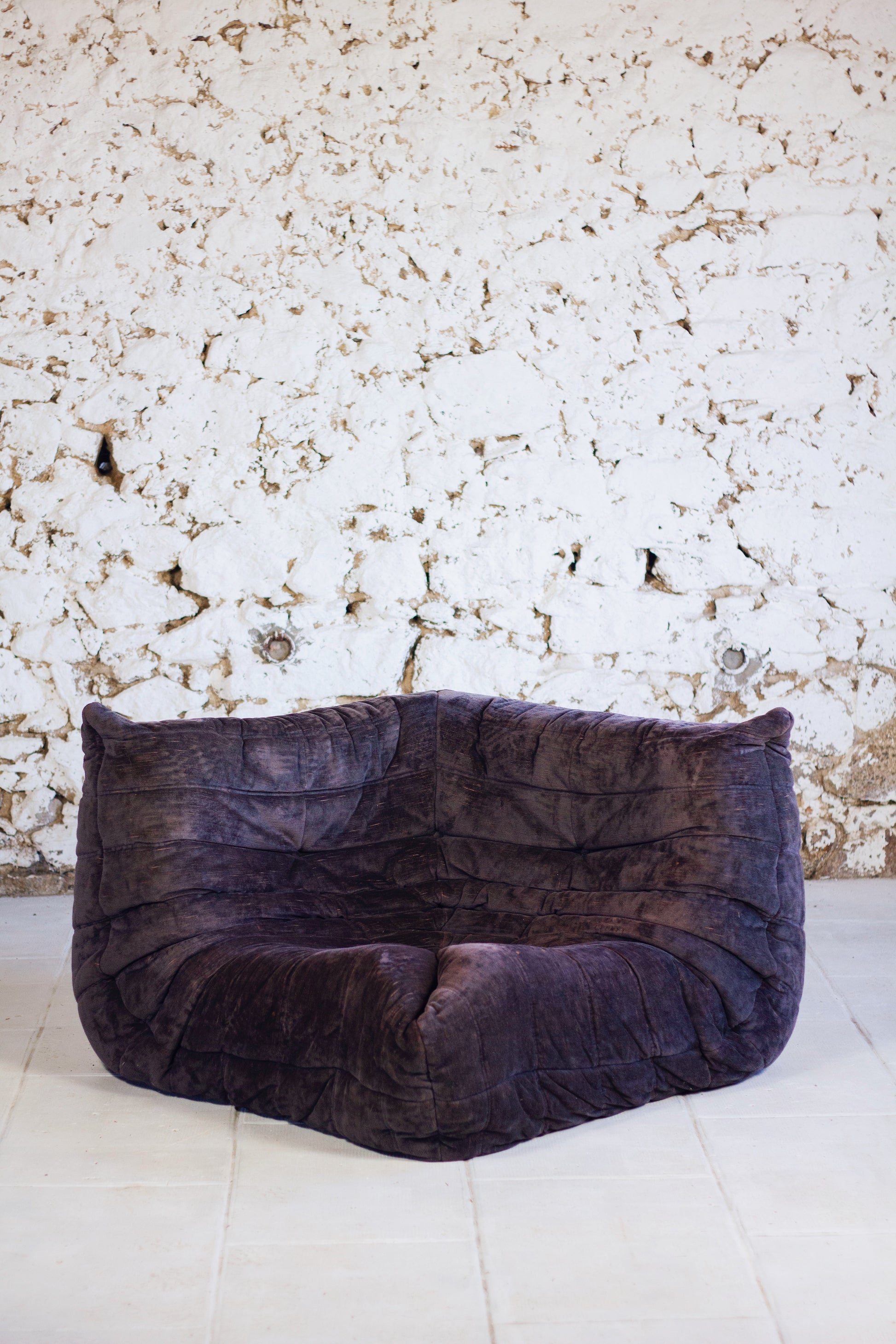 Chauffeuse d'angle Togo conçue par Michel Ducaroy pour Ligne Roset dans les années 1970. Magnifique première édition des années 70 présentée ici dans une version en velours rasé aubergine.
