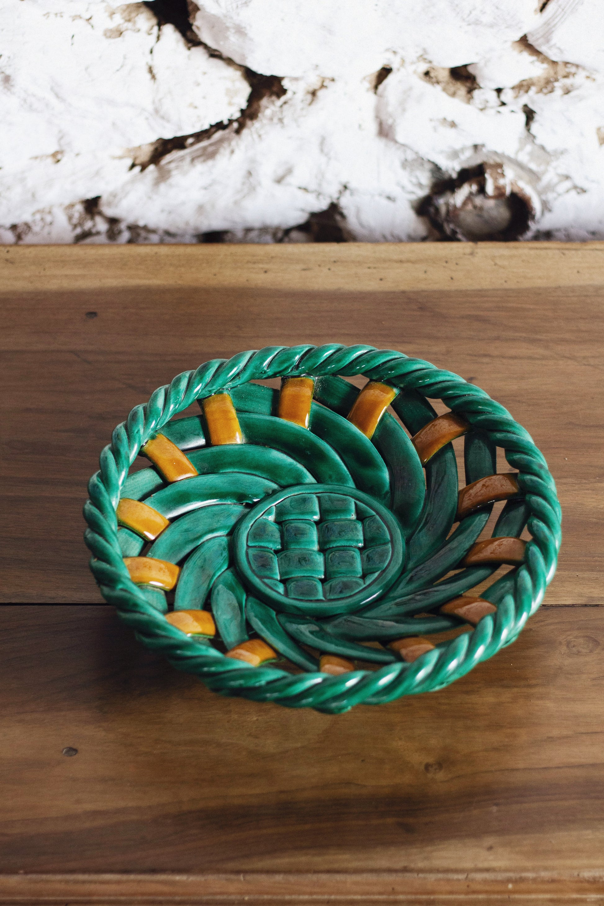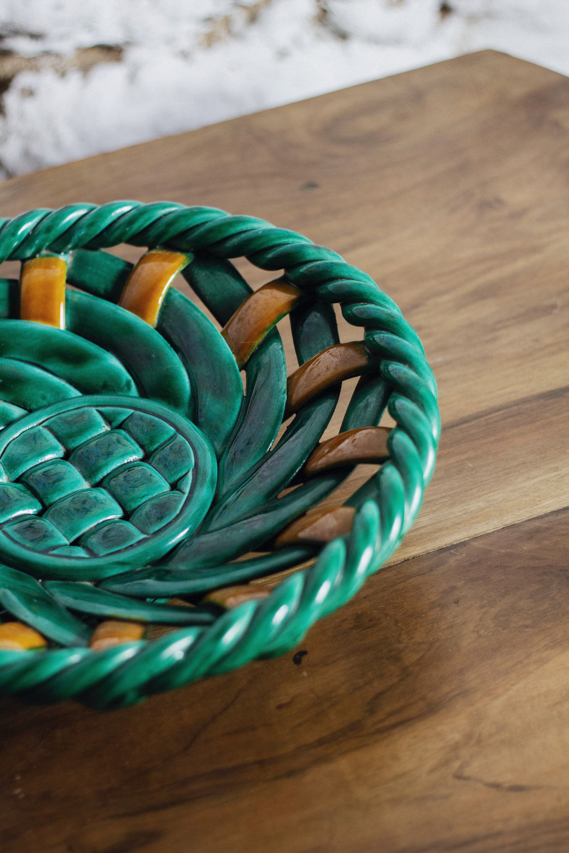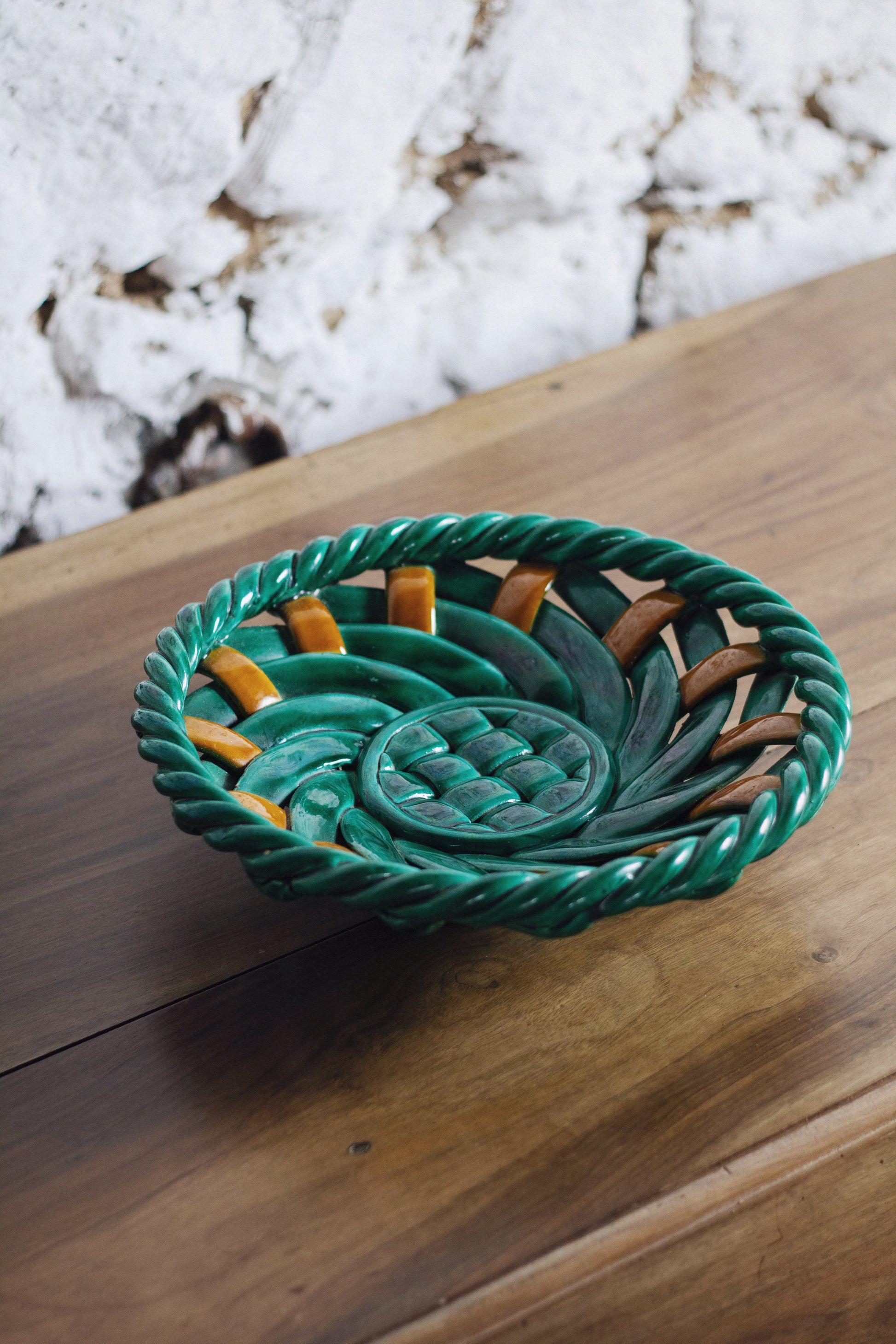Coupe à fruit en céramique ou barbotine tressée des années 70 par Vallauris. Couleur et tressage tendance.