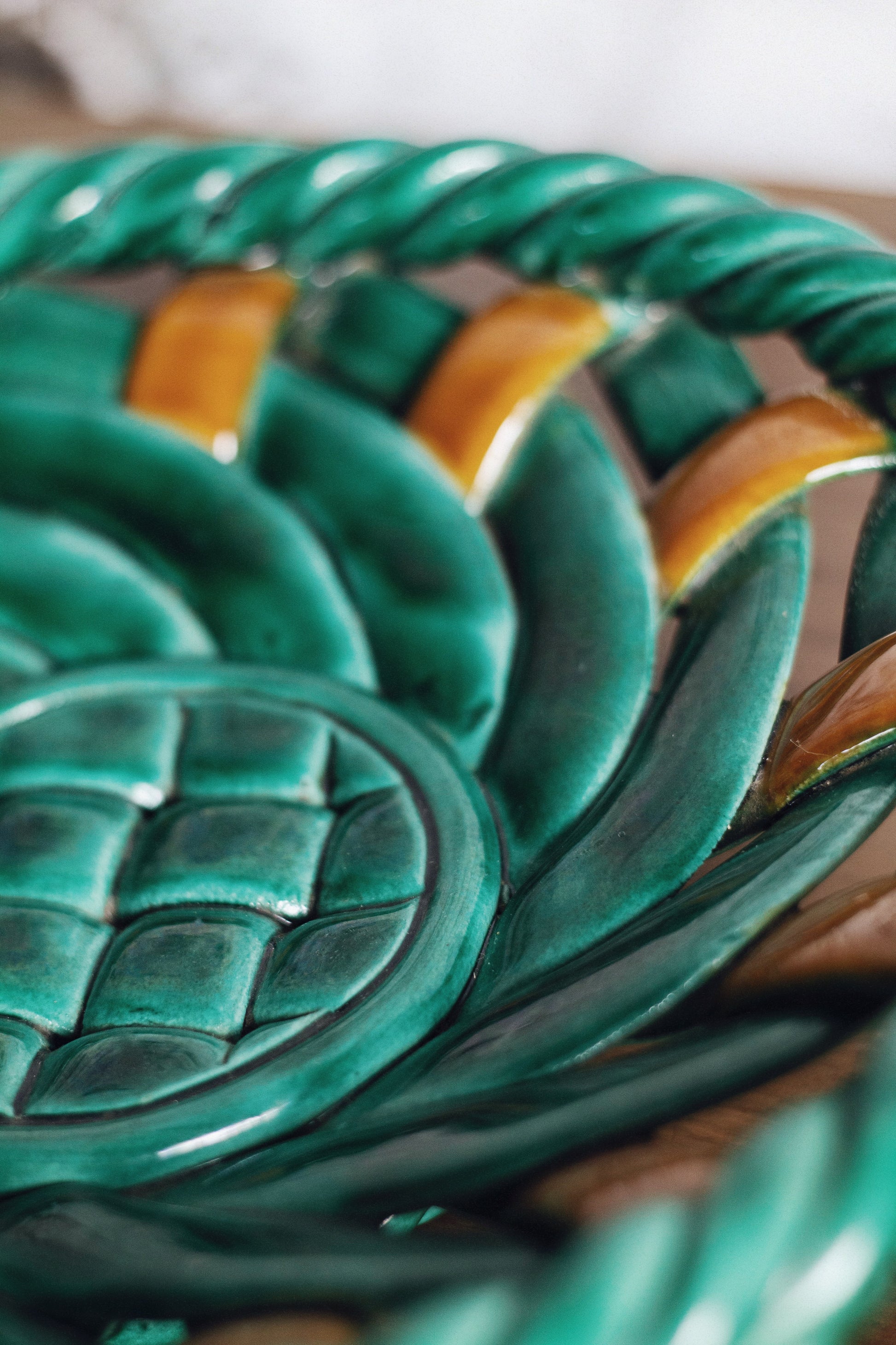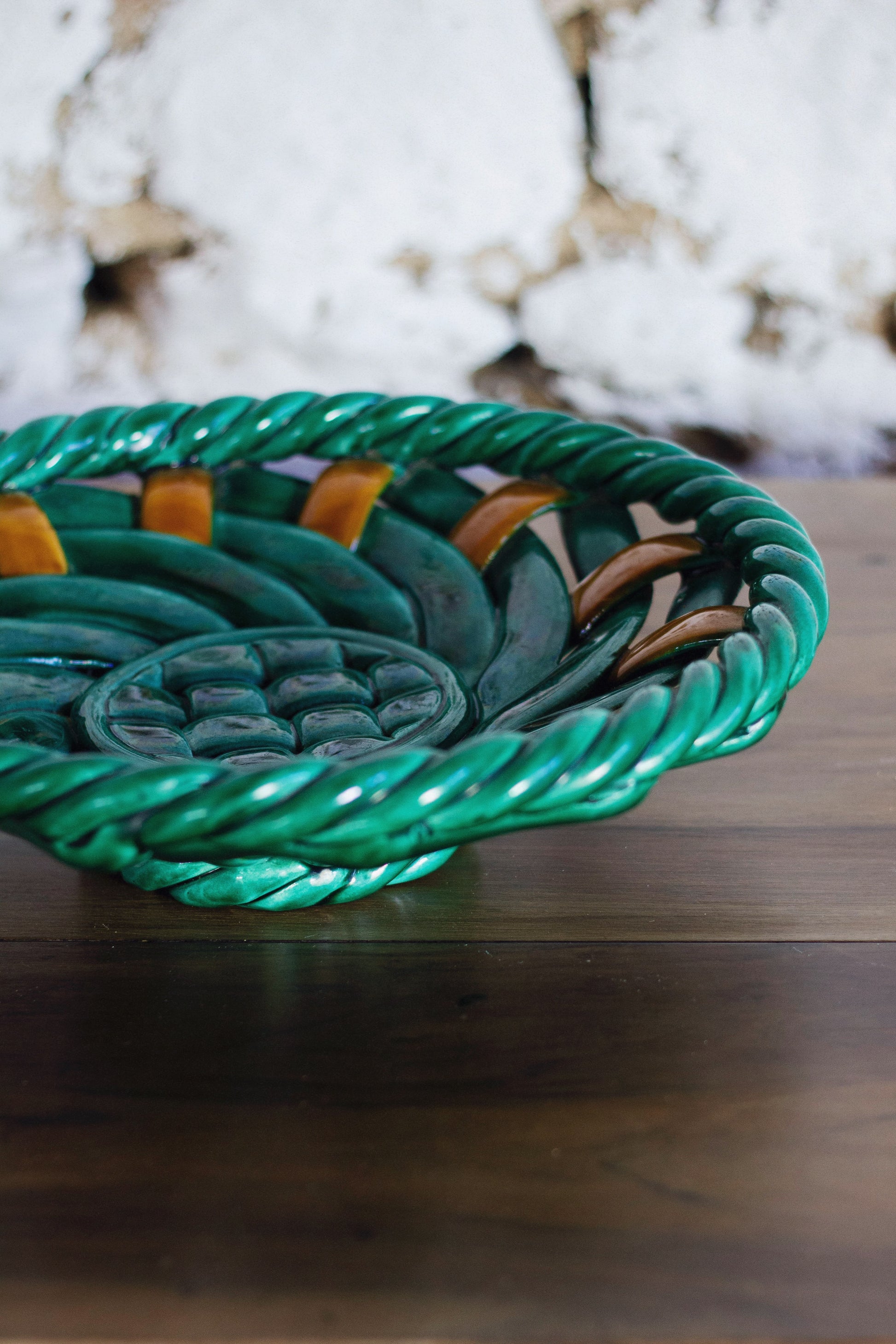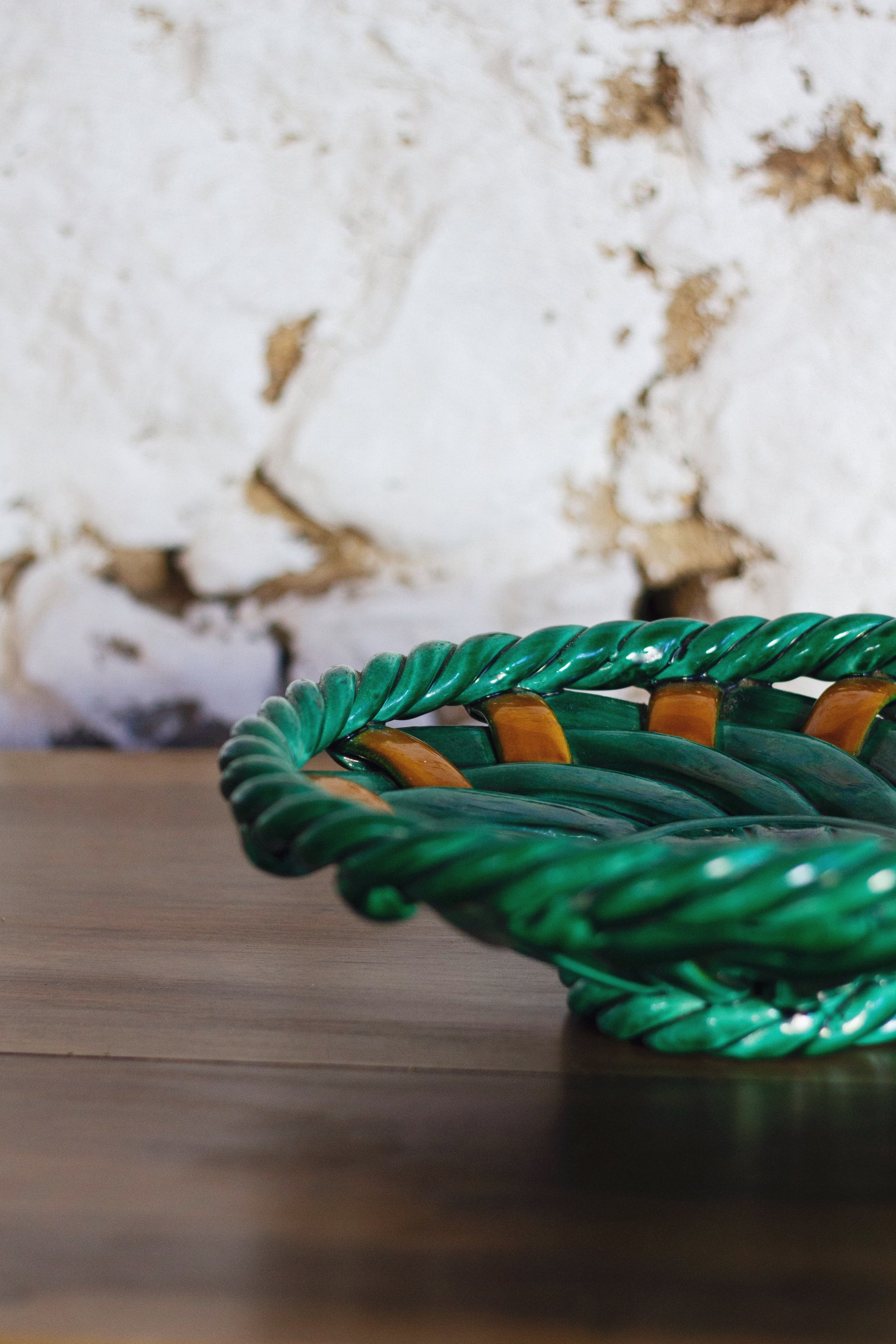 Coupe à fruit en céramique ou barbotine tressée des années 70 par Vallauris. Couleur et tressage tendance.