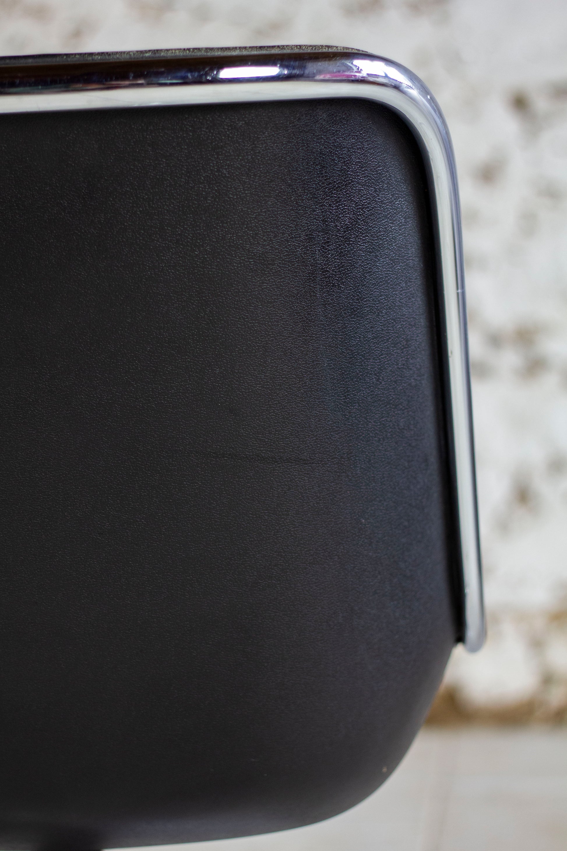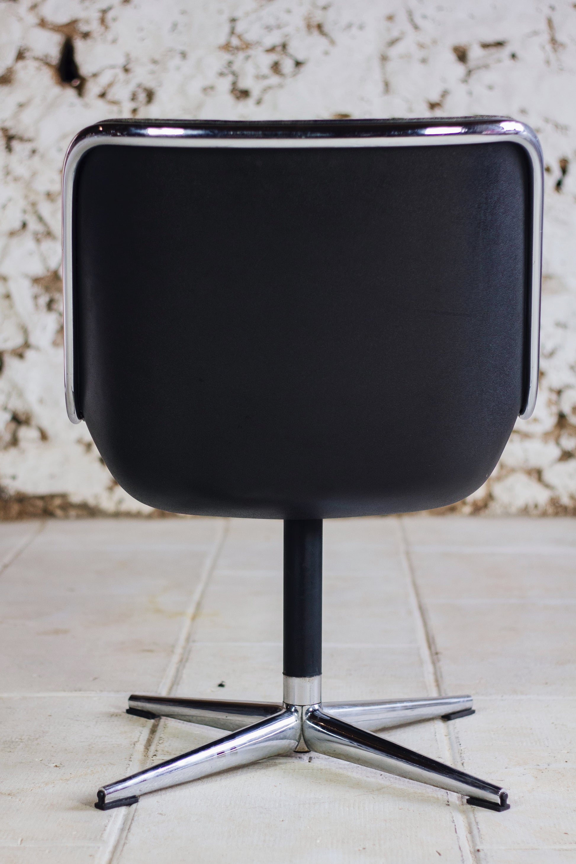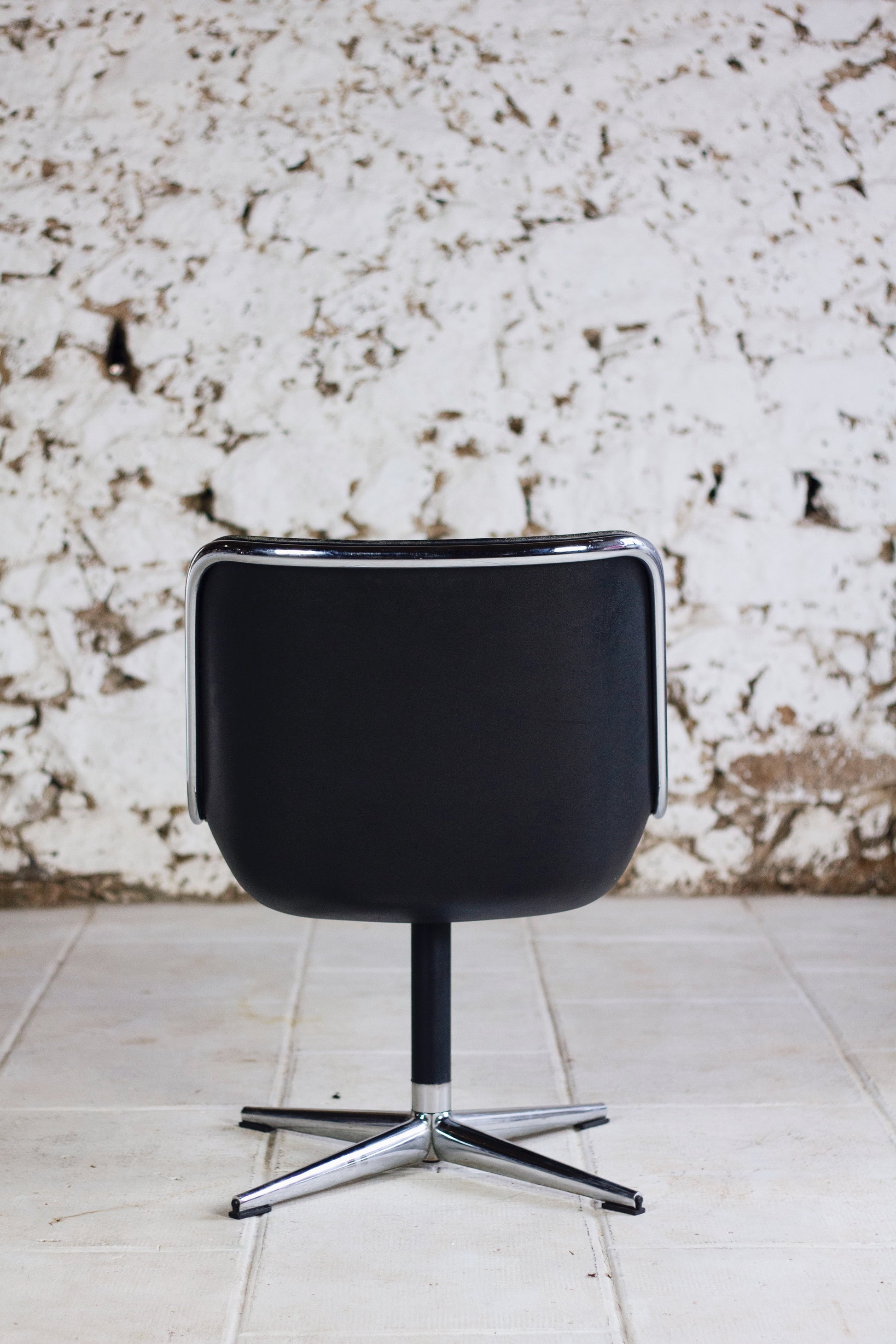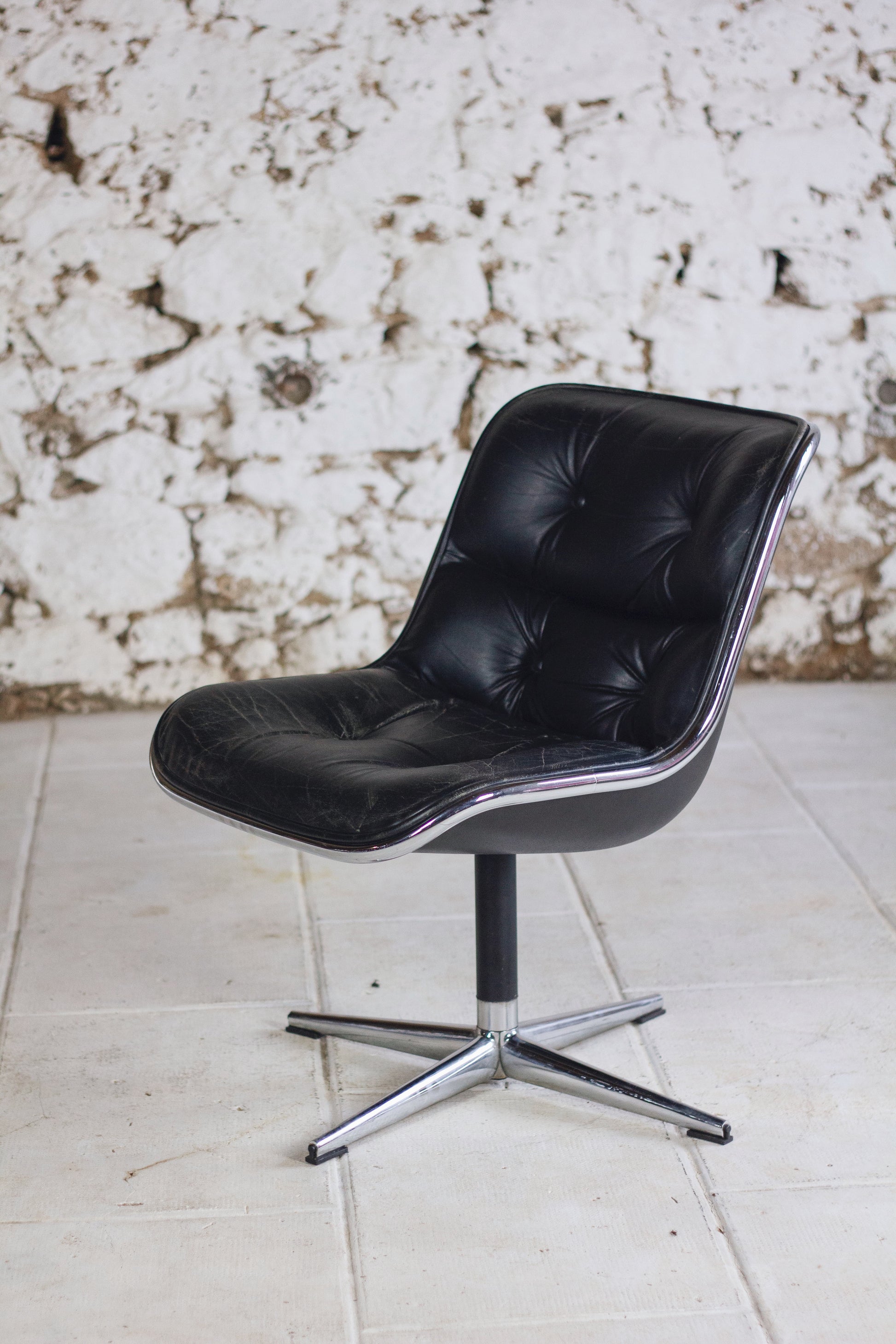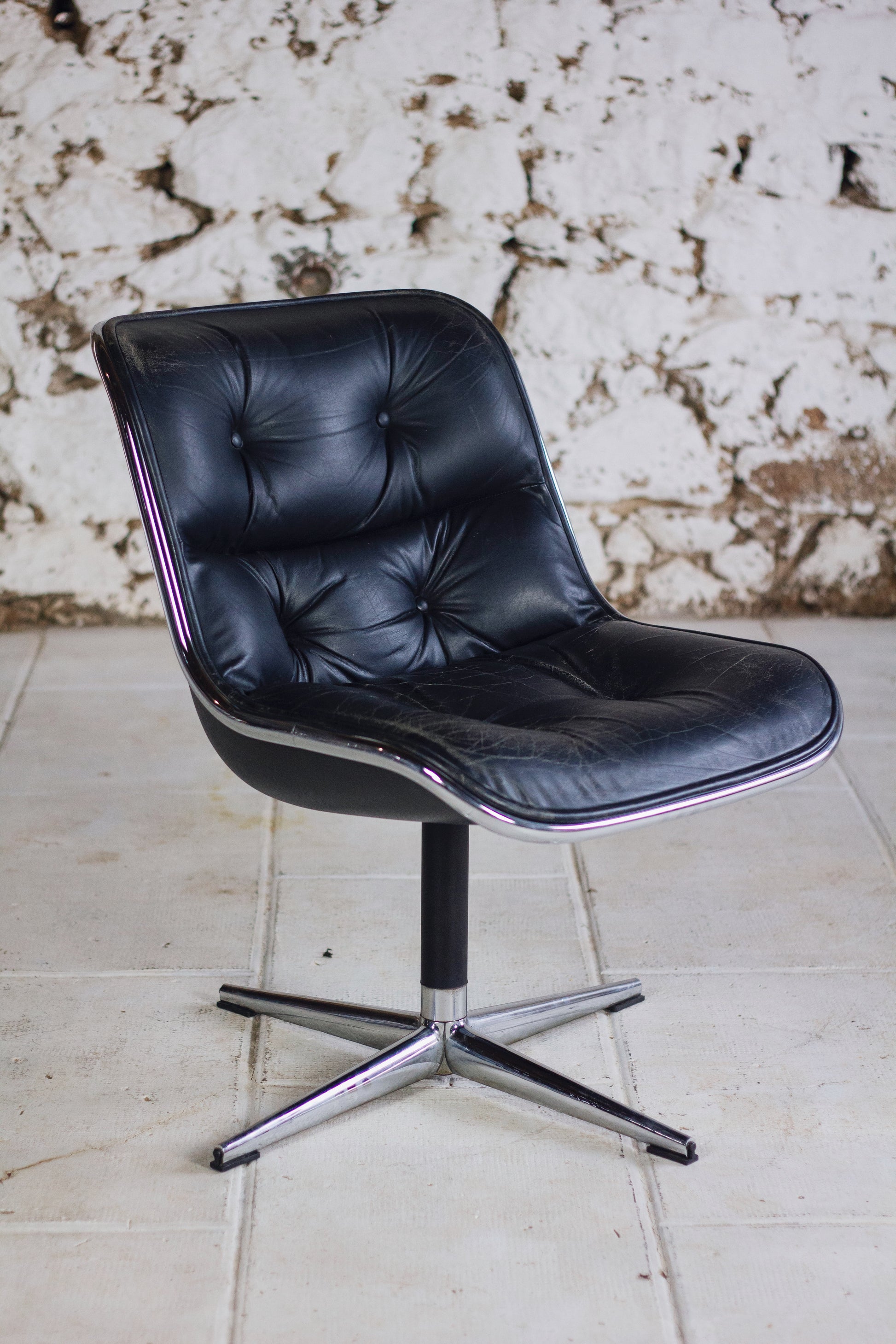 Fauteuil "Executive chair" par Charles Pollock pour Knoll. Sublime édition des années 60 en version en cuir noir avec piètement 4 branches. Coque en polycarbonate et piètement en inox poli. Idéal pour amateurs de design. Utilisable comme fauteuil de bureau ou bien pour un petit salon autour d'une coffee table.