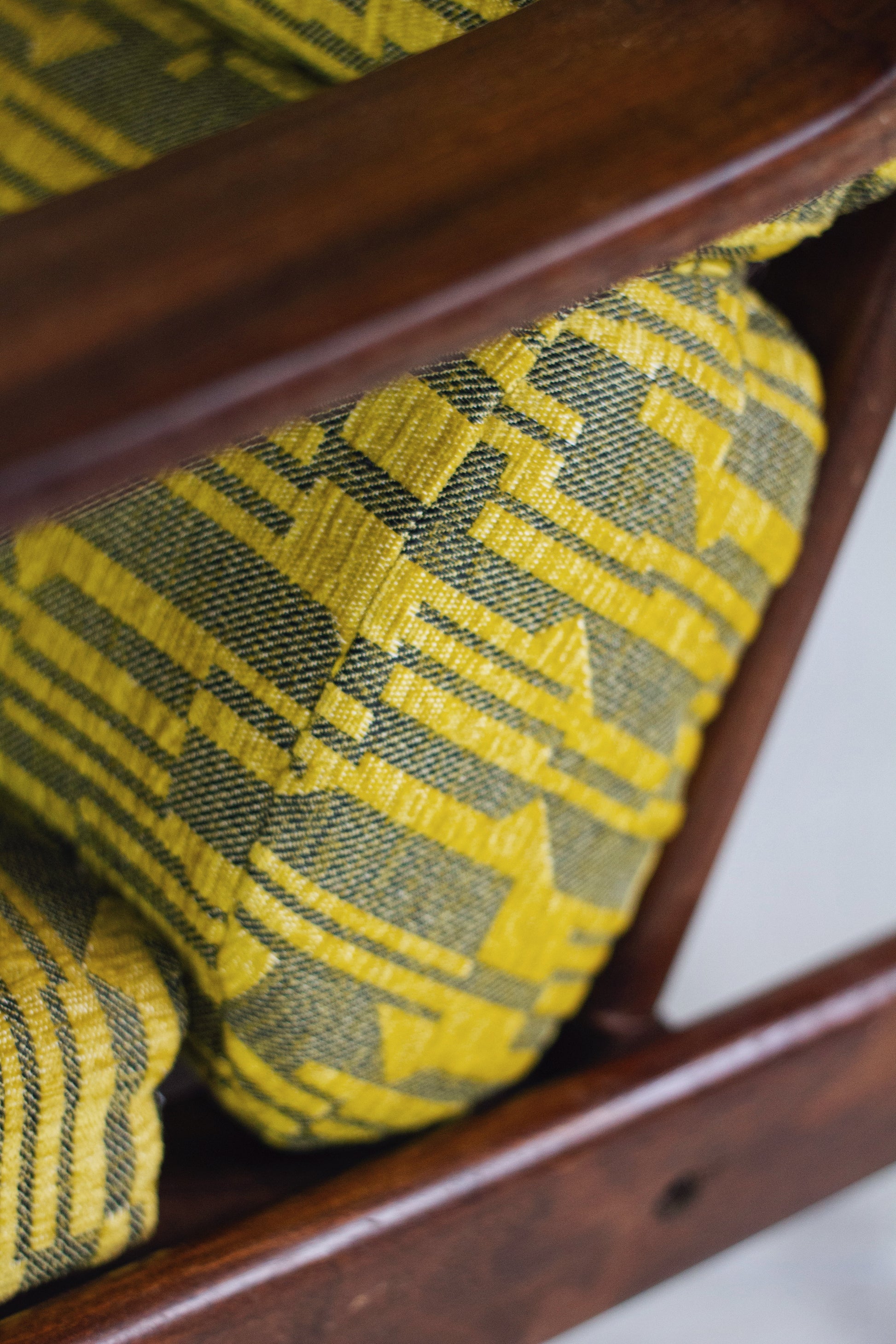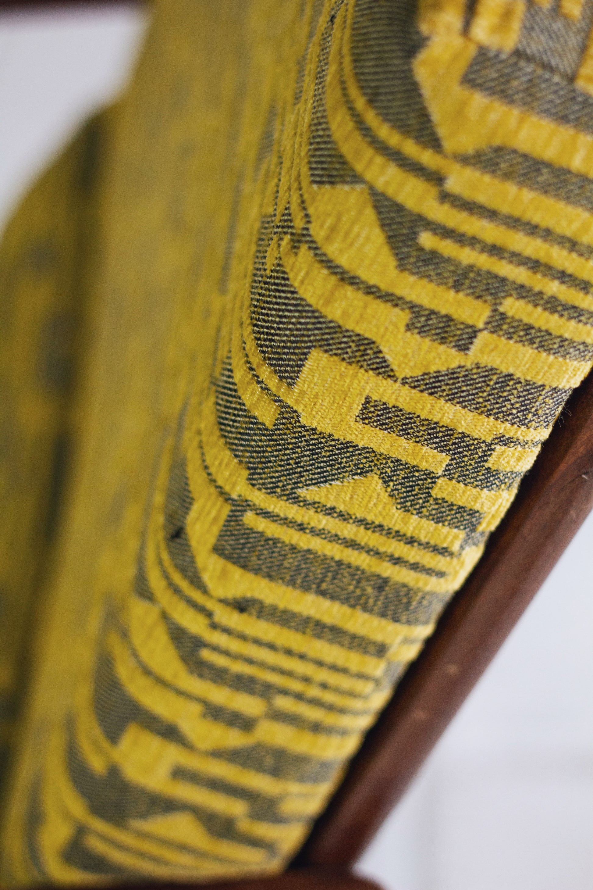 Fauteuil scandinave danois en teck et coussins en laine, datant des années 60. Très beau tissu en jacquard de laine jaune à motifs géométriques. Structure en teck massif avec travail du dossier laissant visible le tissu de l'arrière des coussins. Sublimes lignes et courbes au niveau des accoudoirs. Design intemporel et élégant.
