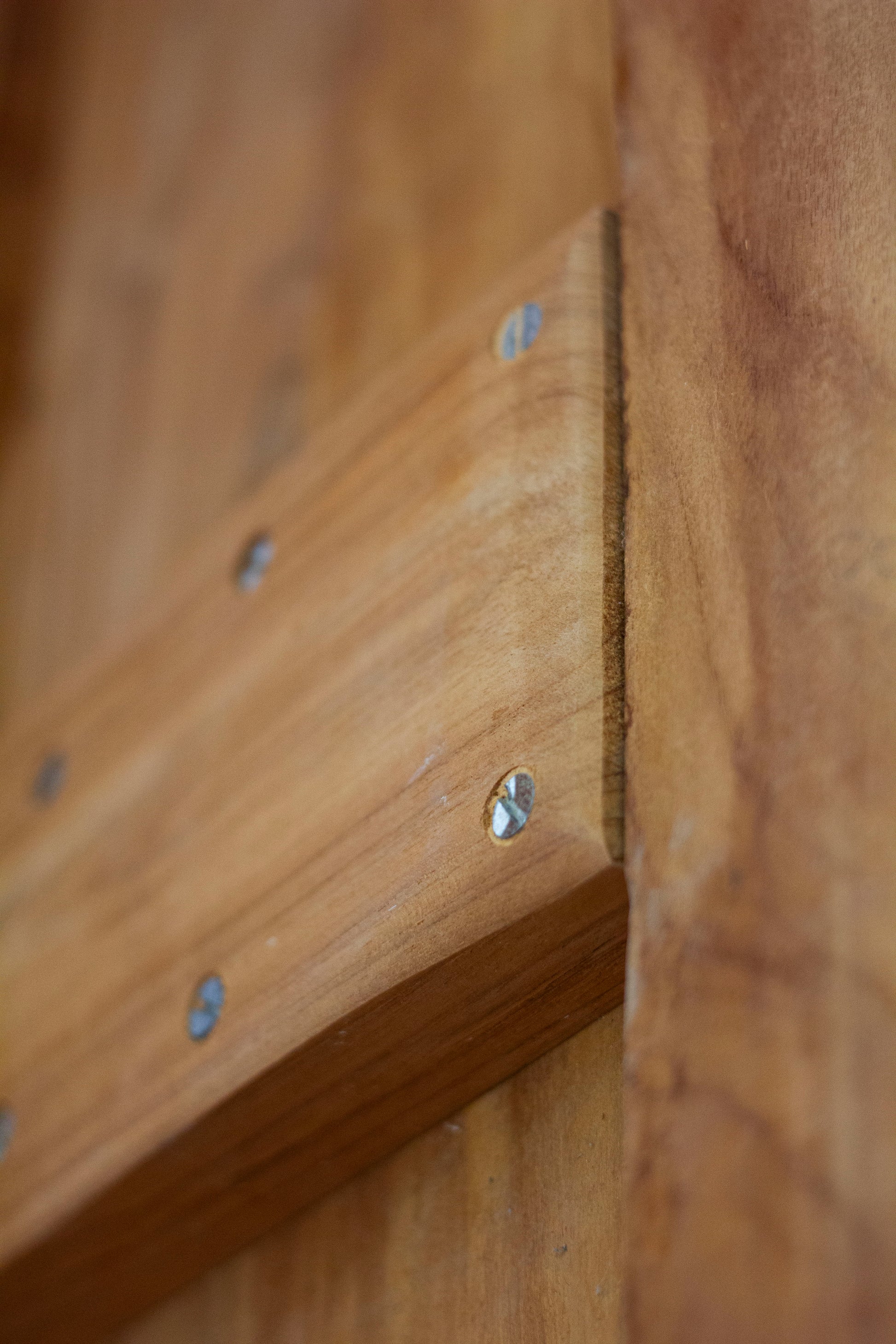 La table est dotée de deux pieds en bois massif et d'un plateau fixe d'un seul tenant. L'ensemble est fixé grâce à un grand linteau en bois au dessous du plateau. Cette table pourrait également très bien servir dans un bureau pour les réunions.