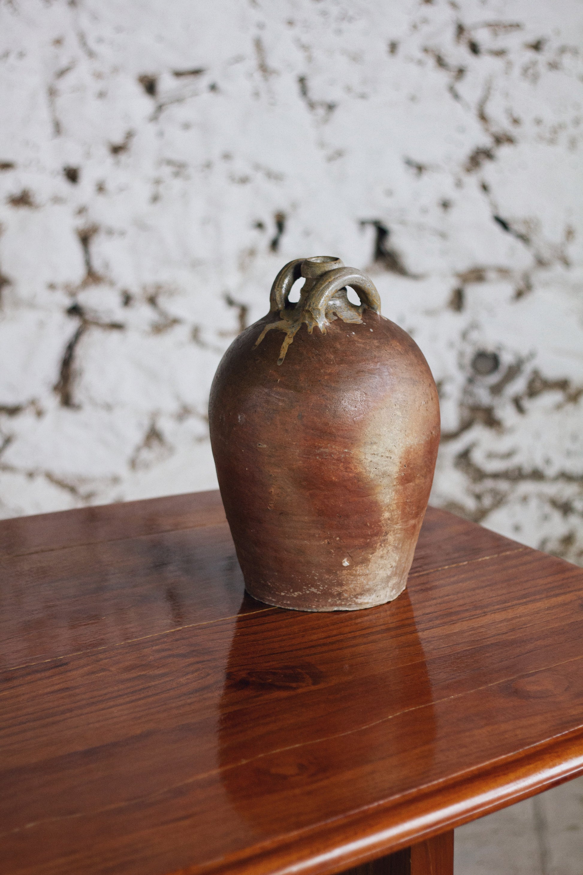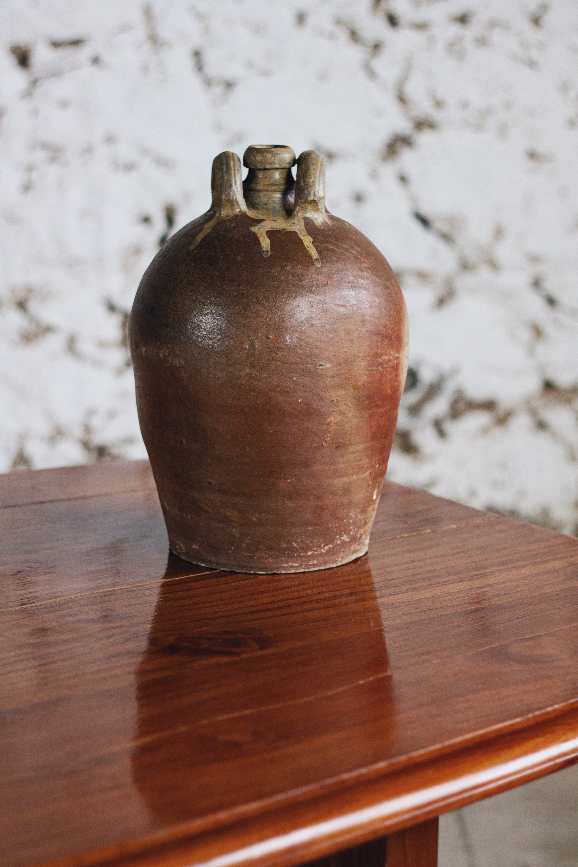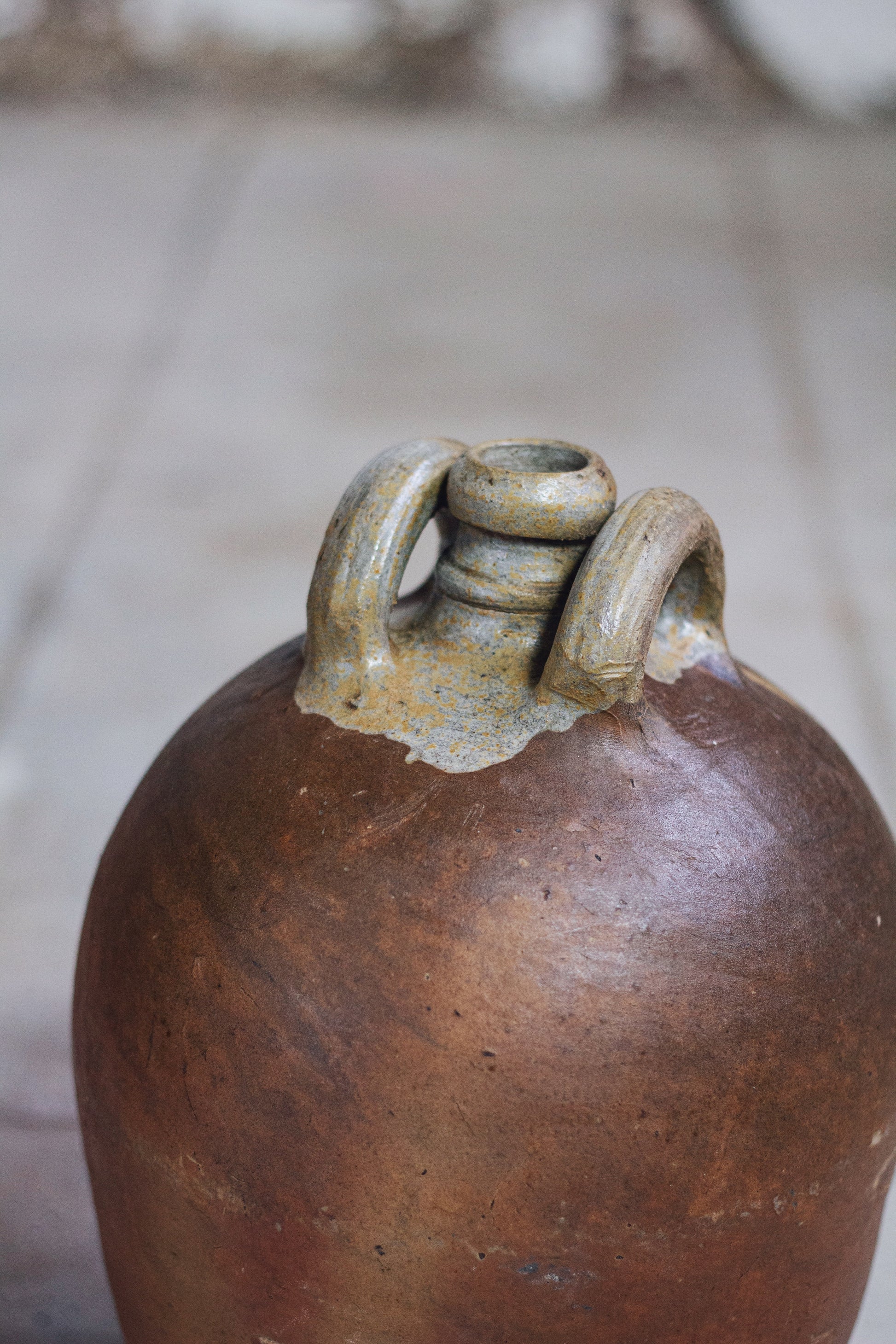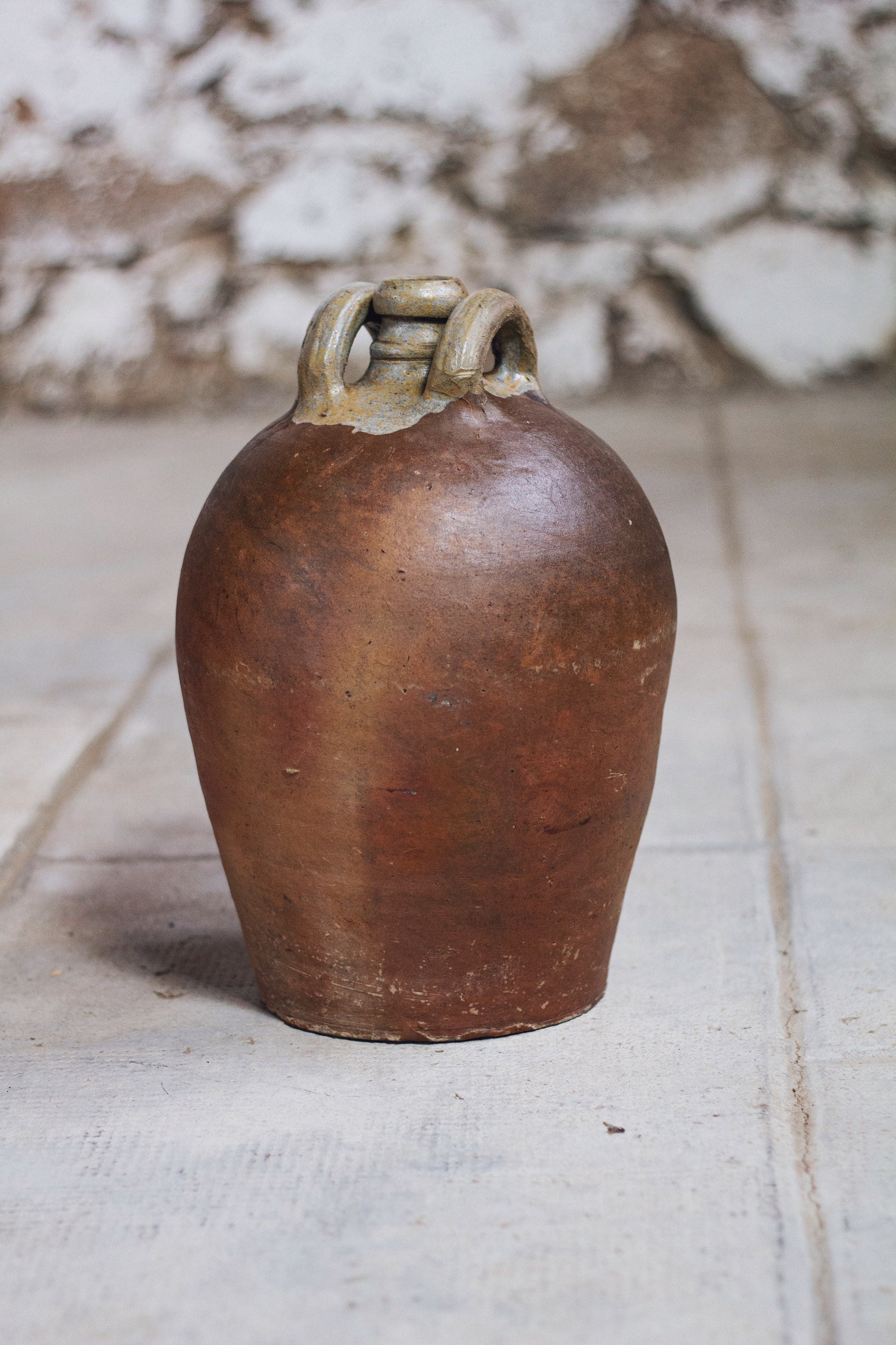 Authentique jarre ancienne à huile en terre cuite (grès). Deux anses. Fabrication artisanale du XIXe siècle, début XXe. Magnifique patine du temps qui lui donne beaucoup de variantes de couleurs, de dégradés et d'aspérités. Une pièce de caractère qui apportera de l'authenticité dans une maison de campagne, un intérieur wabi sabi ou méditérannéen.