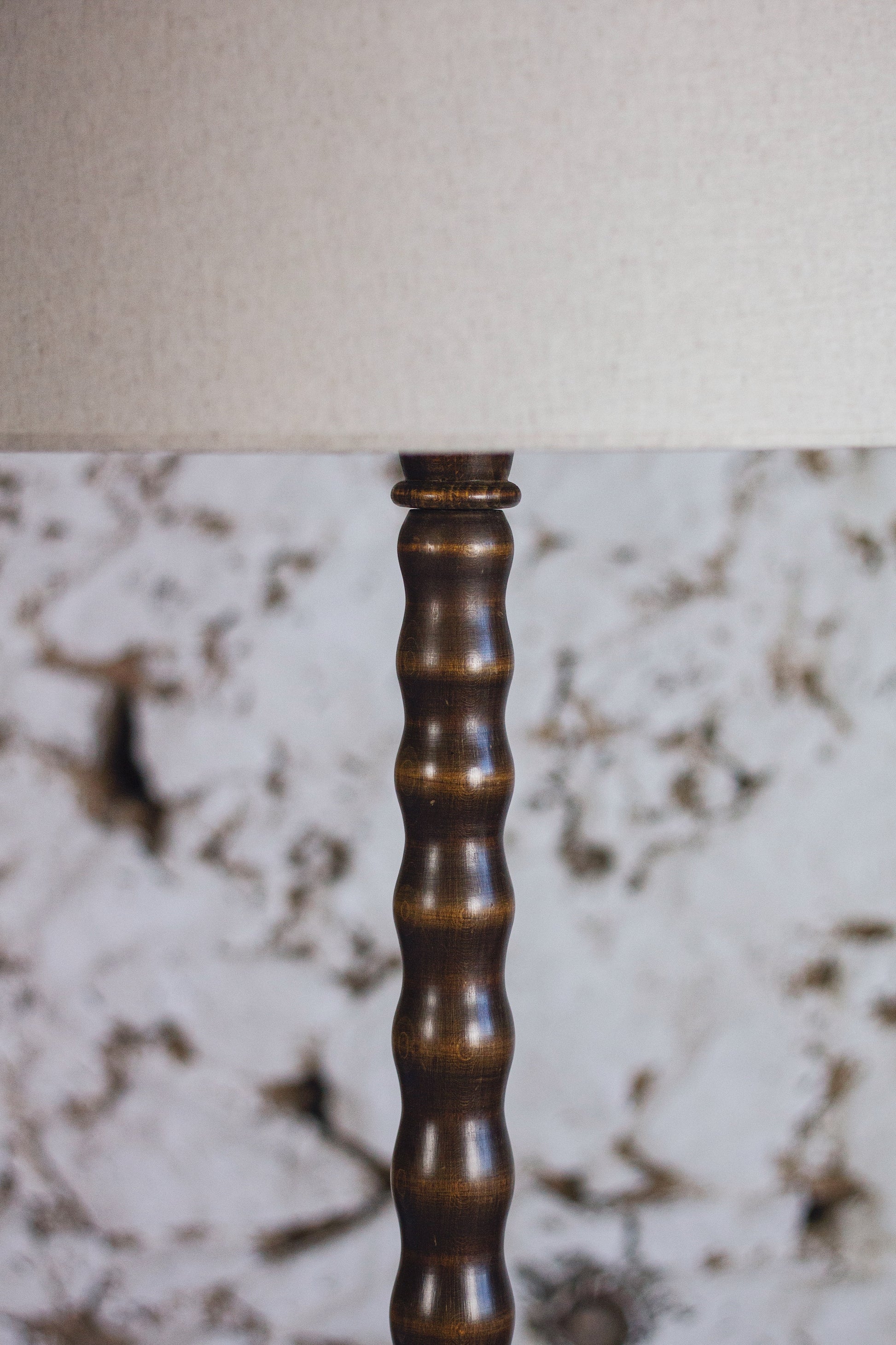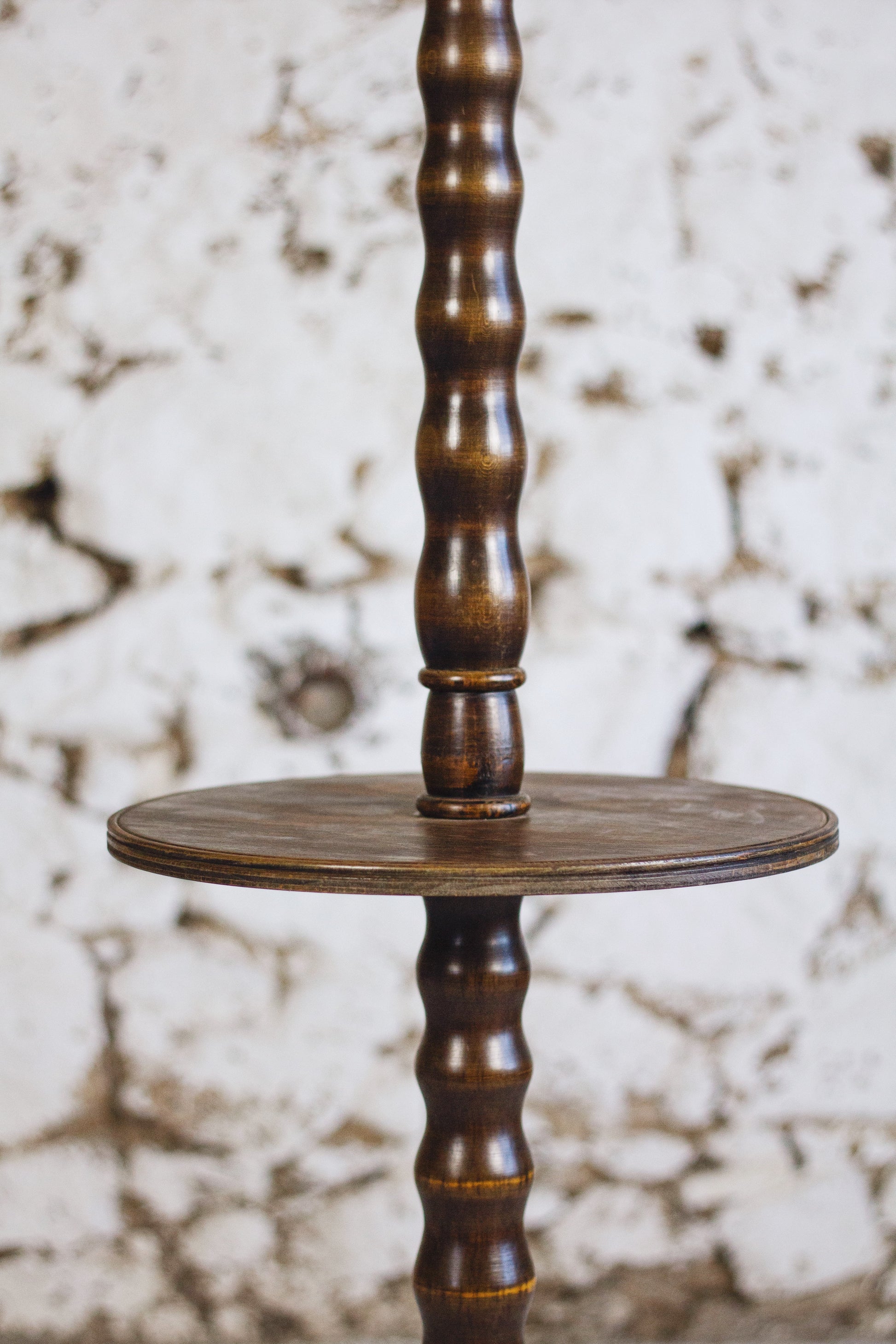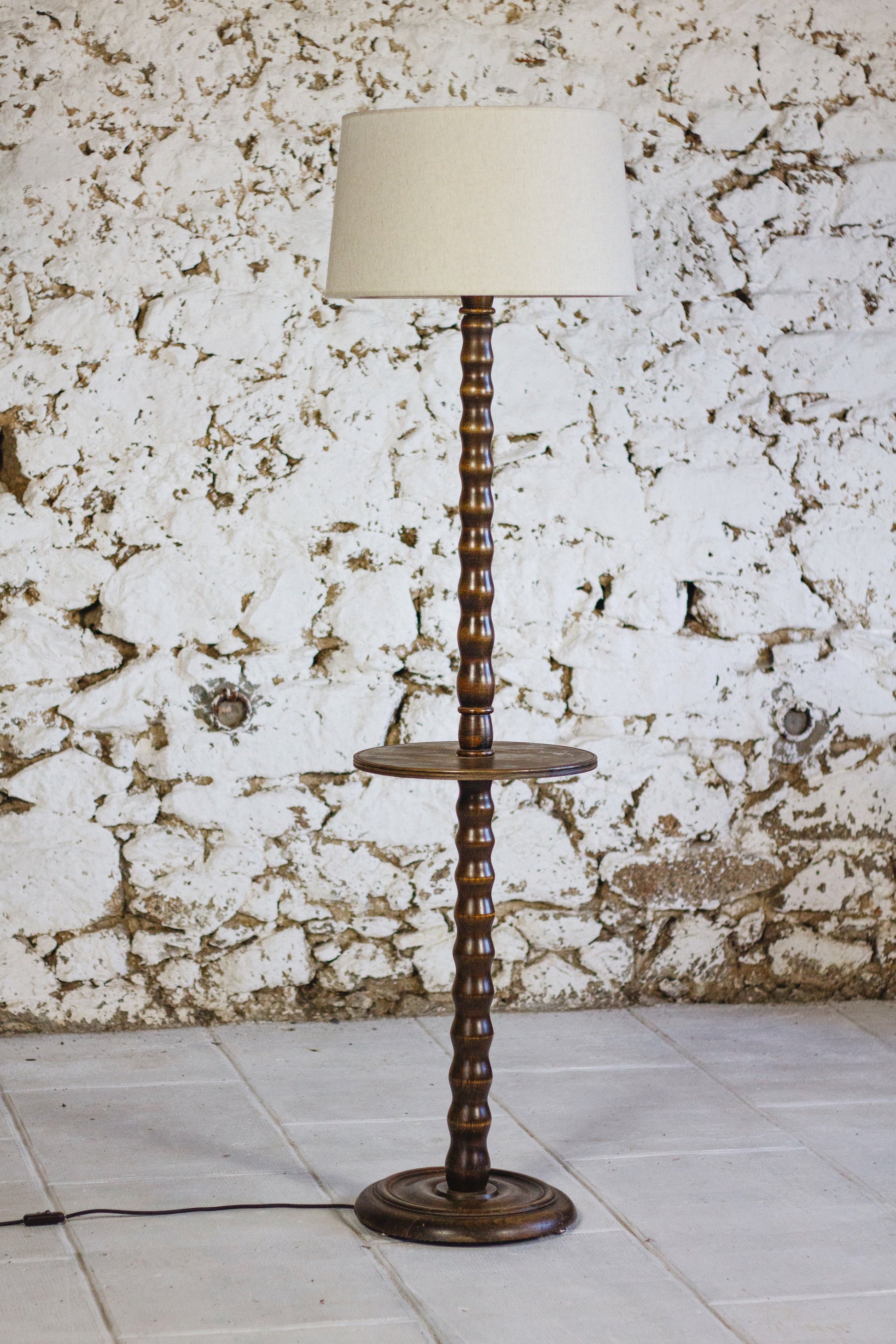 Ce lampadaire allie fonctionnalité et esthétique avec un design sculptural en bois massif. Son pied est caractérisé par un travail du bois perlé, typique de l’artisanat du début du XXe siècle, évoquant le travail du bois tourné de Charles Dudouyt. Une tablette circulaire intégrée à mi-hauteur apporte de la stabilité à la structure et de la praticité.