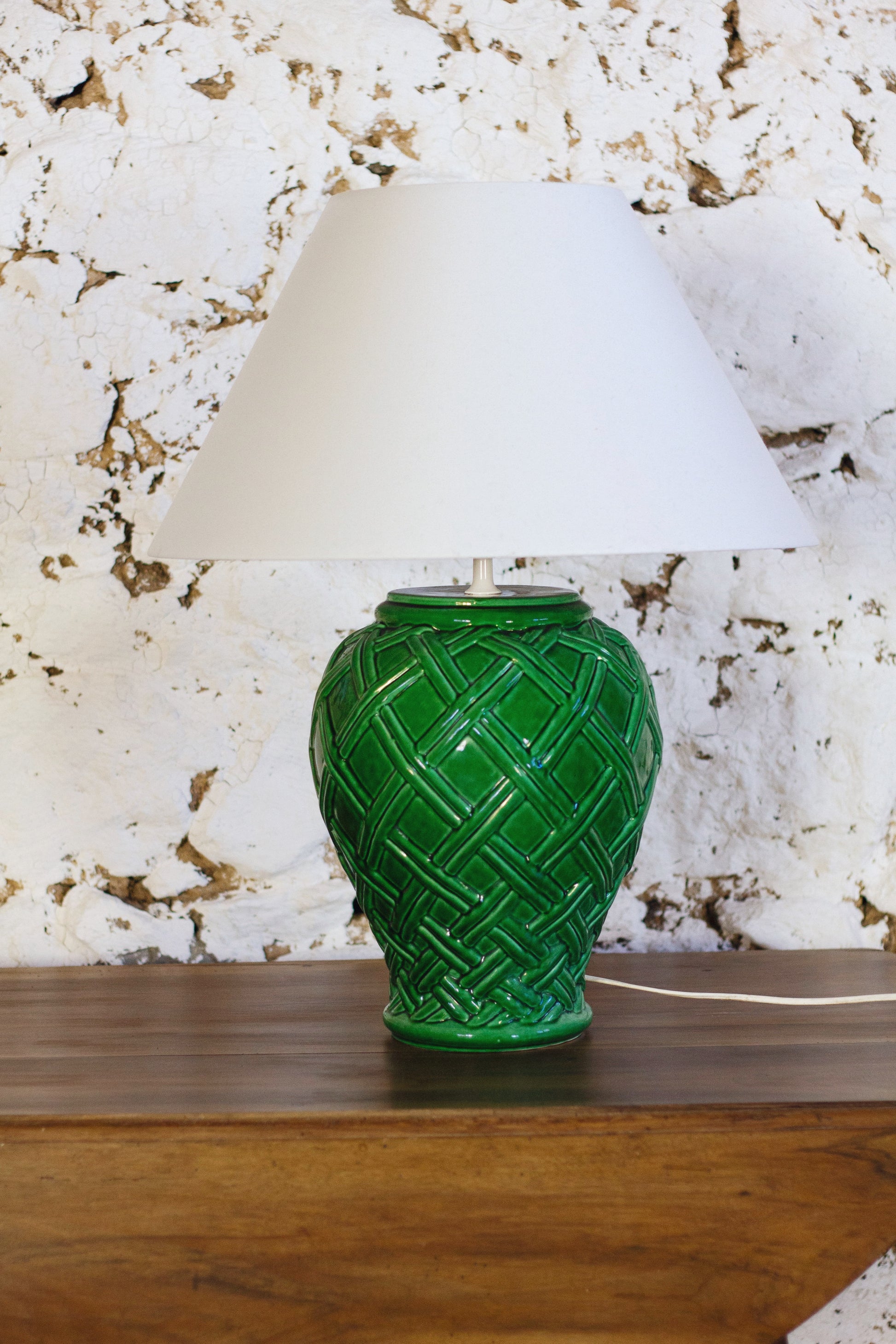 Jolie lampe à poser en faïence verte tressée et abat jour blanc. Couleur et tressage tendance.