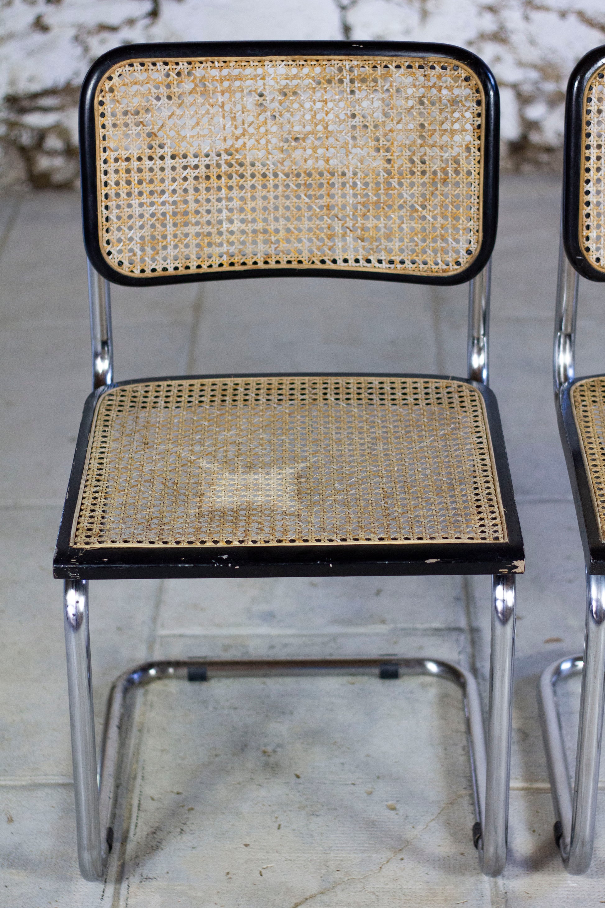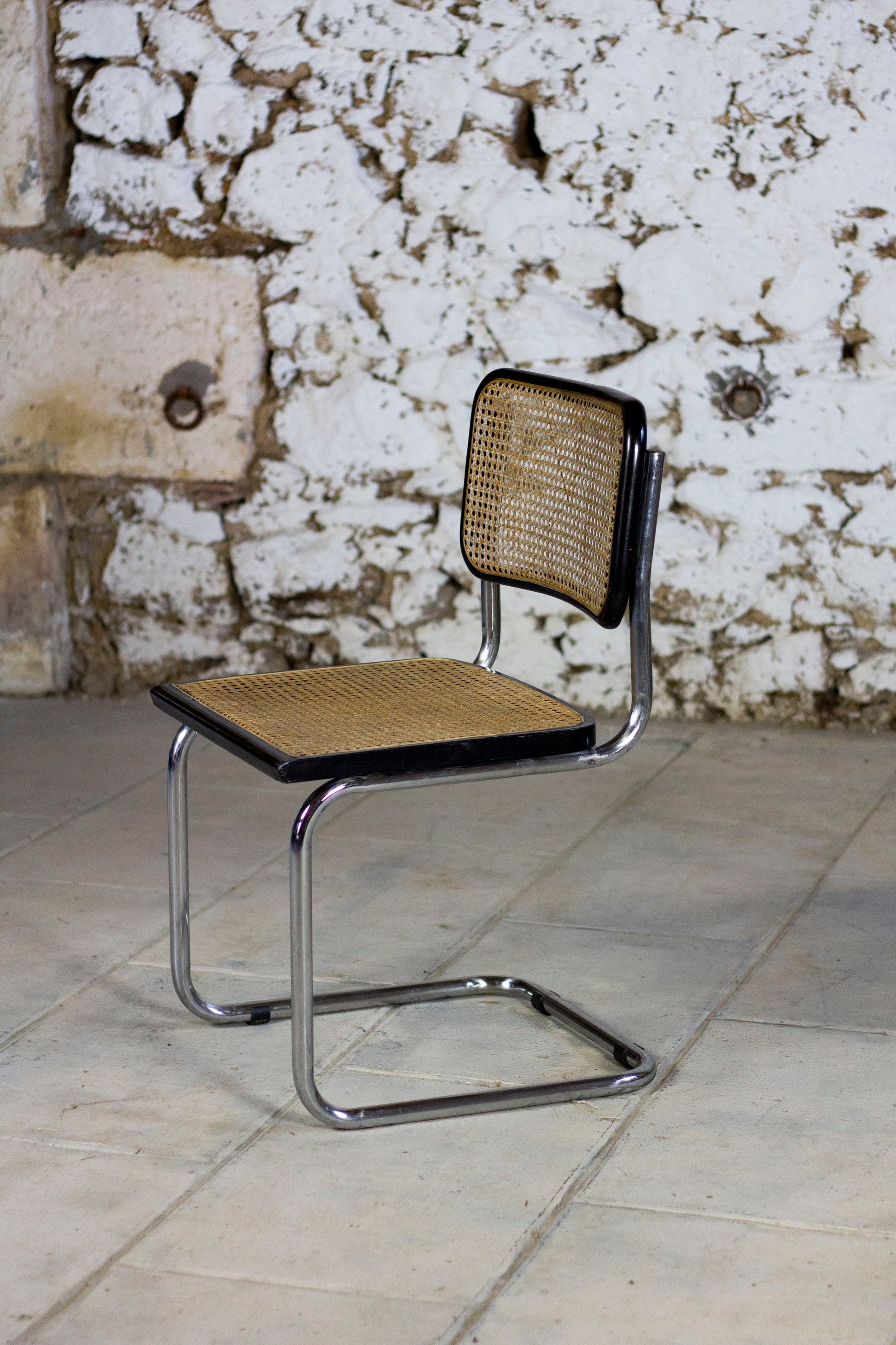 Chaise Cesca B32 par Marcel Breuer, éditée en Italie dans les années 1970. Cette édition présente une structure en acier chromé, un cadre en hêtre massif vernis noir avec un dossier et une assise en cannage.En créant les chaises Cesca, Marcel breuer a cherché à mieux célébrer l'acier tubulaire déjà utilisé pour la création du "wassily" ce qui le conduit à ce siège en porte-à-faux qui sera l'un des modèles les plus copiés du XXème siècle. La forme en porte-à-faux exploite les possibilités uniques de l'acier tubulaire et confère à la chaise plus de flexibilité et de confort.