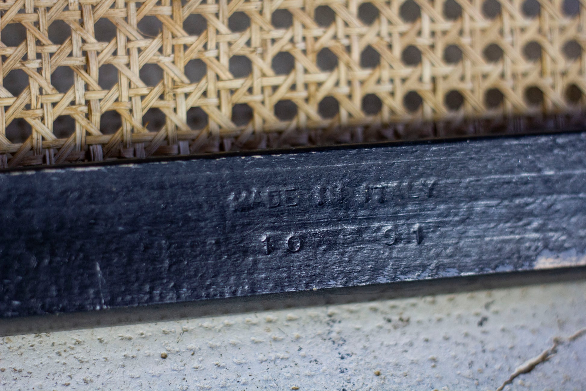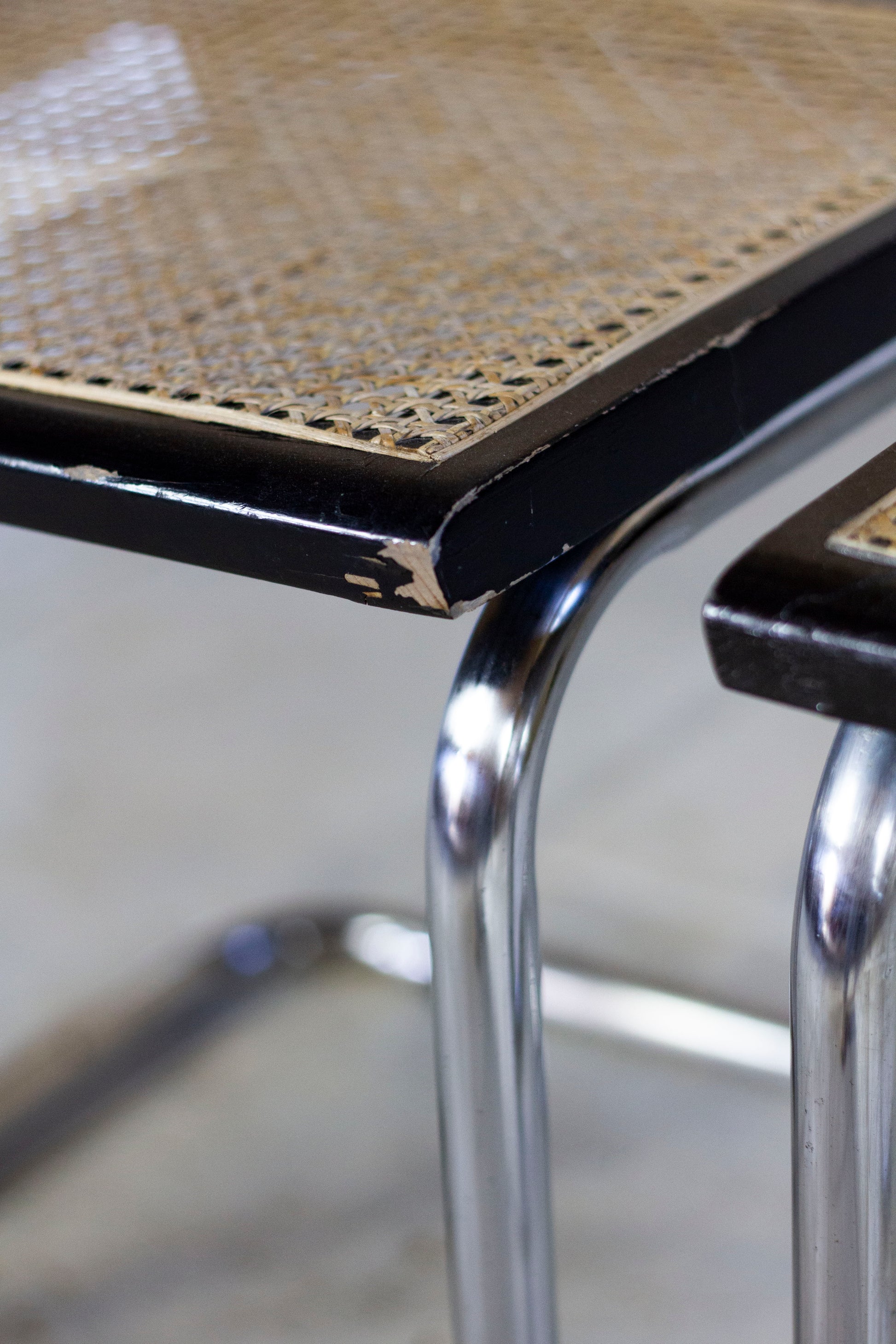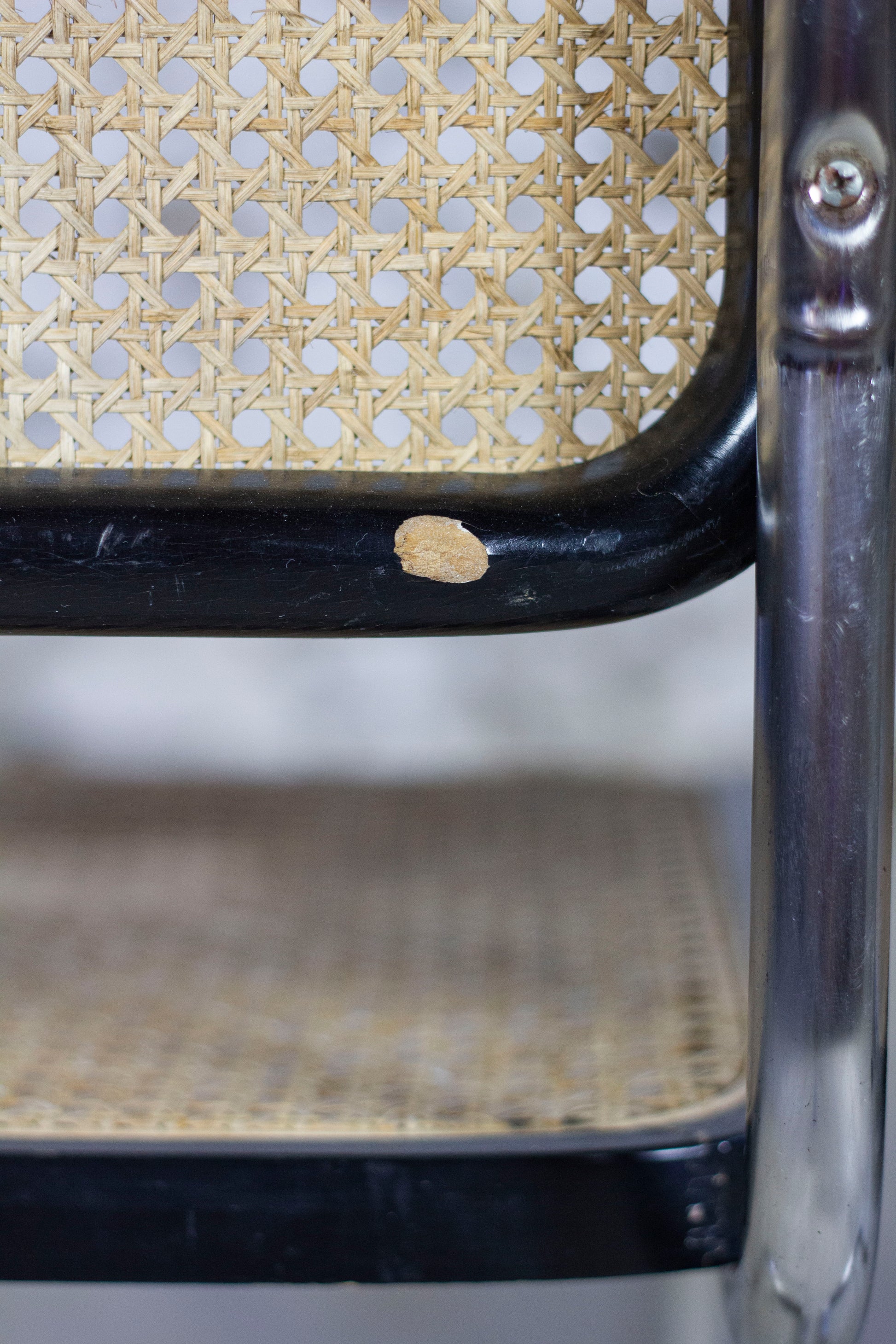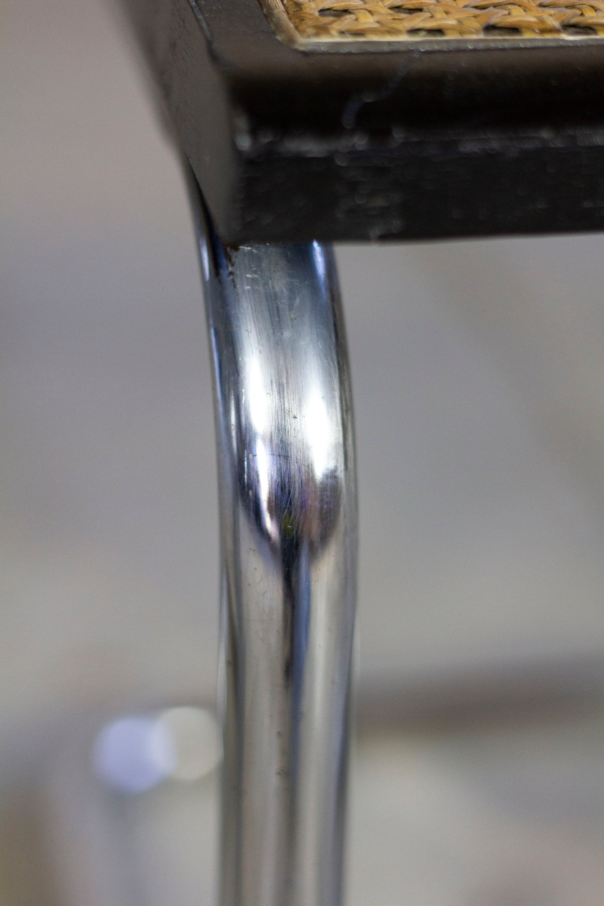 Le cannage ne présente pas de défauts. Le bois a été patiné par le temps et présente quelques usures normales (voir photos). Les chromes sont en bel état. La chaise présente l'estampille "made in italy" au dessous.