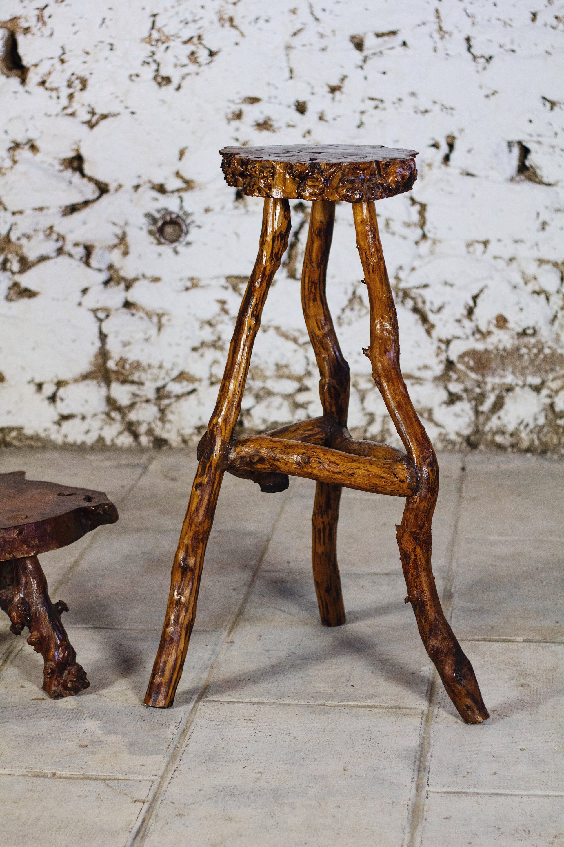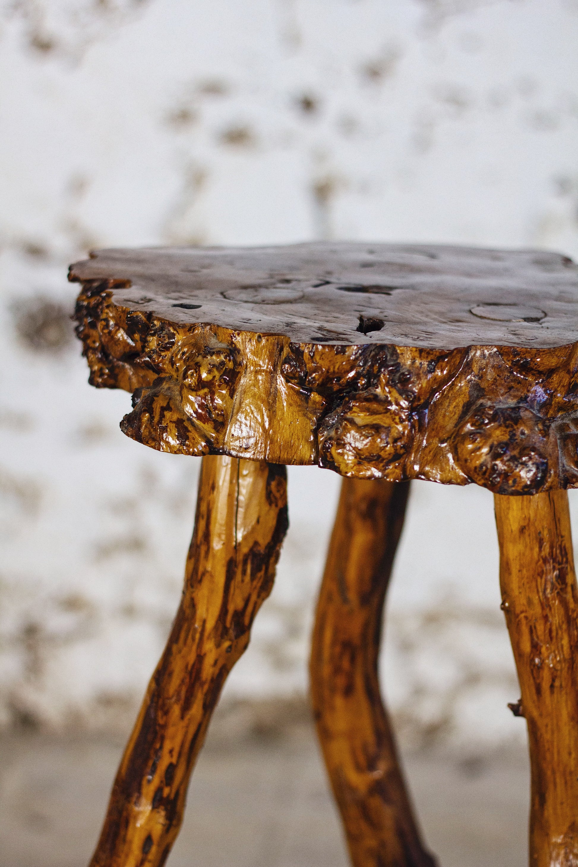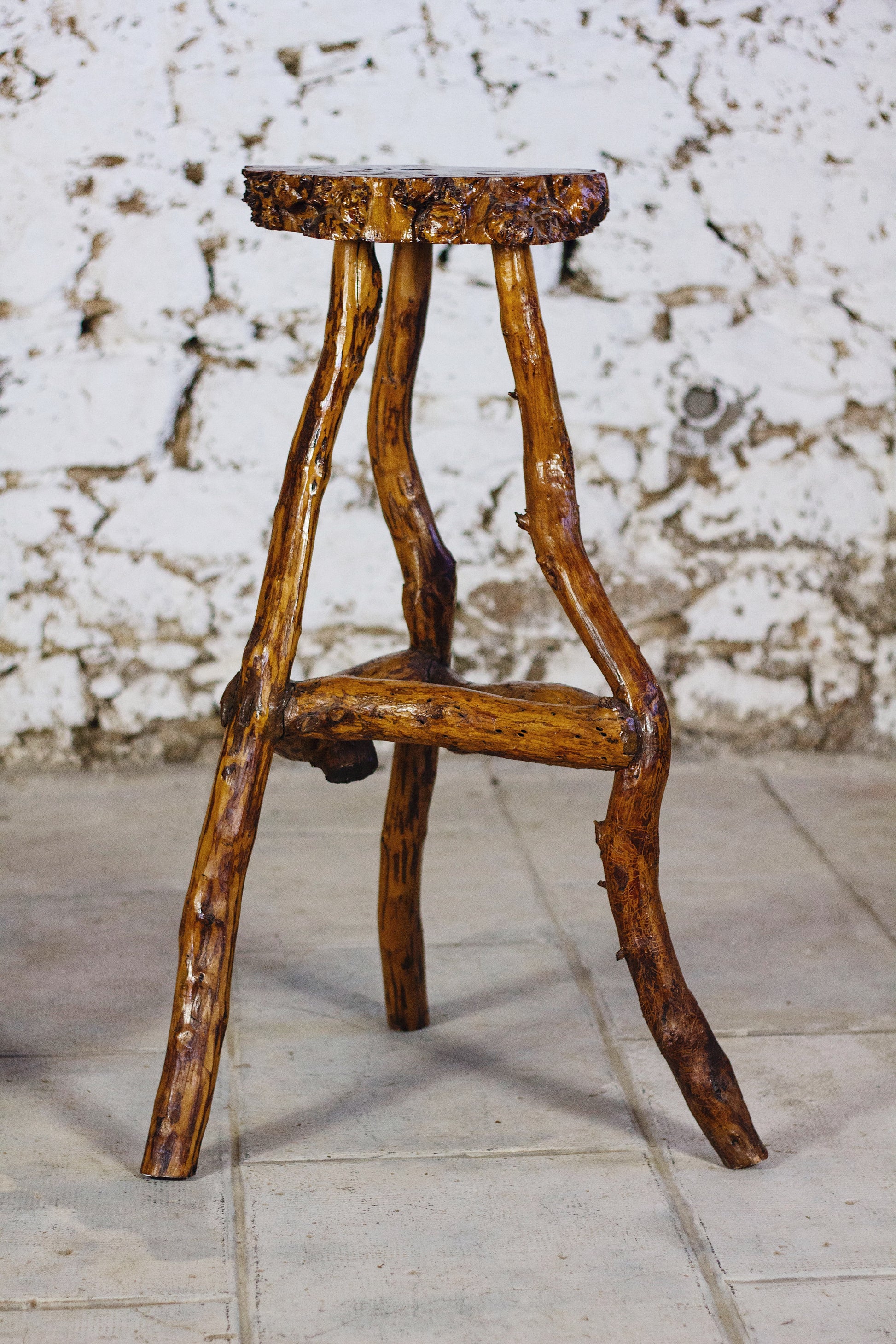 Porte plante réalisé en orme massif. Pied tripode faisant penser à des racines. Très beau détail du bois au niveau de l'assise. Fabrication artisanale des années 60.