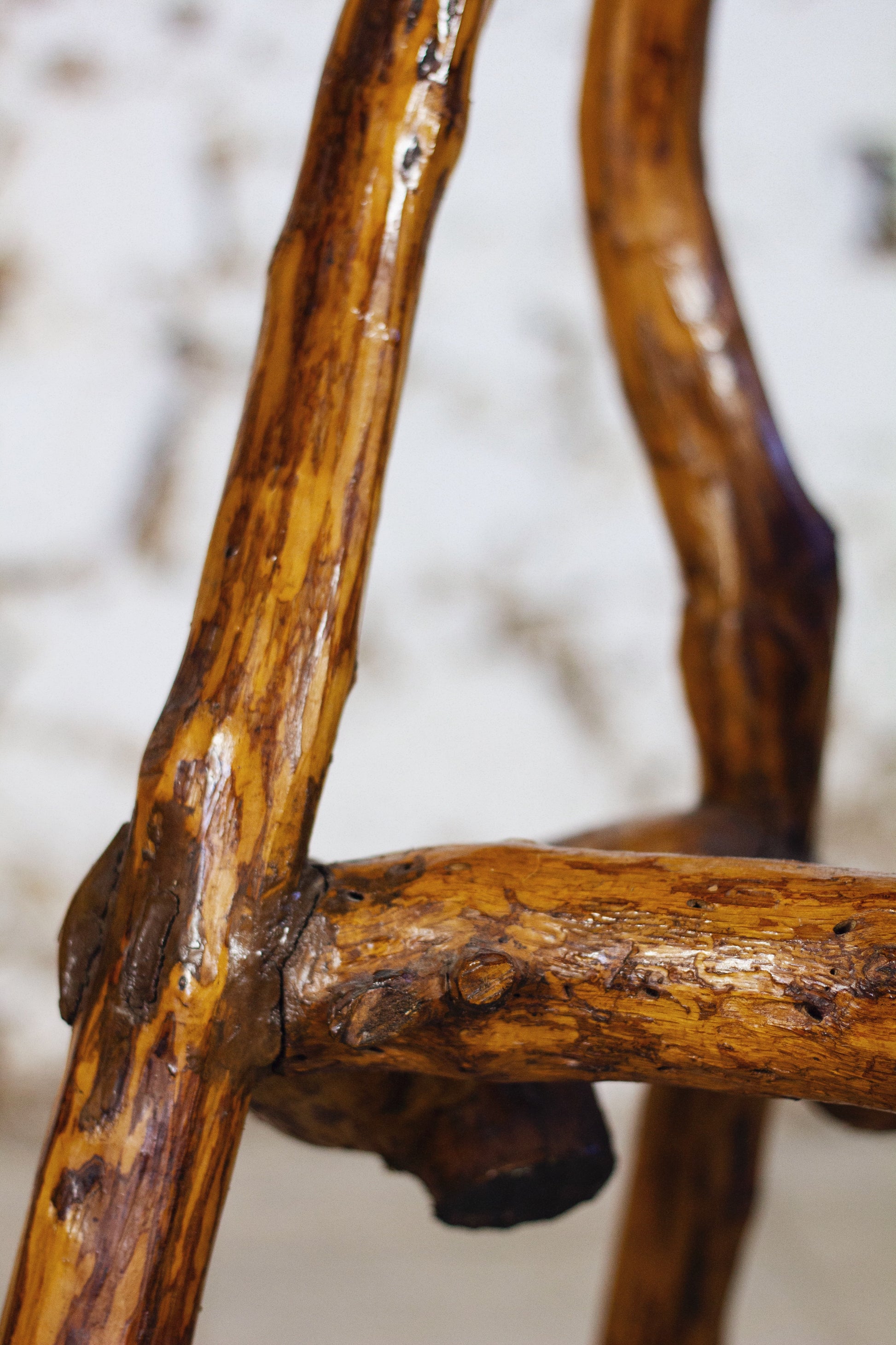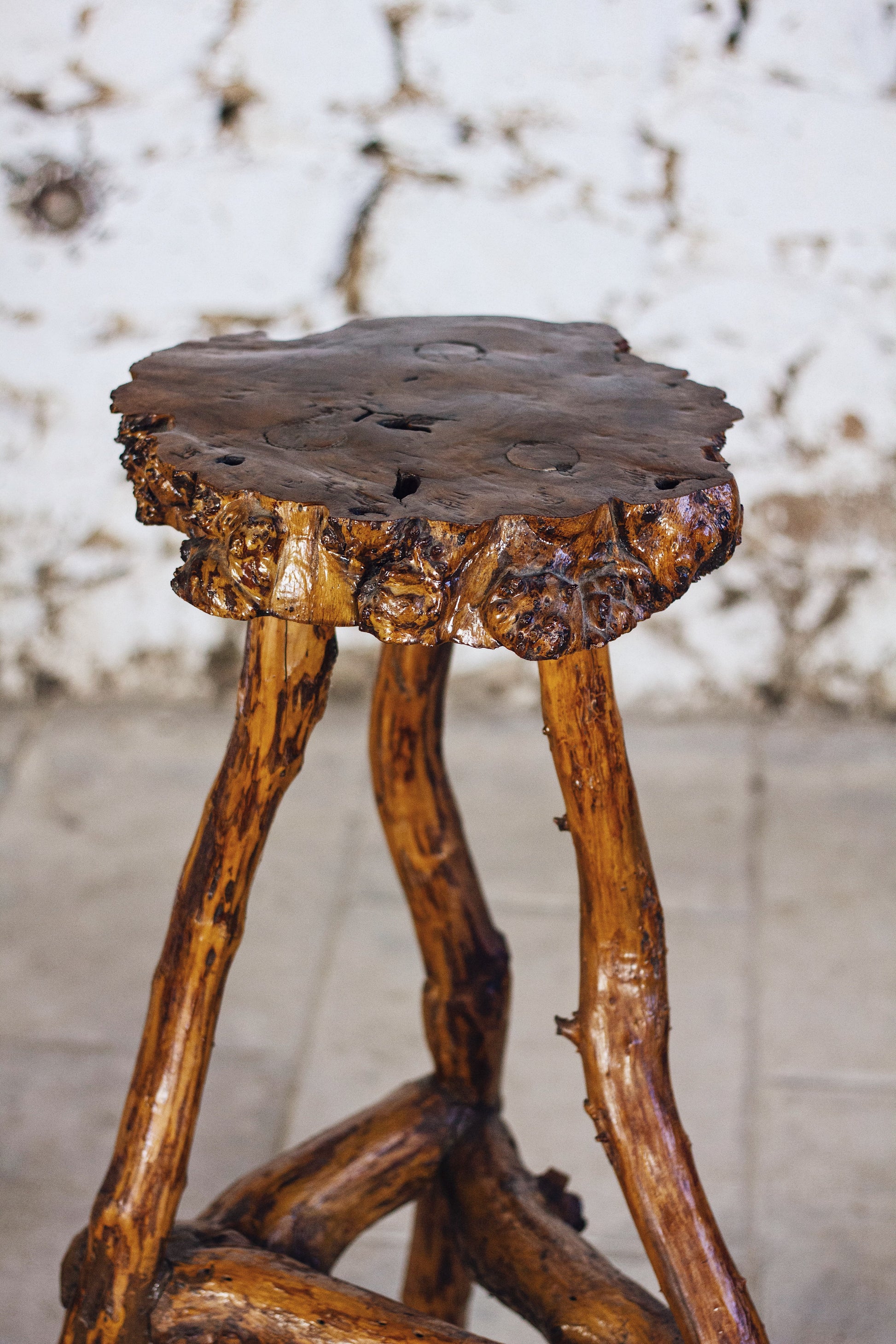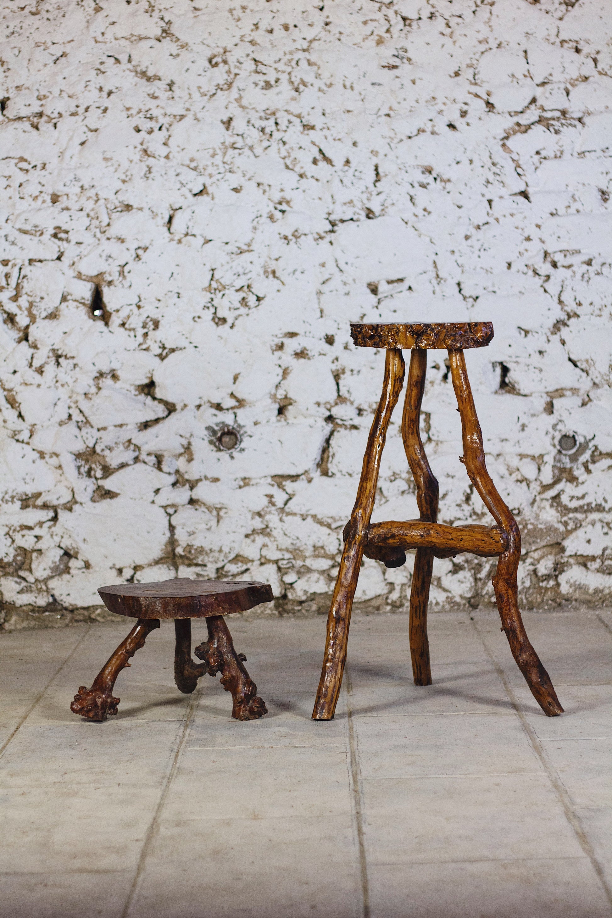 Porte plante réalisé en orme massif. Pied tripode faisant penser à des racines. Très beau détail du bois au niveau de l'assise. Fabrication artisanale des années 60.