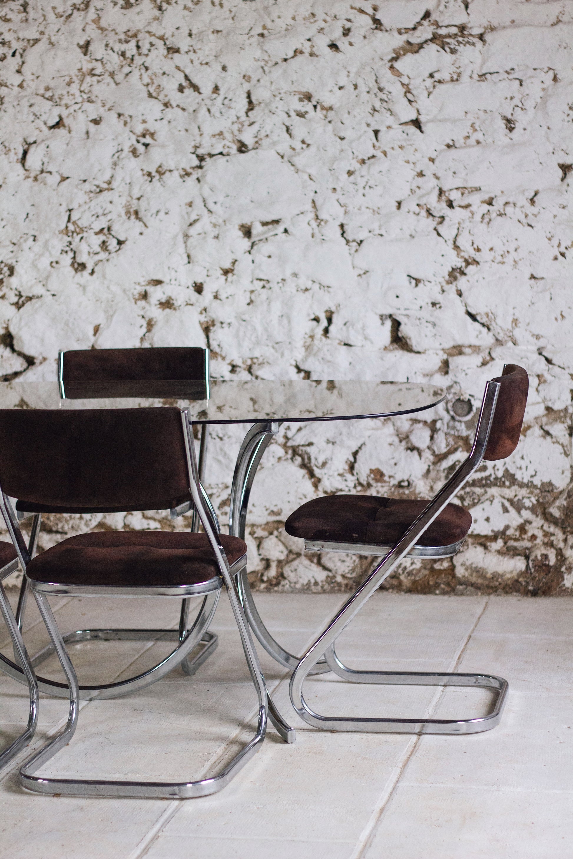 Bel état général. Le piètement est en bon état avec quelques piqures du chrome à signaler, notamment au niveau de l'un des embranchements (voir photos). Le verre présente un impact sur le bord du plateau (voir photos) mais ne présente pas de rayures.