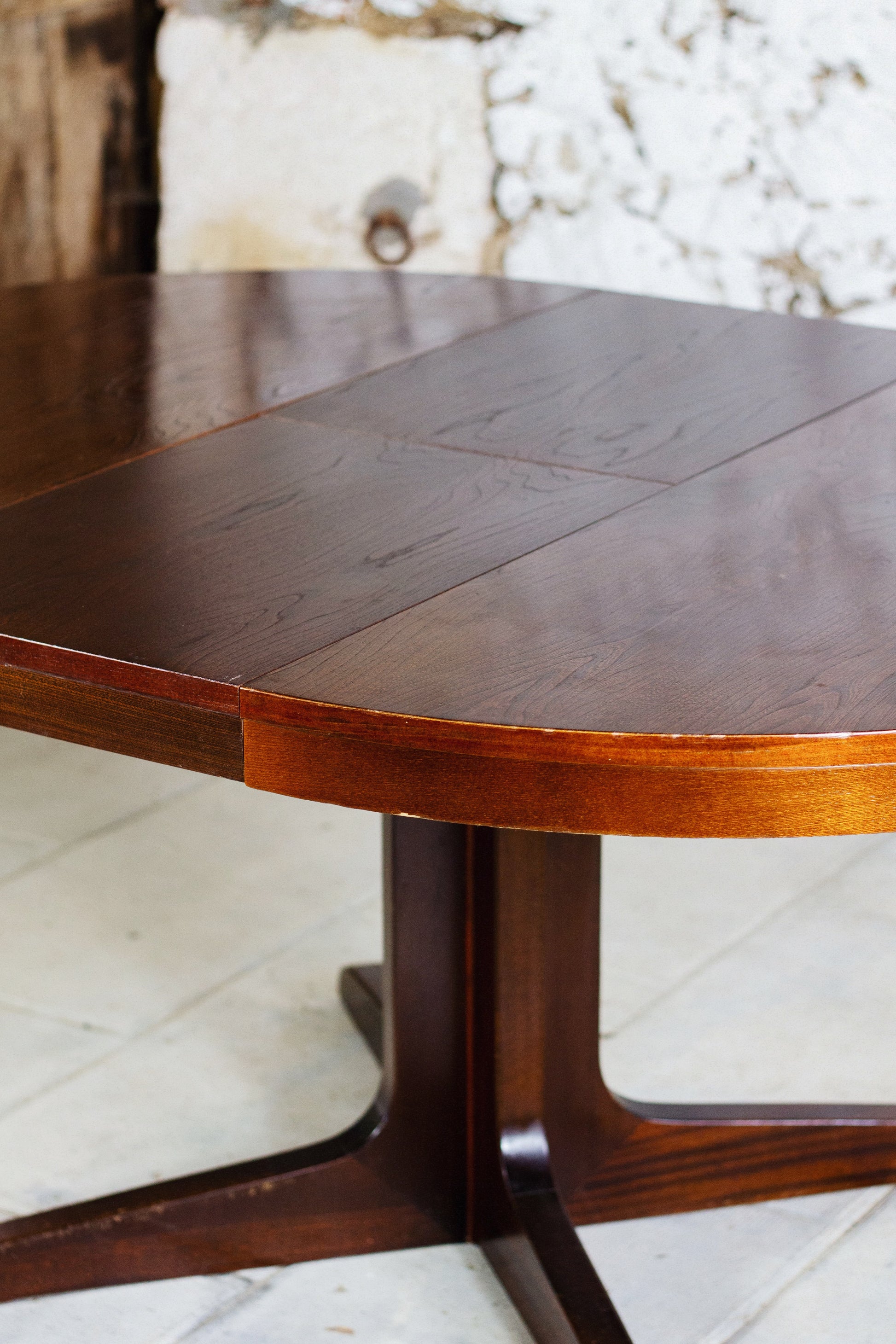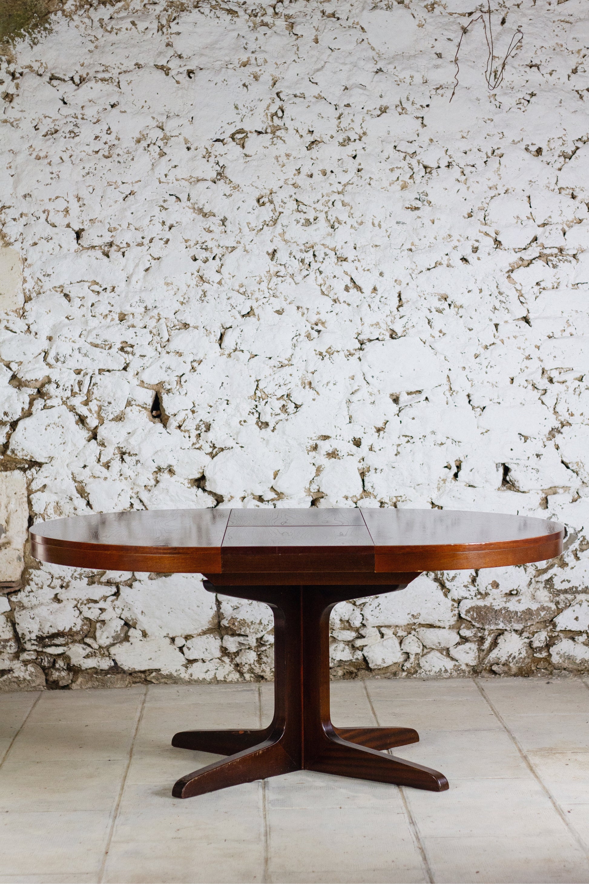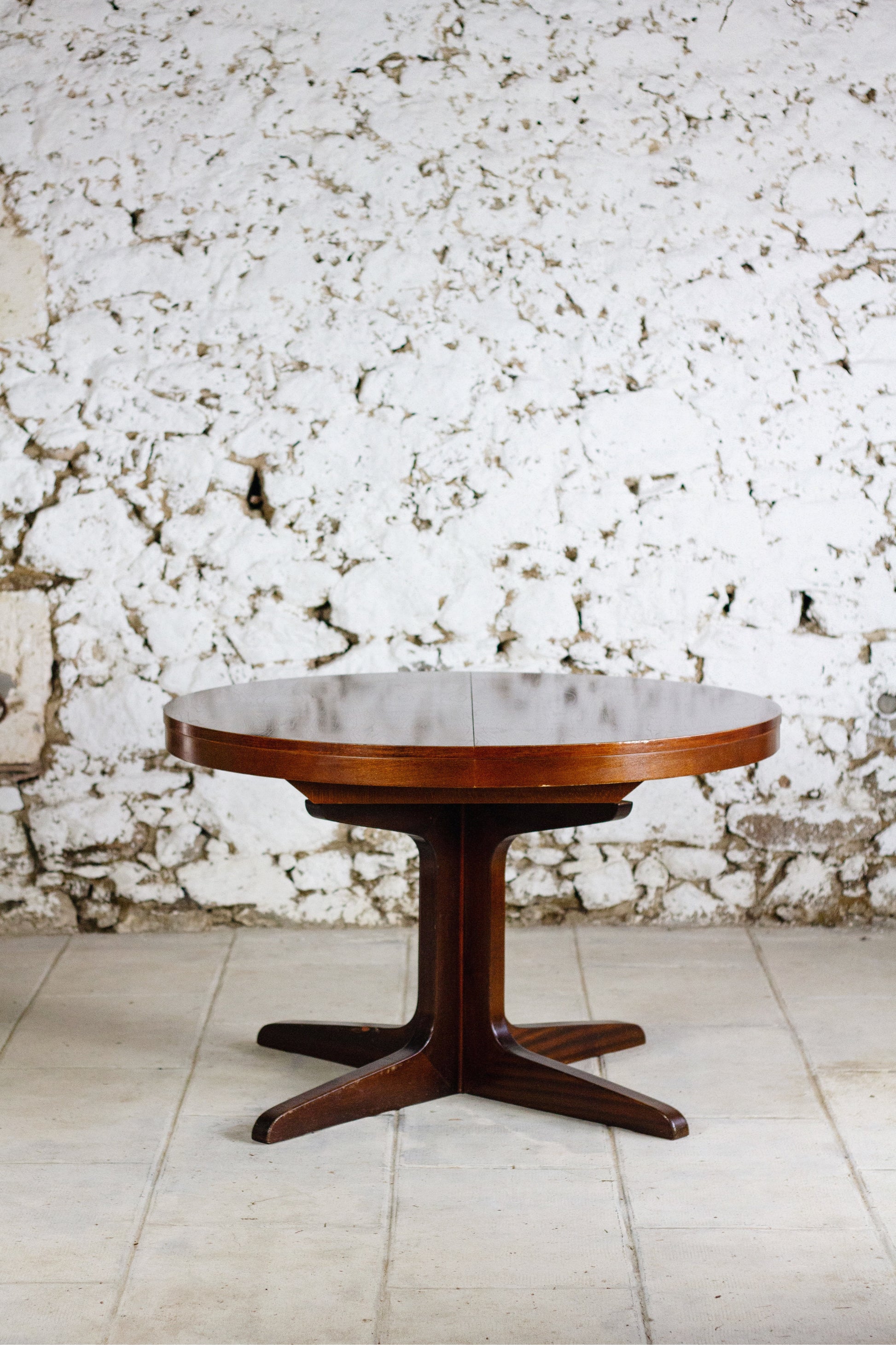 Table ronde de salle à manger extensible de la maison baumann, éditée dans les années 1960-70. Dotée d'un pied central, elle est extensible (rallonge de 38 cm) et dispose d'un système de rallonge papillon escamotable fonctionnant parfaitement, lequel est intégré dans son piétement étoile. Le bois de cette table présente un très joli veinage.
